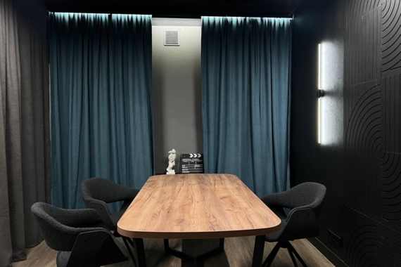 Студия «Индиго» — просторная подкаст студия для записи видео и интервью площадью 32 м². Здесь могут комфортно разместиться до 8 человек, поэтому студия идеально подходит для групповых подкастов, дискуссий, интервью и видеошоу. Интерьер с глубокими оттенками создаёт выразительную визуальную атмосферу для записи контента. Аренда студии начинается от 1200 ₽ в час.