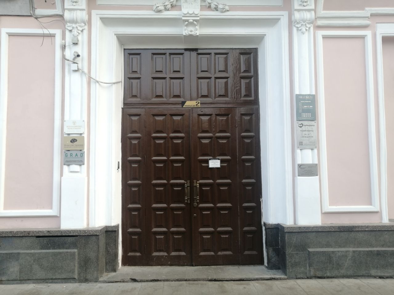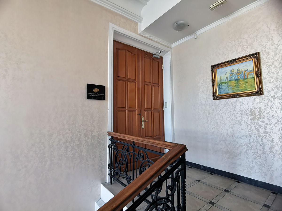 Так выглядит дверь в подъезд. Сразу на входе сидит охранник. Скажите, что вы в «Искусство гармонии» и поднимитесь на 4-й этаж.