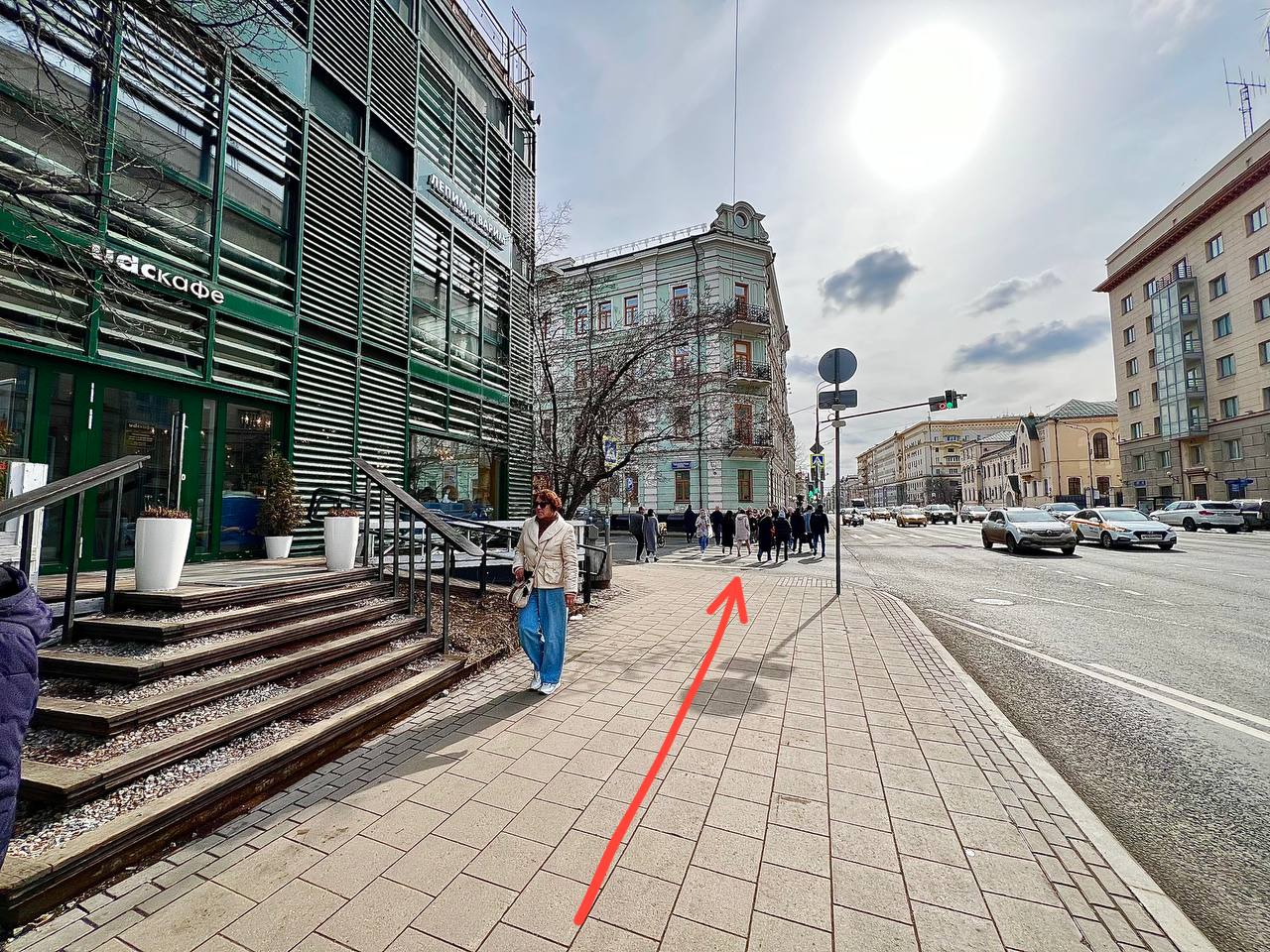Идем прямо, никуда не сворачиваем, проходим «Аптекарский огород» и переходим через перекрёсток со светофором, и продолжаем идти прямо