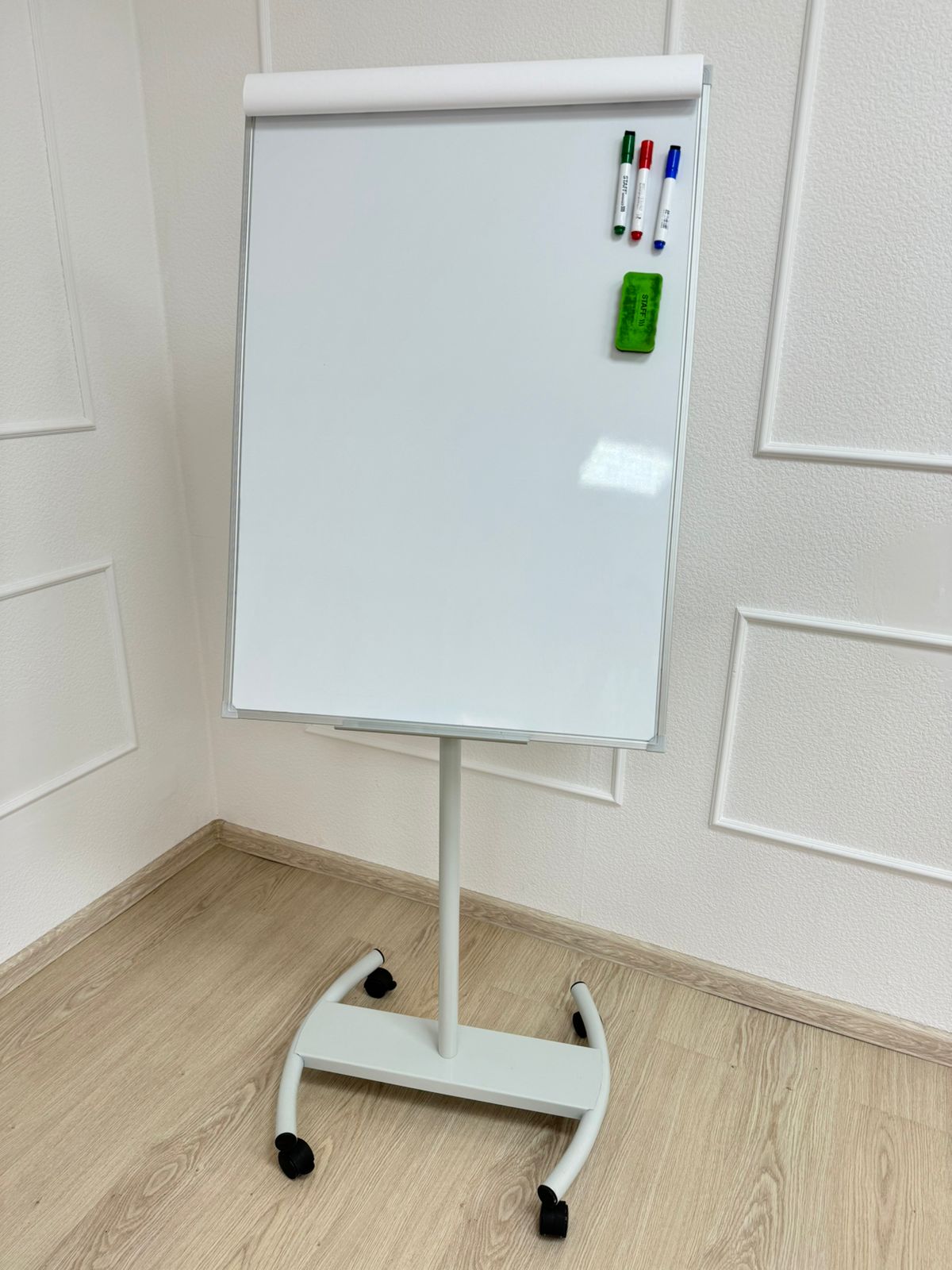 Флипчарт размером 70х100 на роликах с магнитно—маркерным покрытием.