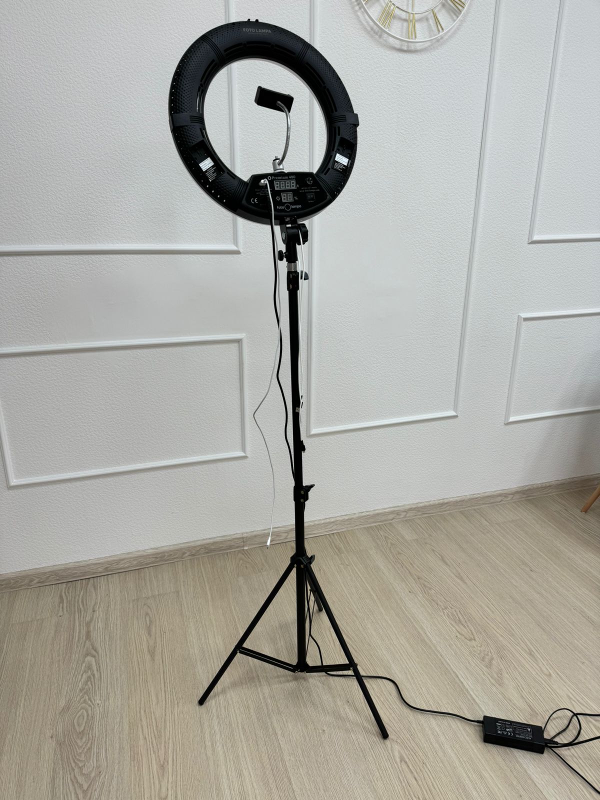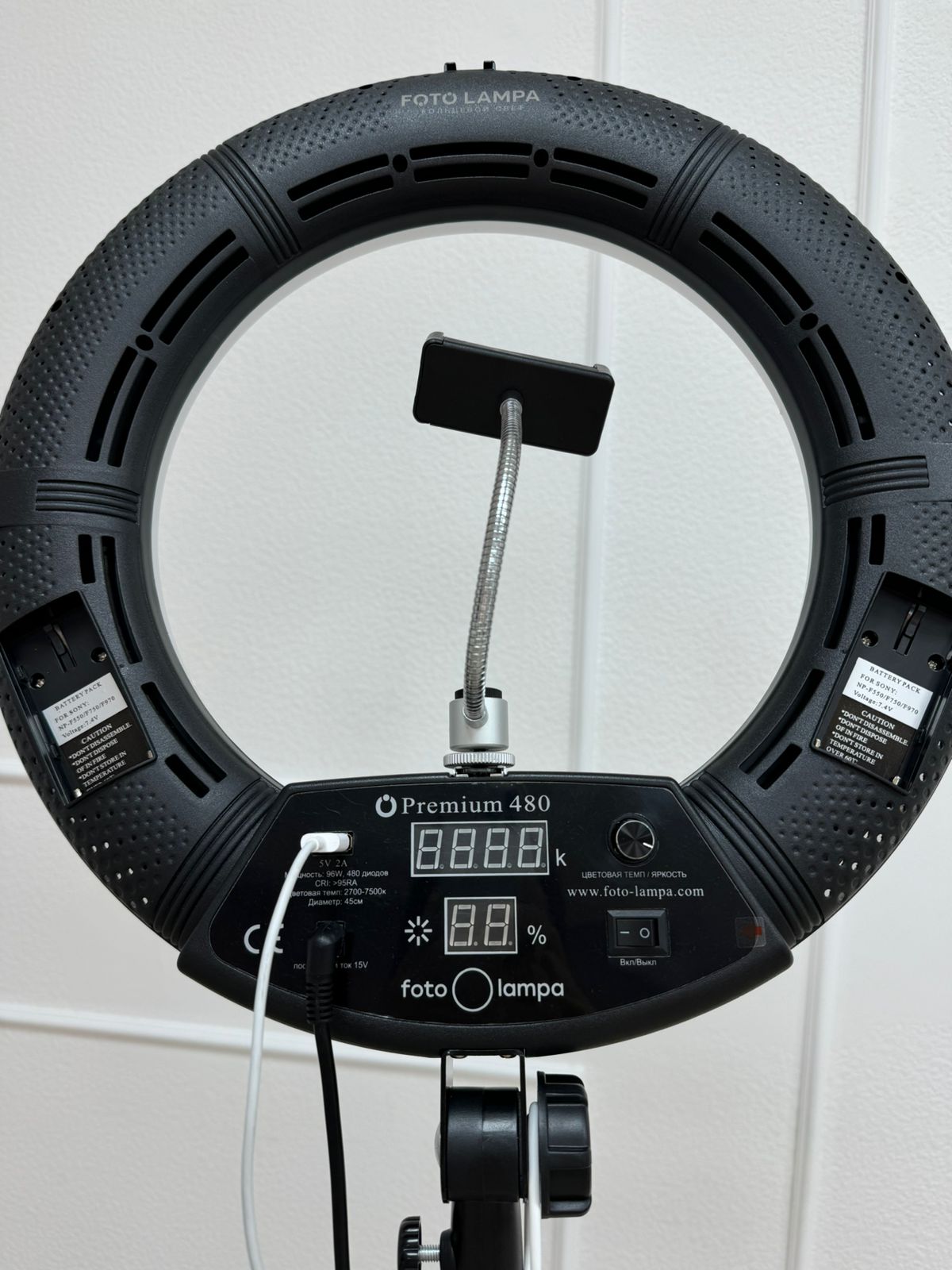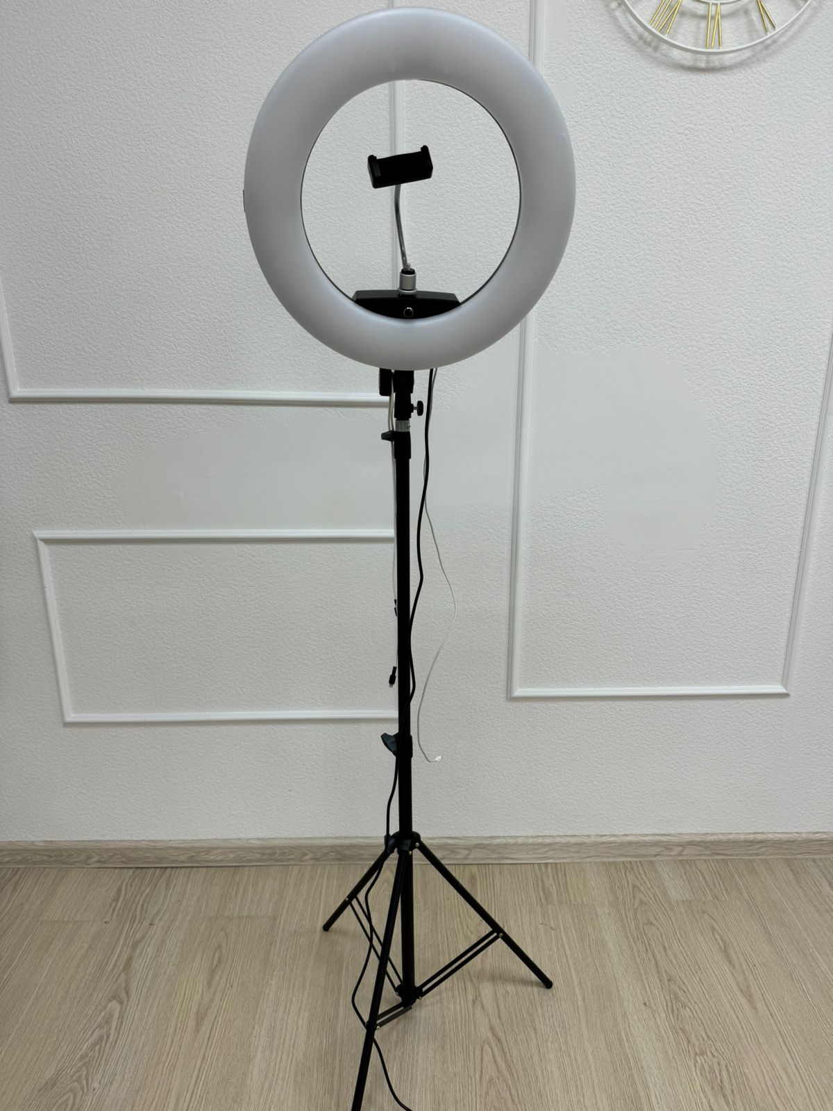 Светодиодная кольцевая лампа для фото и видео съемки на штативе.