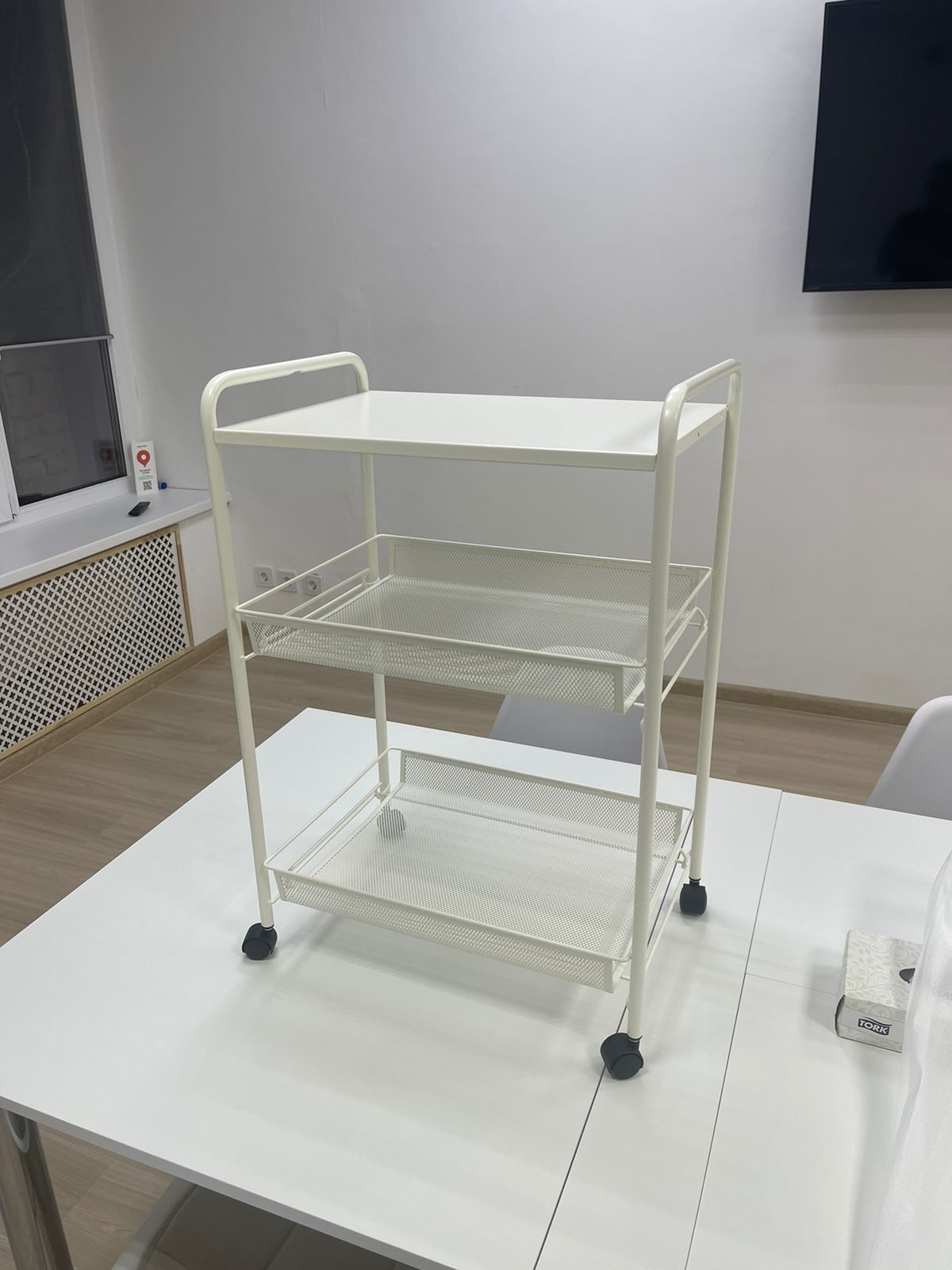 Этажерка металлическая на колесиках со столешницей для косметологов.
