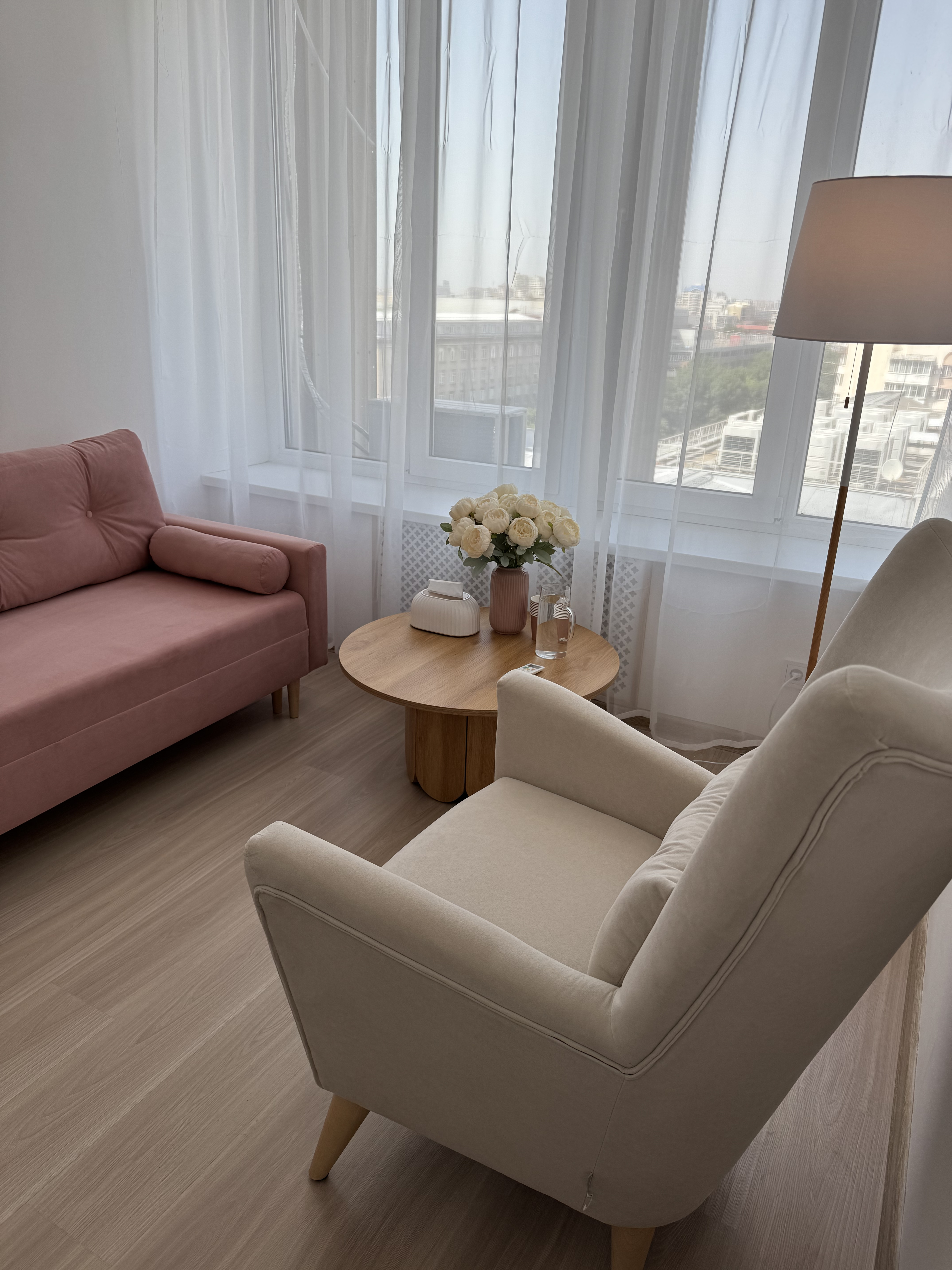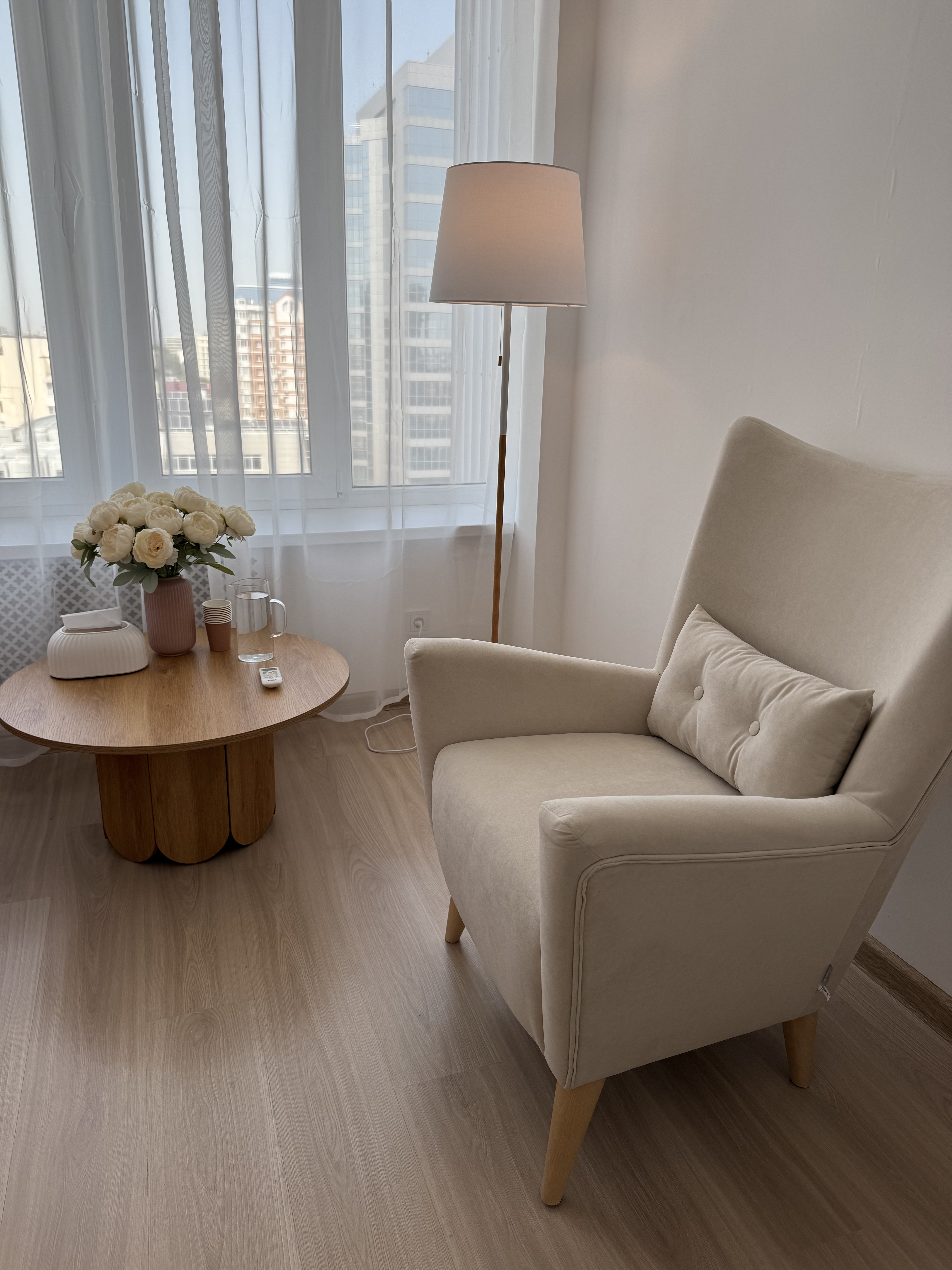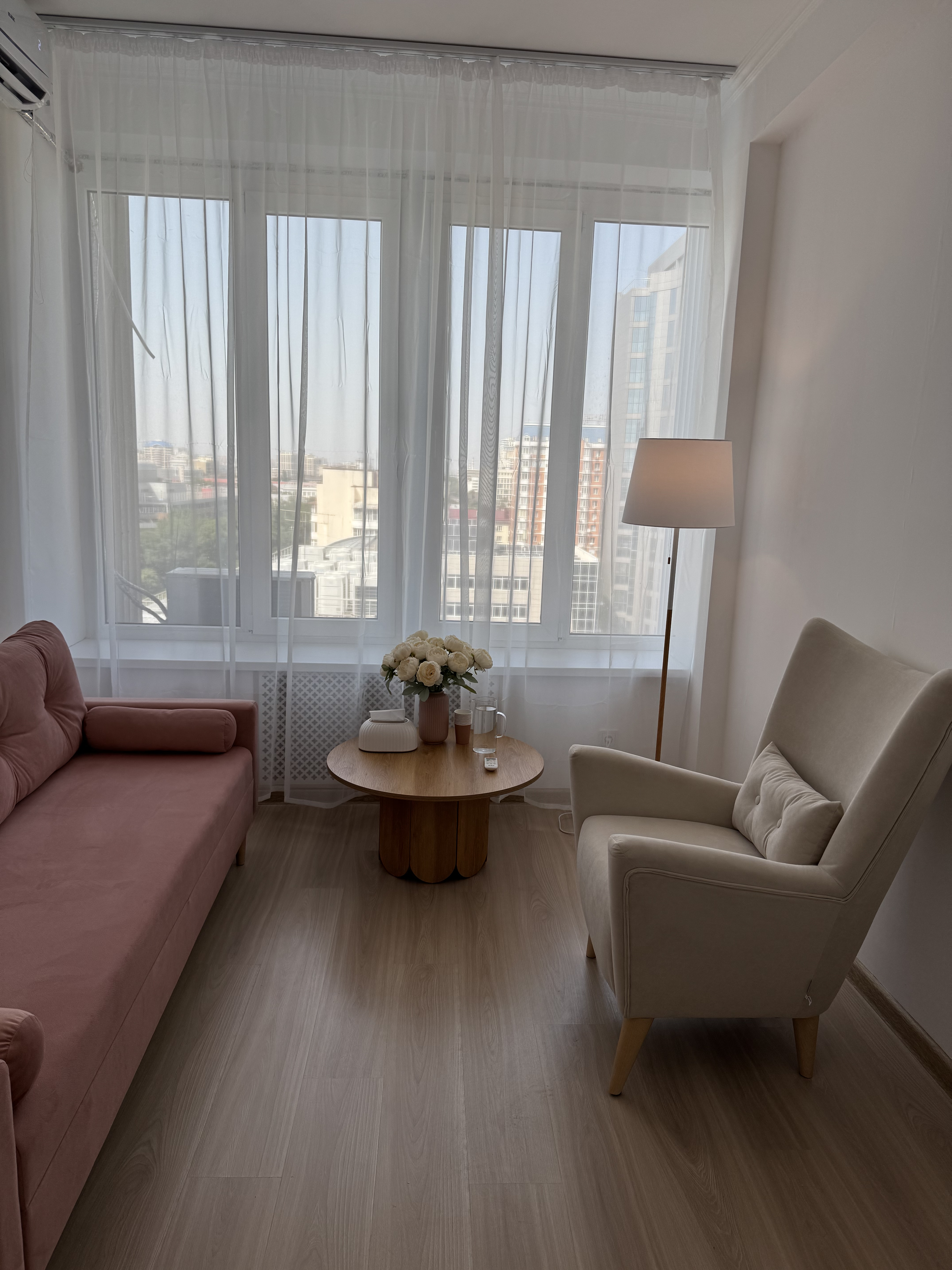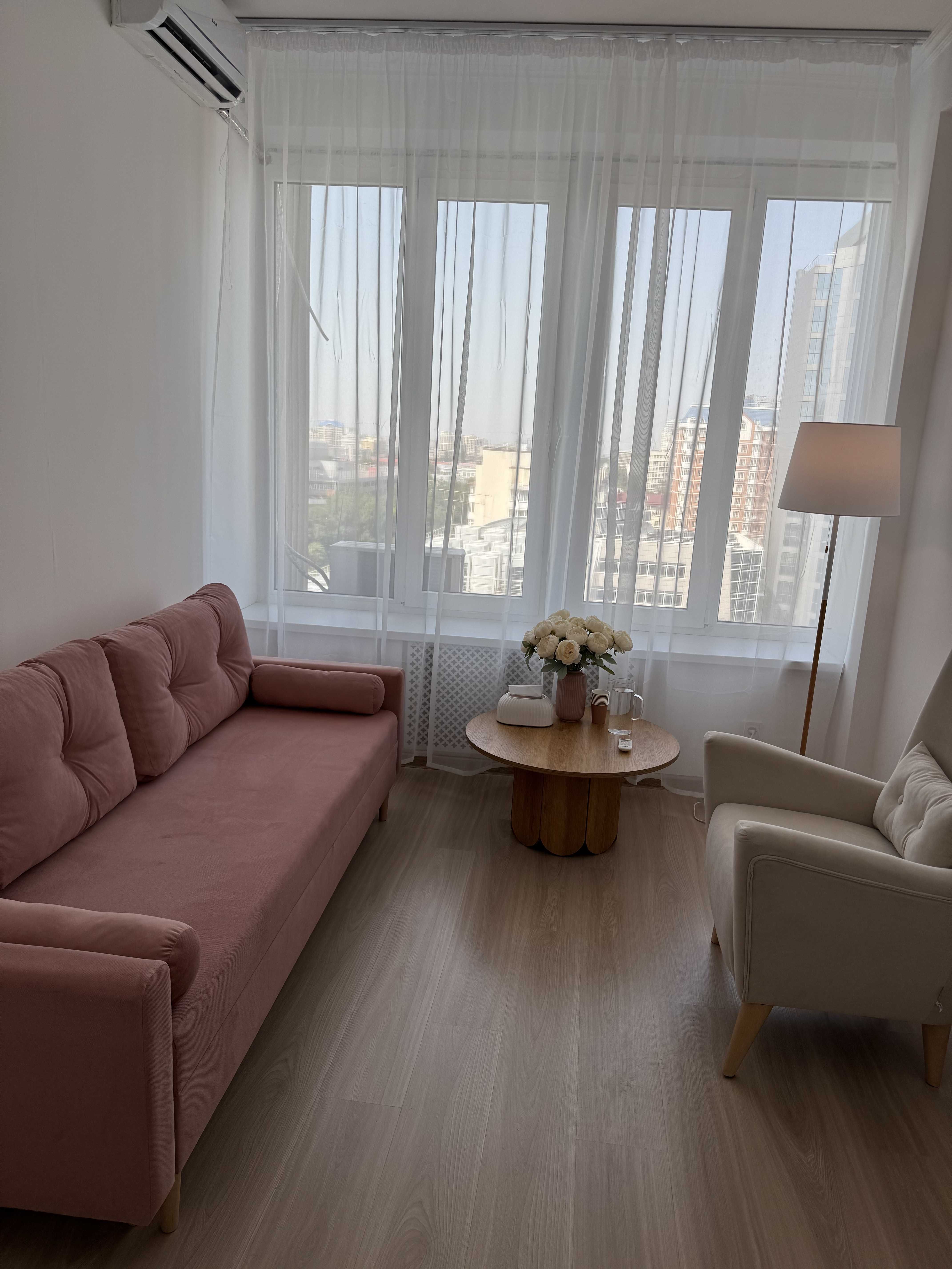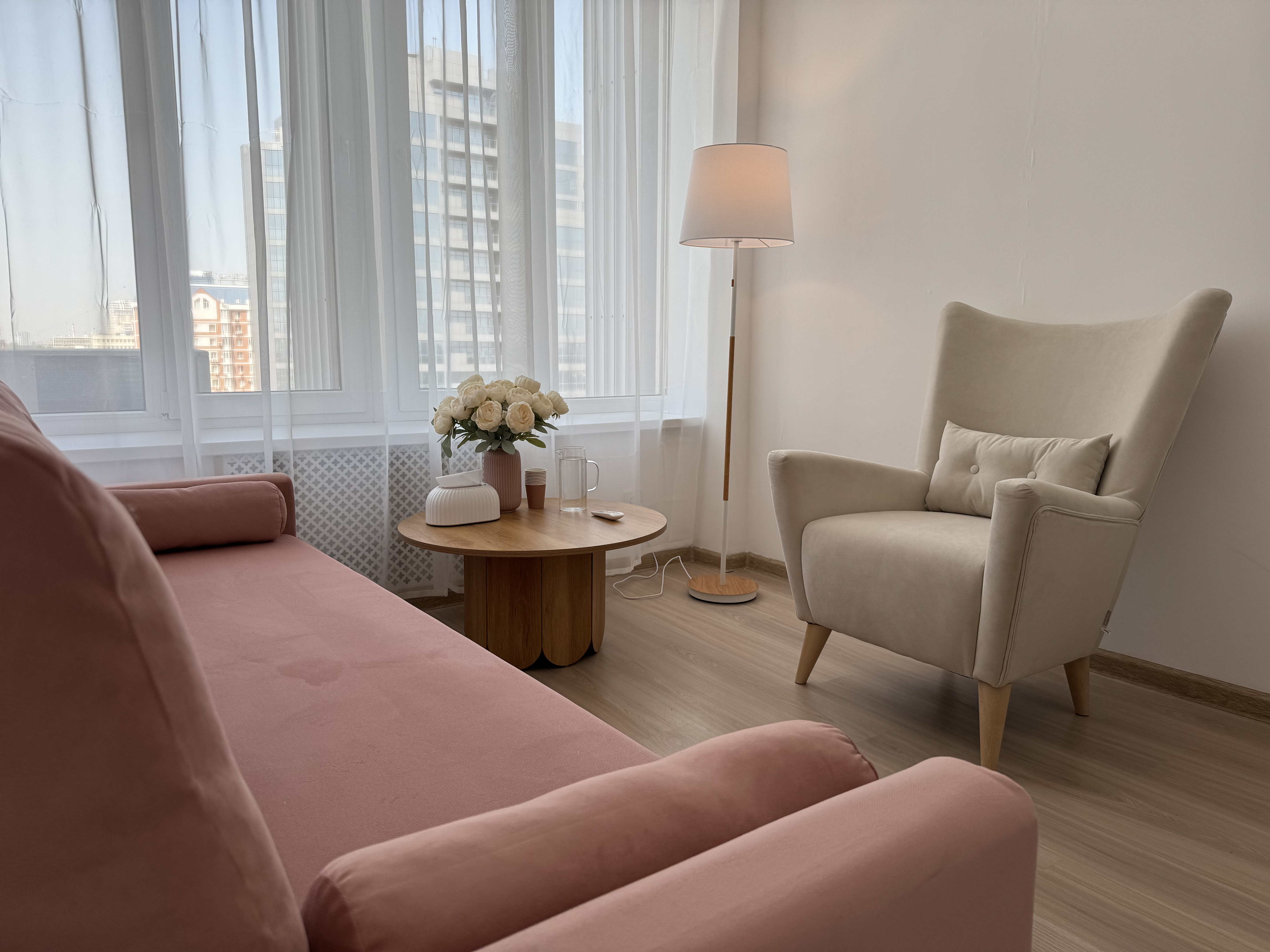 Светлый уютный кабинет. Выполнен в нежных и лёгких оттенках. Оборудован комфортным 3-х местным диваном и креслом. Хорошо подходит для проведения оффлайн и онлайн консультаций, гипнотерапии, проведения эфиров, съемок и можно просто работать с великолепным видом на город.
