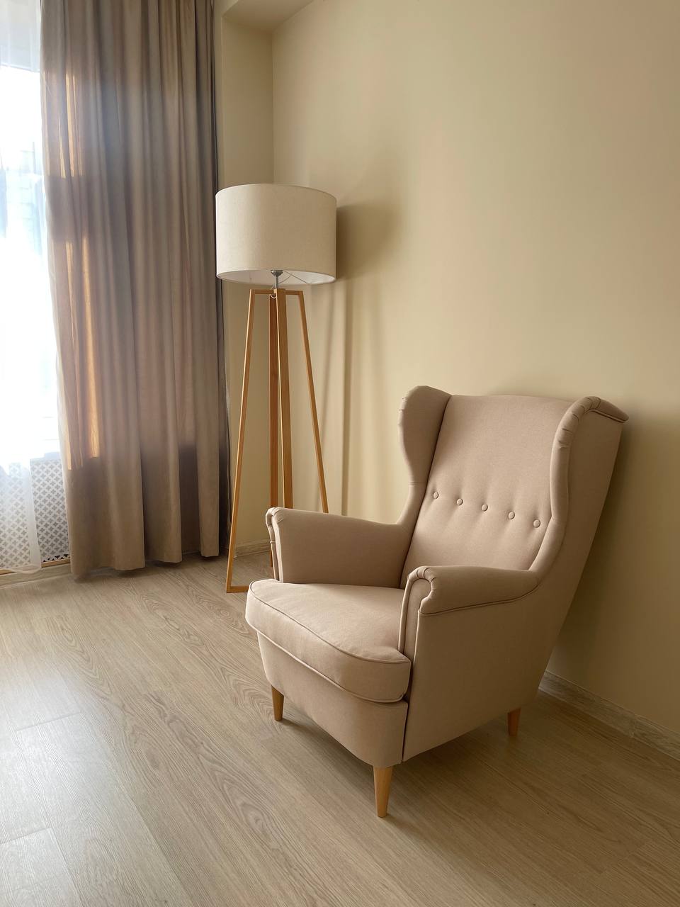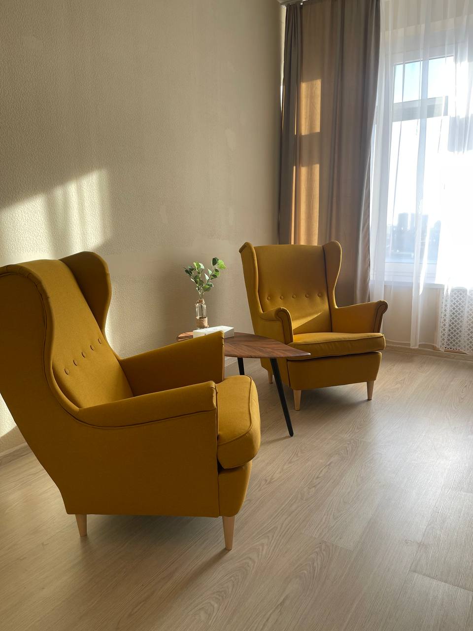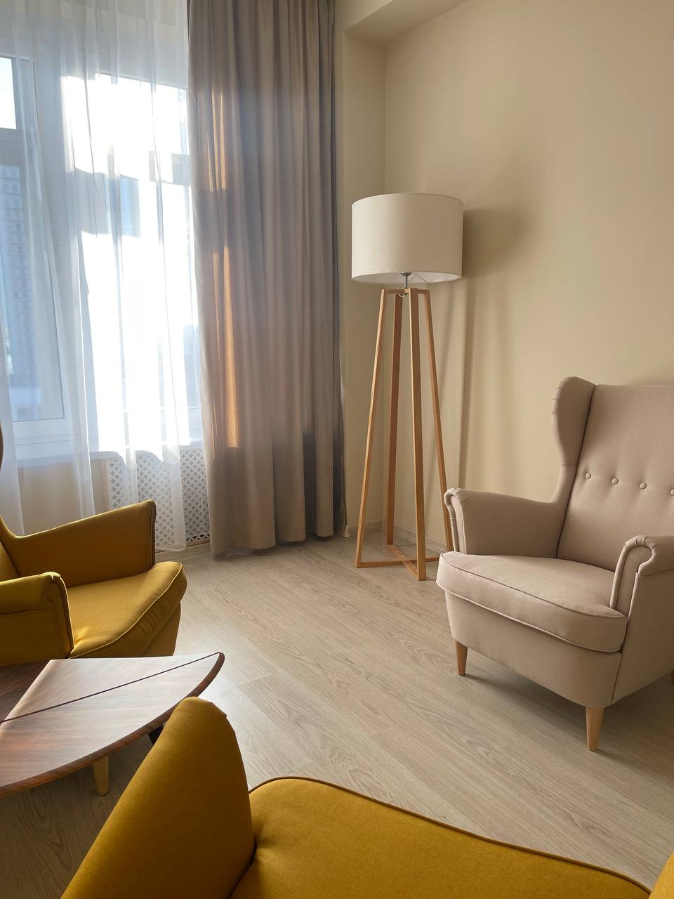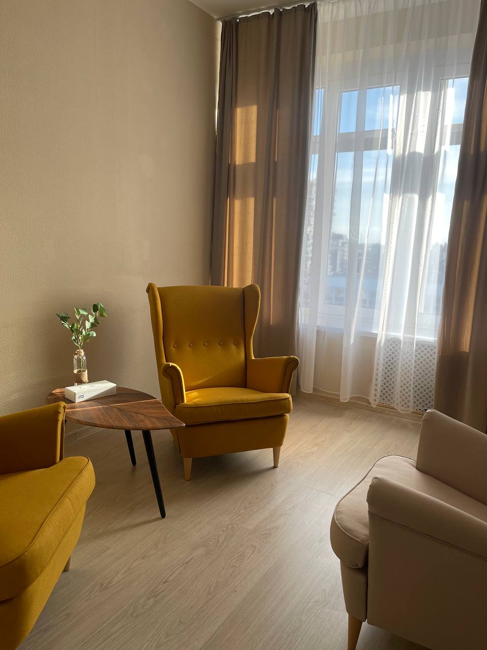 Кабинет предназначен для проведения индивидуальных консультаций или семейной терапии. Оснащен 3 креслами, журнальным столиком и торшером. По запросу в кабинет можно принести стул для одного человека (не более 4-х человек). В кабинете большое панорамное окно с видом на центр города.