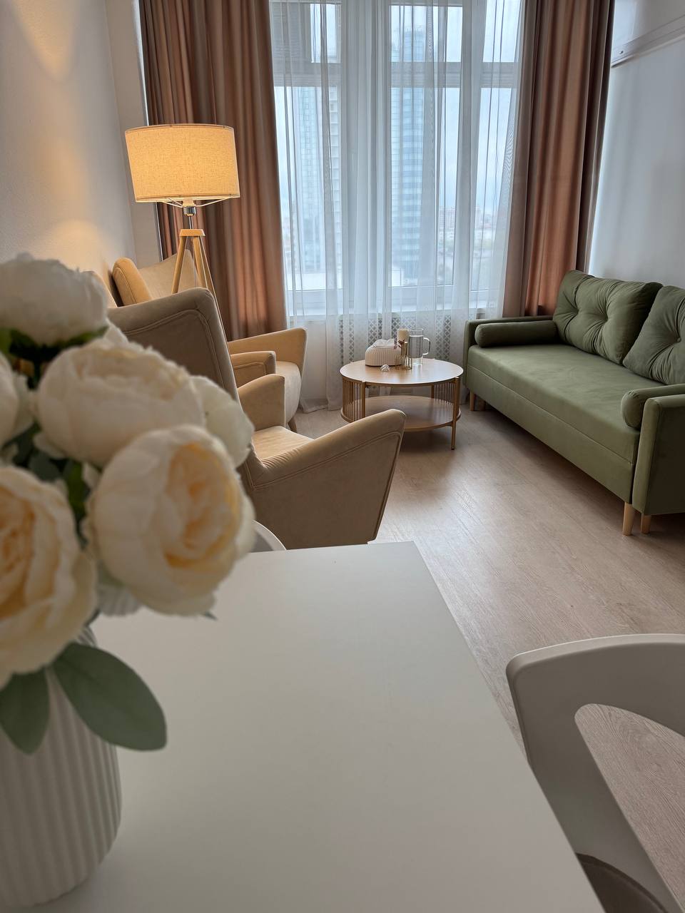 В кабинете большое панорамное окно с видом на центральную часть города.