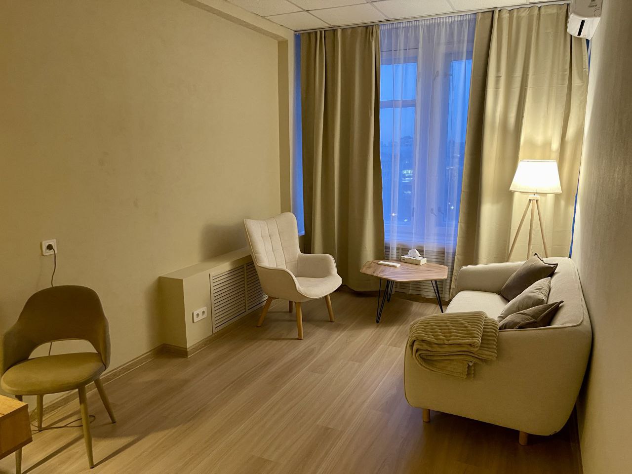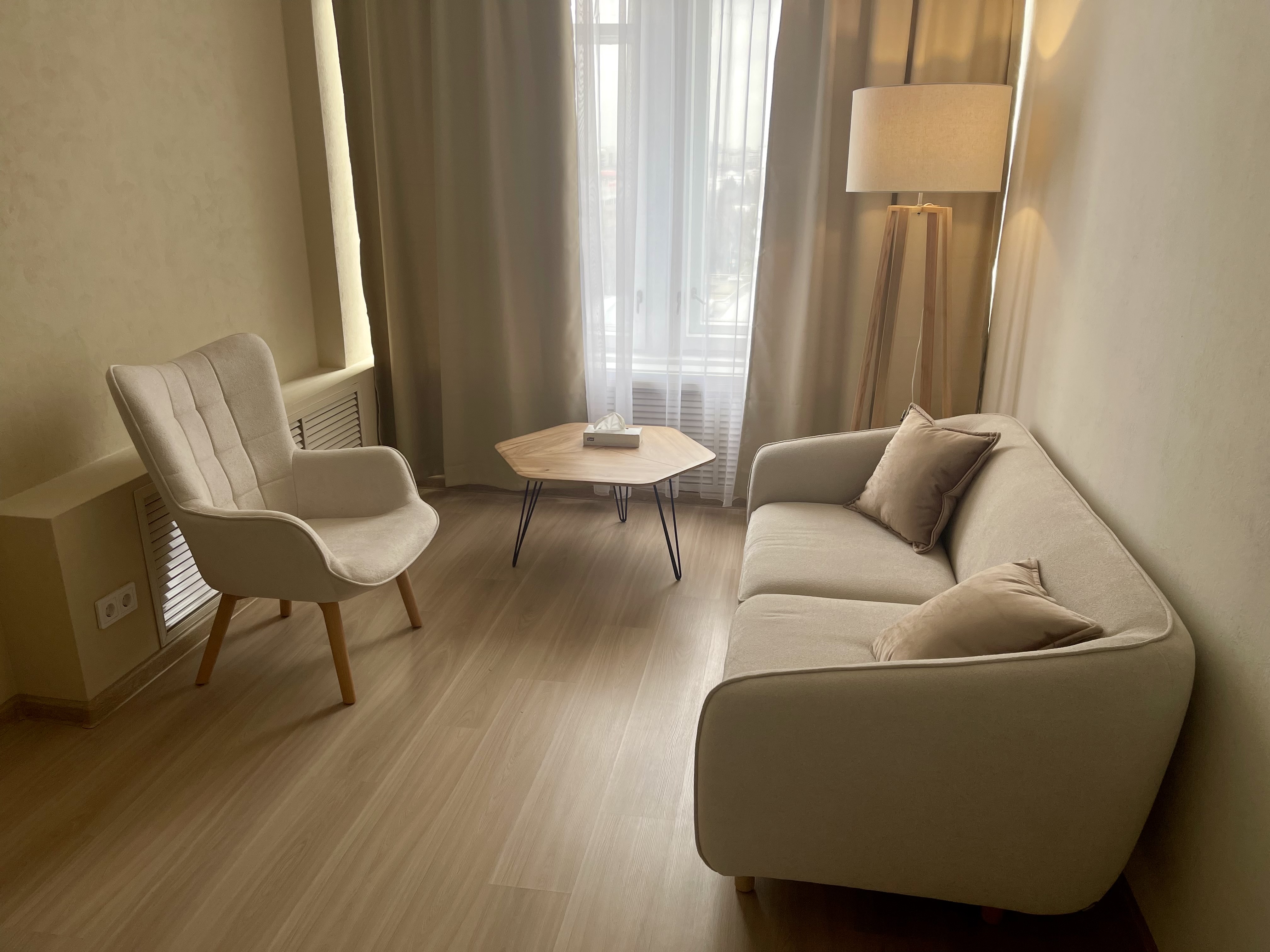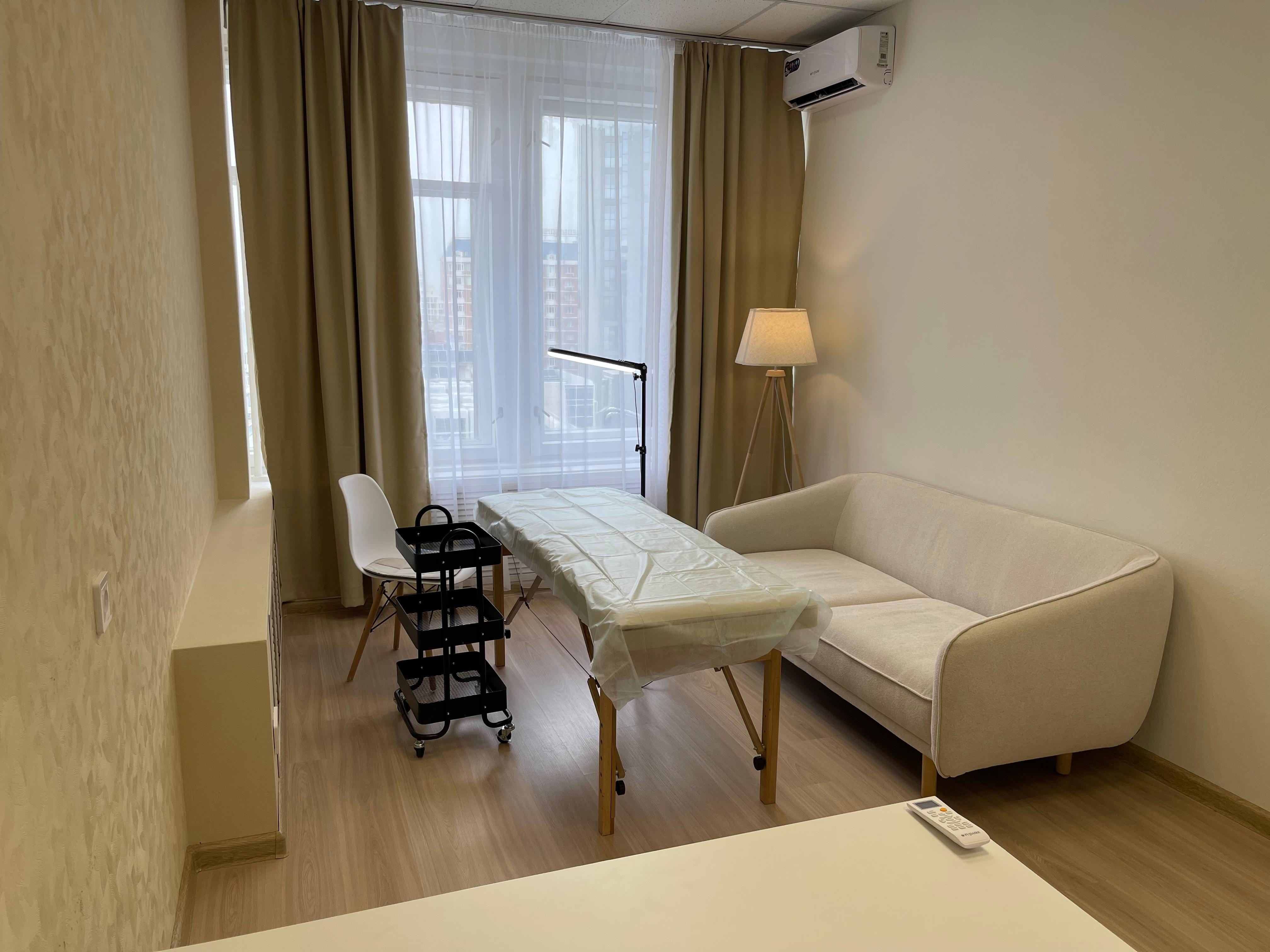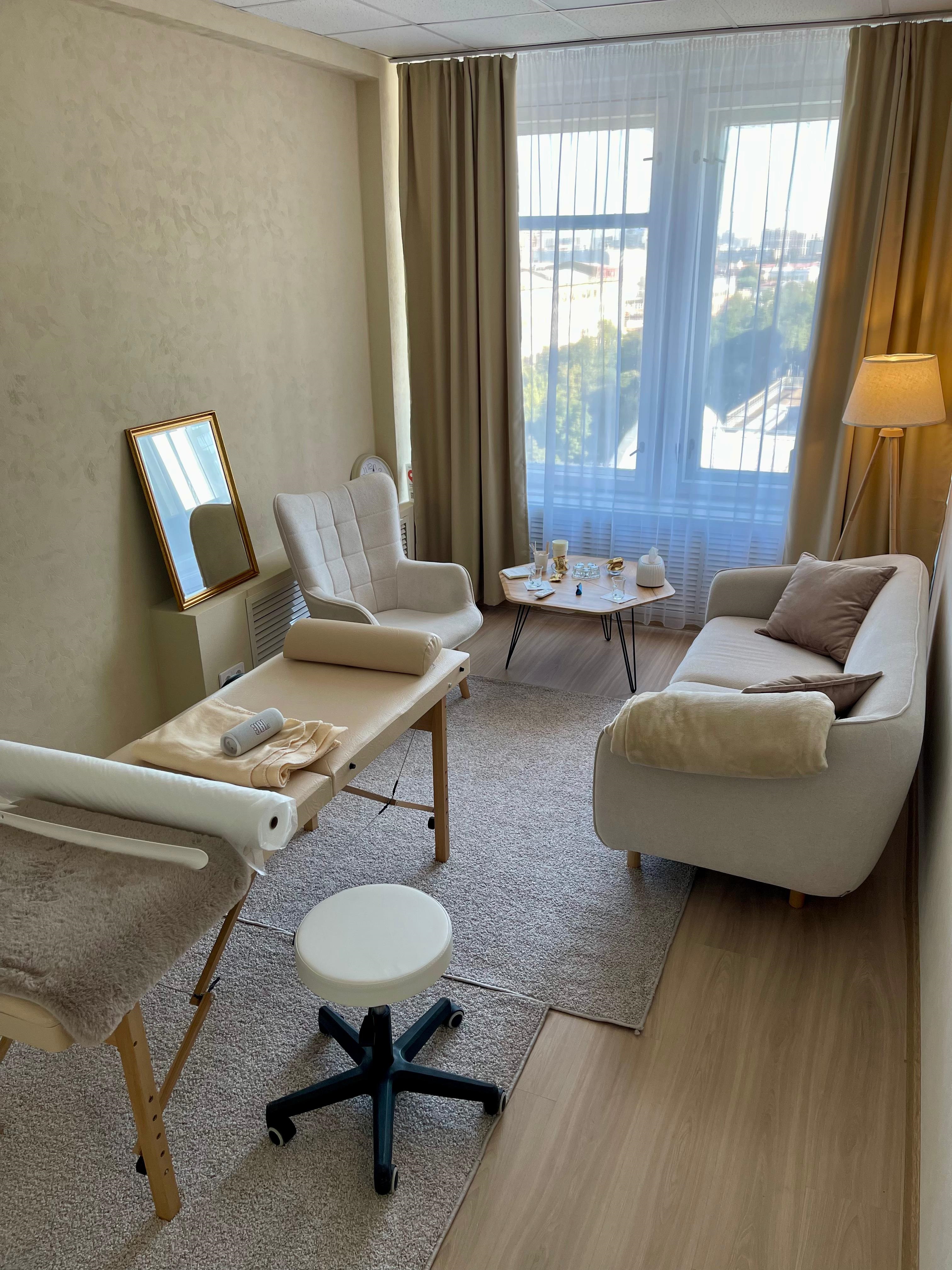 Кабинет находится в дальней части офиса. Очень тихий. Оборудован утопающим диваном повышенной комфортности, креслом, письменным столом, за которым можно проводить вебинары и видеоконференции, снимать экспертный контент и просто работать с великолепным видом на город. Хорошо подходит для проведения оффлайн и онлайн консультаций, гипнотерапии, проведения эфиров, записи рилс и сторис, а также индивидуальной работы в тихой, приятной обстановке.