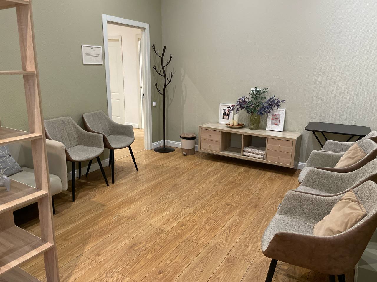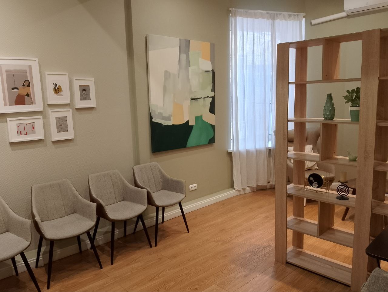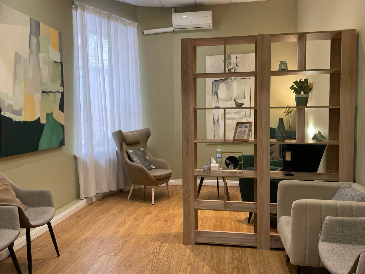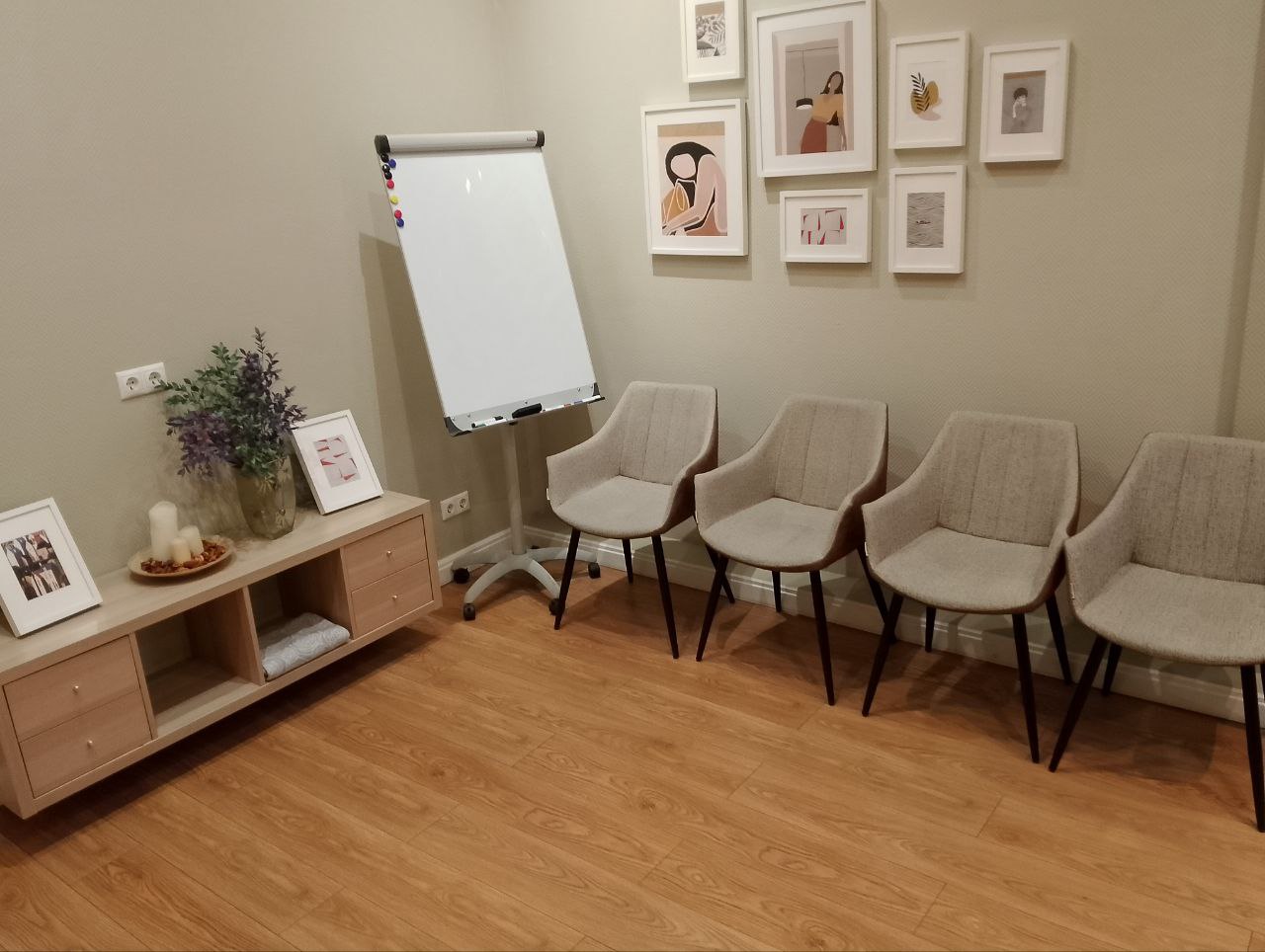 Преимущества нашего кабинета «Кремовый»: Зал трансформер идеально подходит для индивидуальных, семейных консультаций, а так же для работы с группой до 8 человек. Зал трансформер — это значит можно увеличить пространство, если передвинуть стеллаж-перегородку.