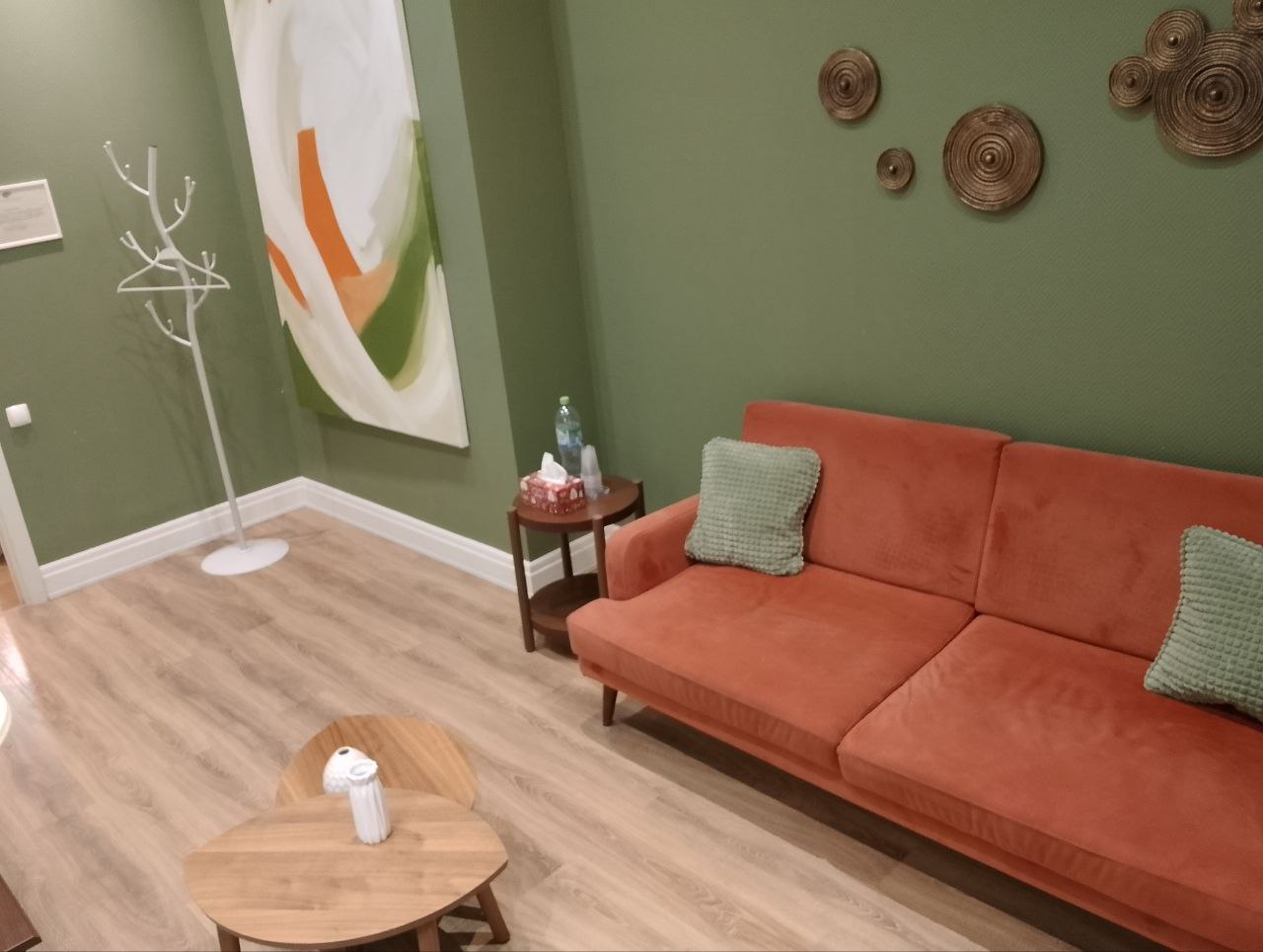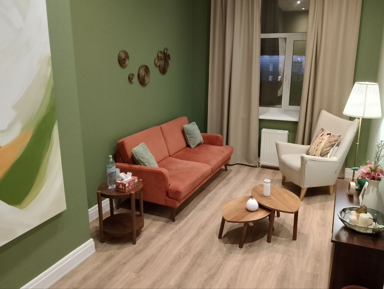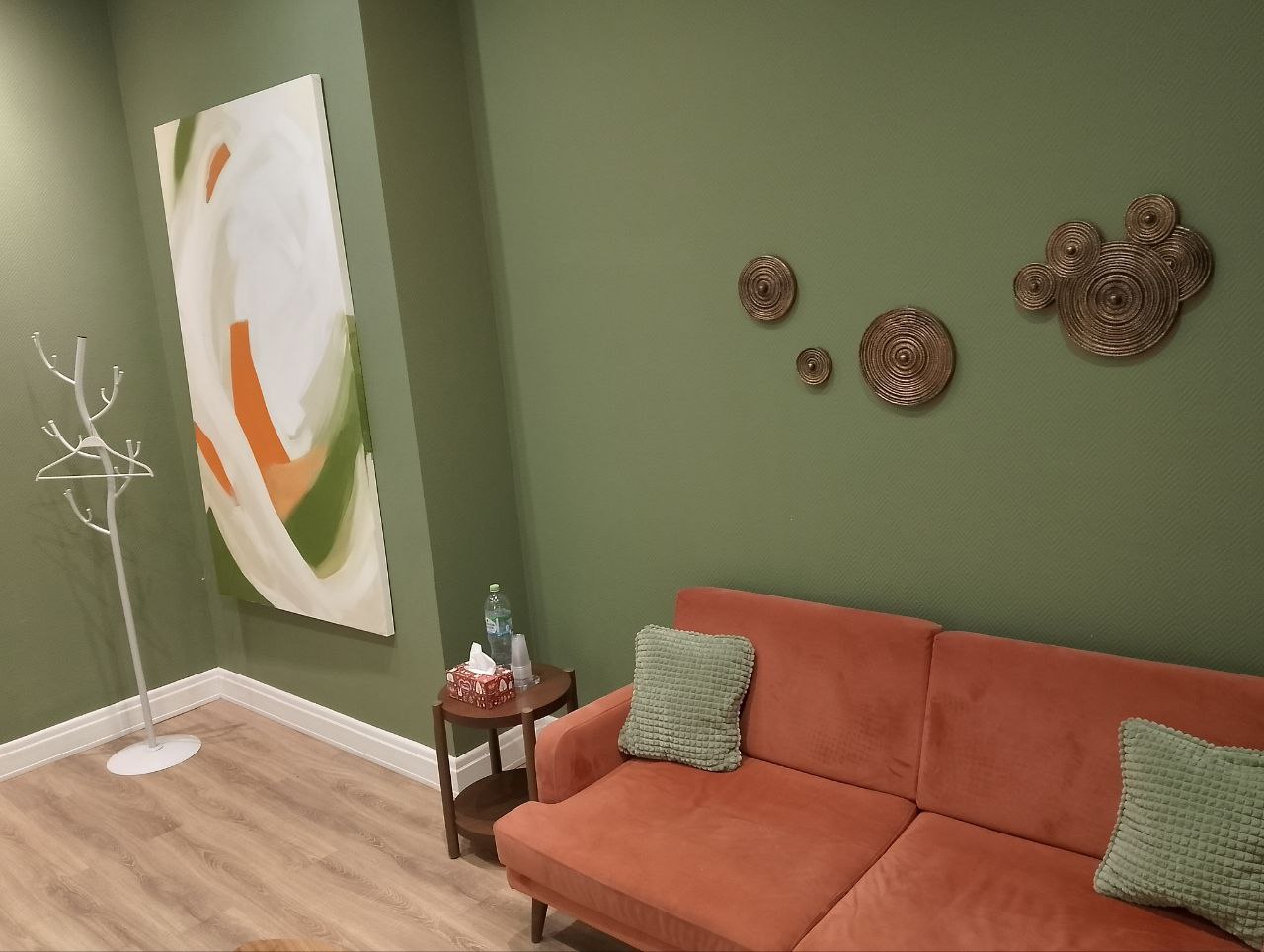 Преимущества нашего кабинета «Мятный»: Кабинет продуман для работы психоаналитиков. Для этого в нем расположена софа и кресло с журнальным столиком напротив. Имеется дополнительное мягкое освещение в виде торшера. Спокойные тона и дизайнерское оформление стен наполняют кабинет доброжелательной атмосферой.
