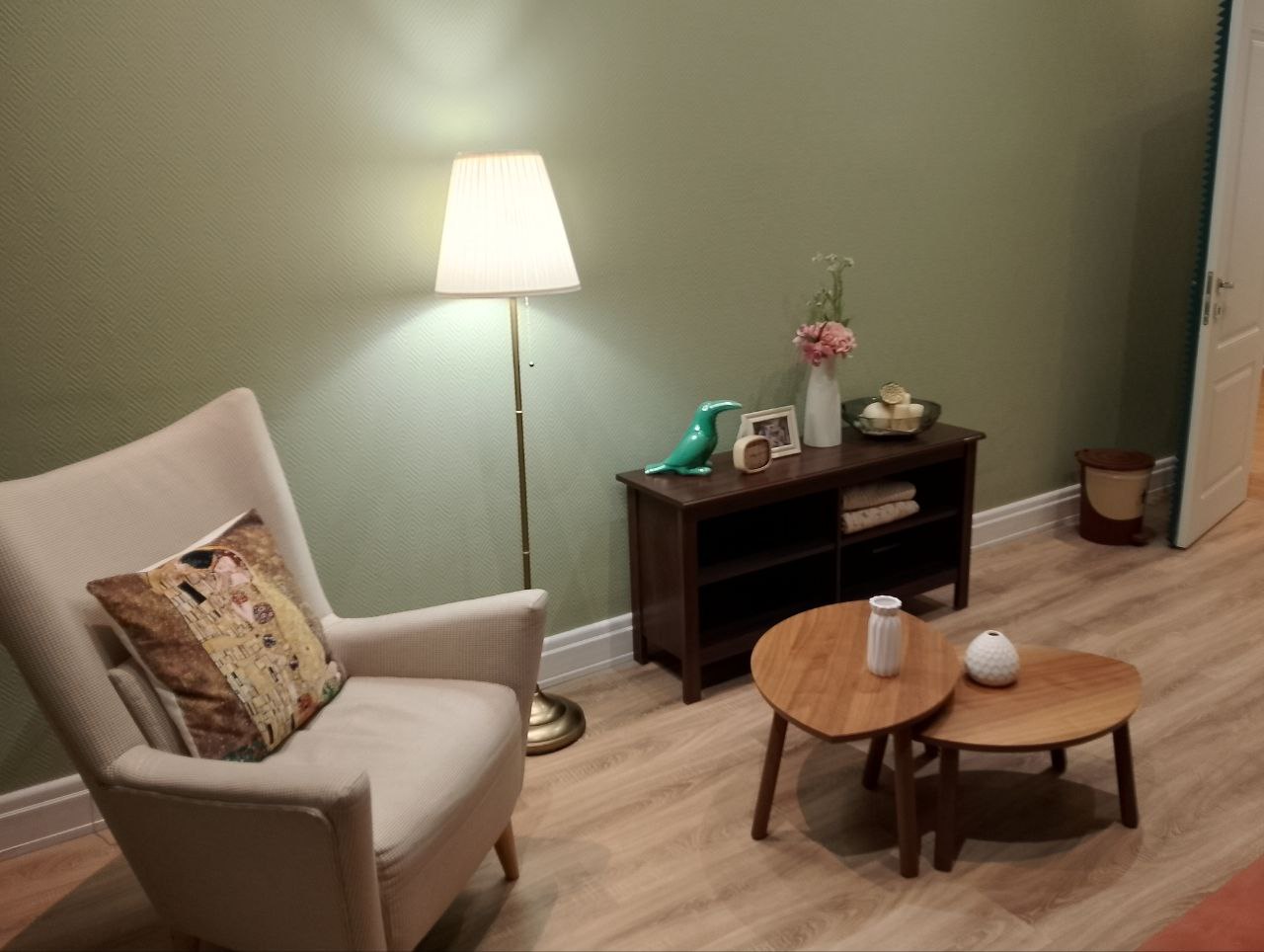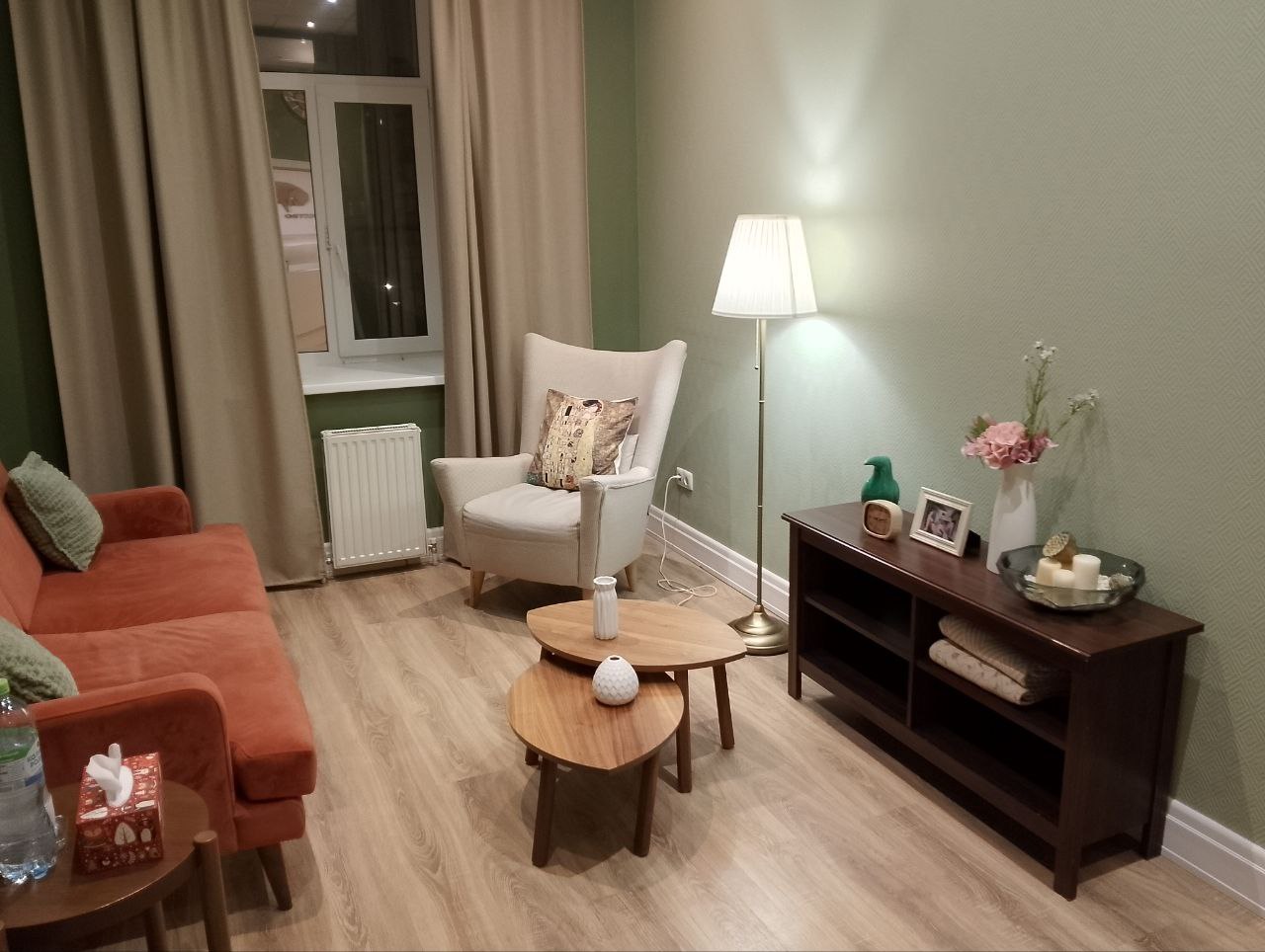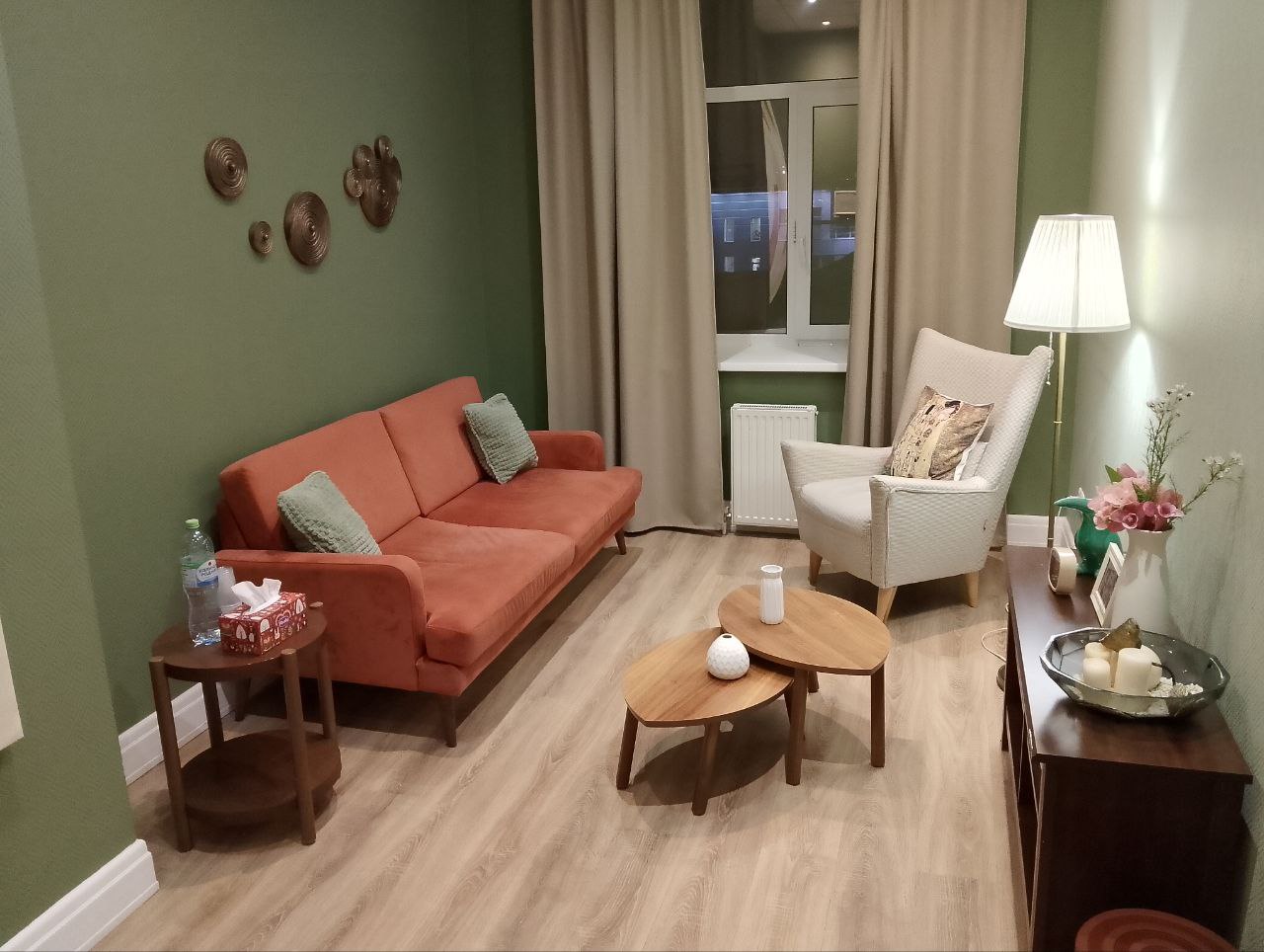 Преимущества нашего кабинета «Мятный»: Кабинет продуман для работы психоаналитиков. Для этого в нем расположена софа и кресло с журнальным столиком напротив. Имеется дополнительное мягкое освещение в виде торшера. Спокойные тона и дизайнерское оформление стен наполняют кабинет доброжелательной атмосферой.