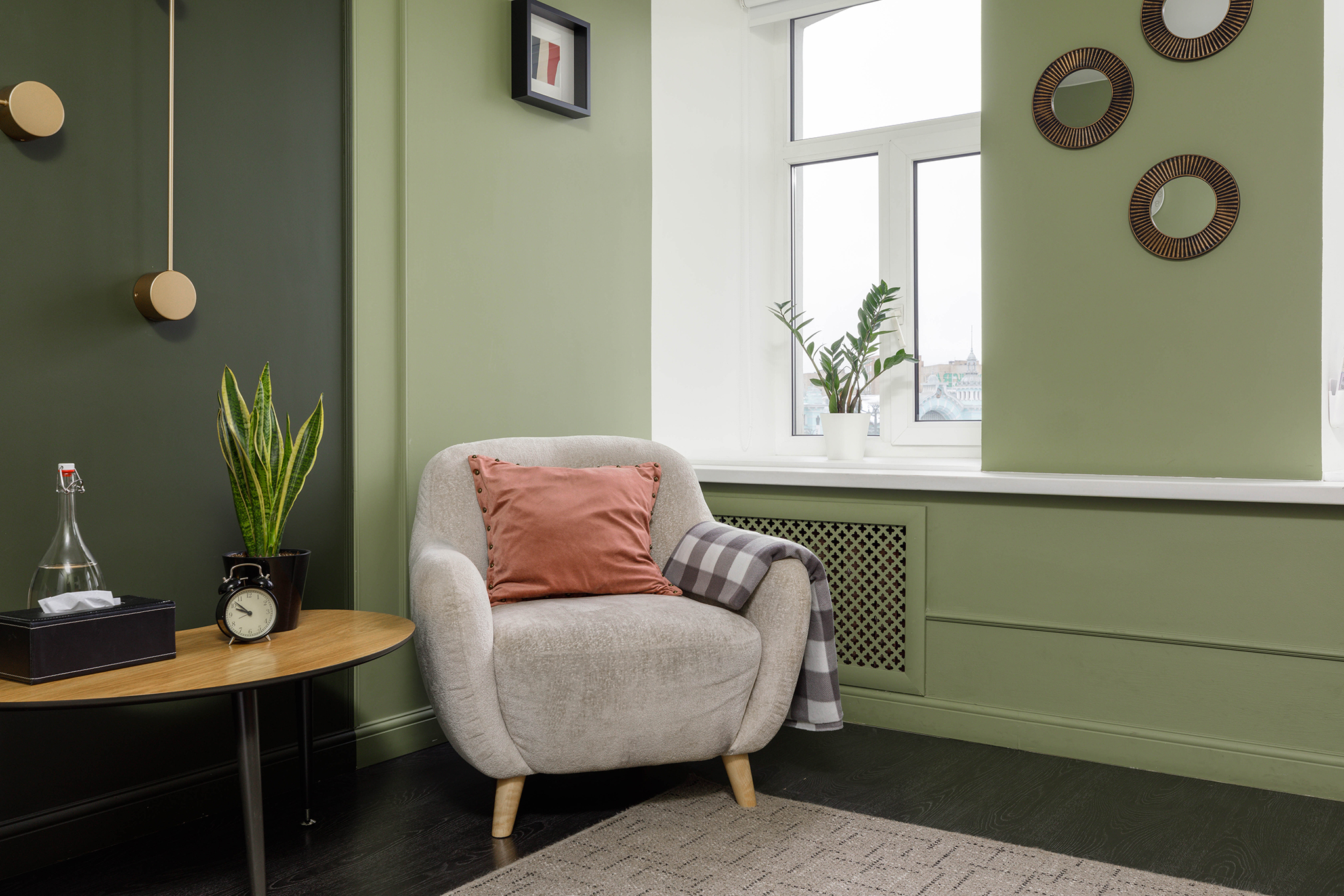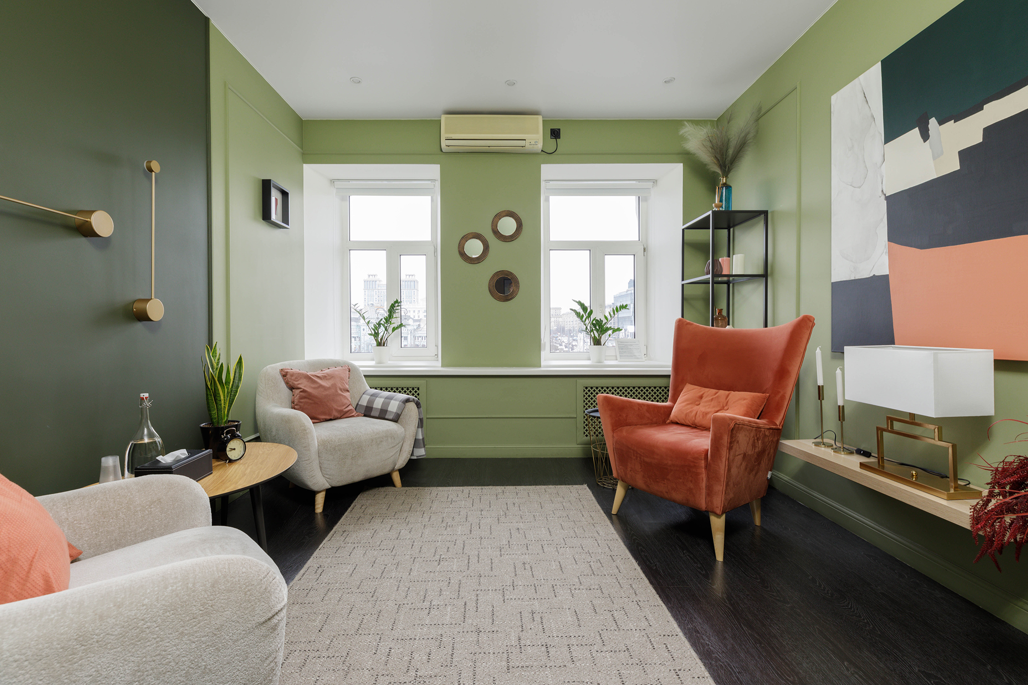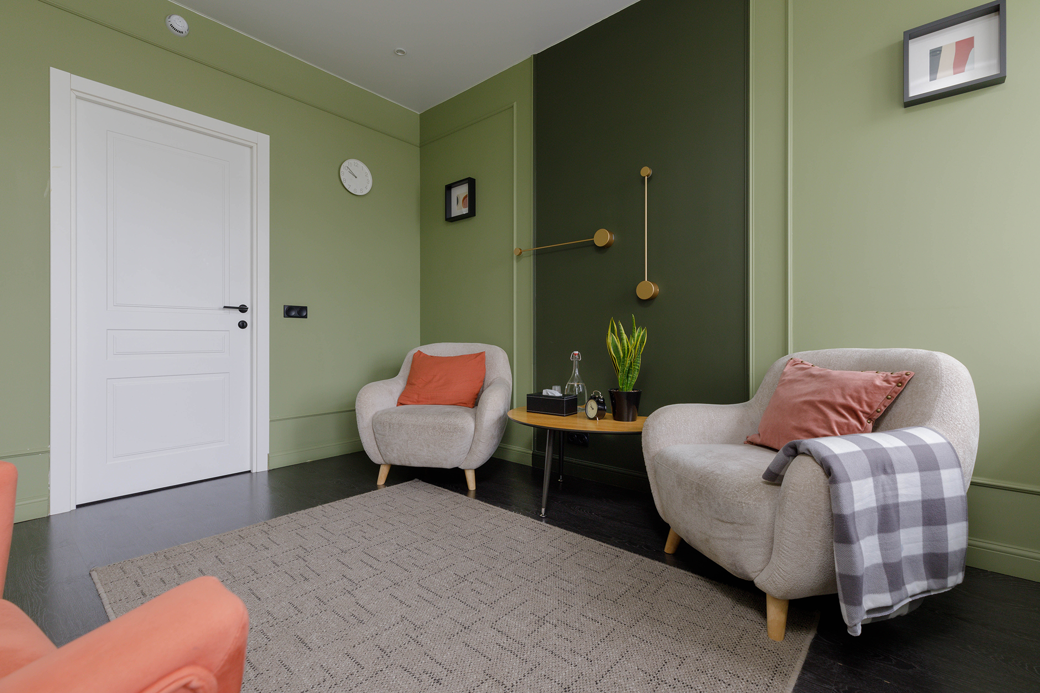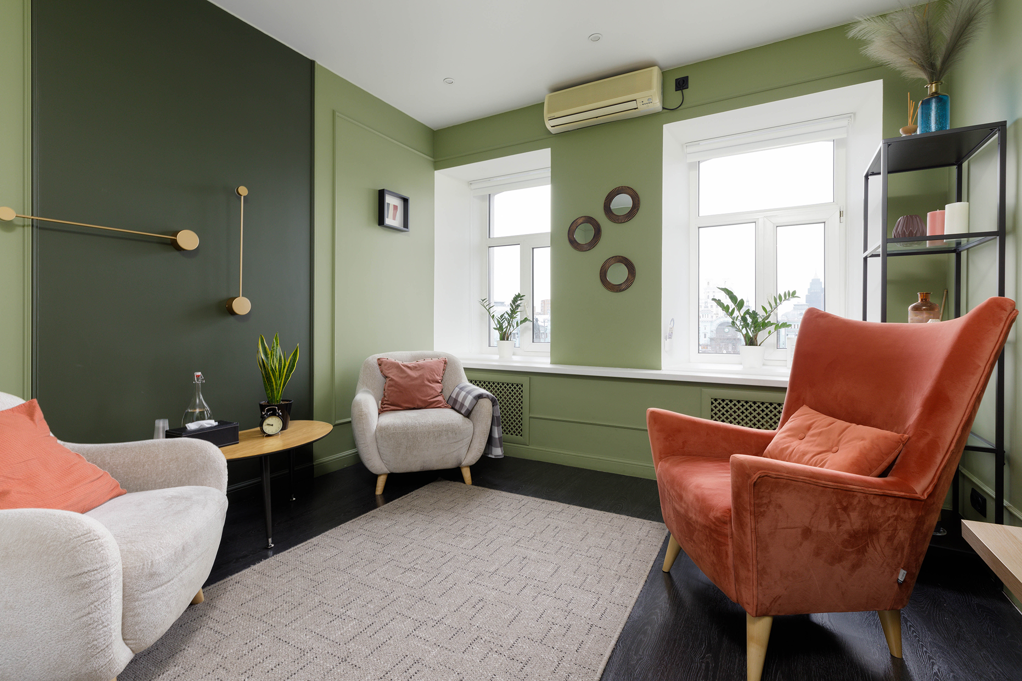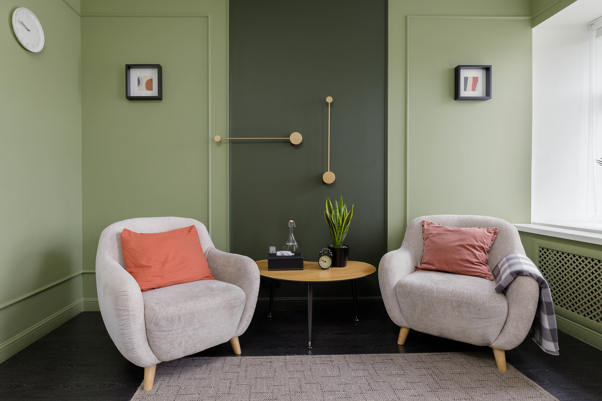 В кабинете представлены 3 кресла. Общая цветовая гамма обстановки выдержана в оливковом цвете с нотками постельных тонов, что делает кабинет максимально комфортным и создает доверительную и свободную обстановку, что дает посетителю, который пришел на прием к психологу, уверенно и спокойно обсудить все существующие проблемы.