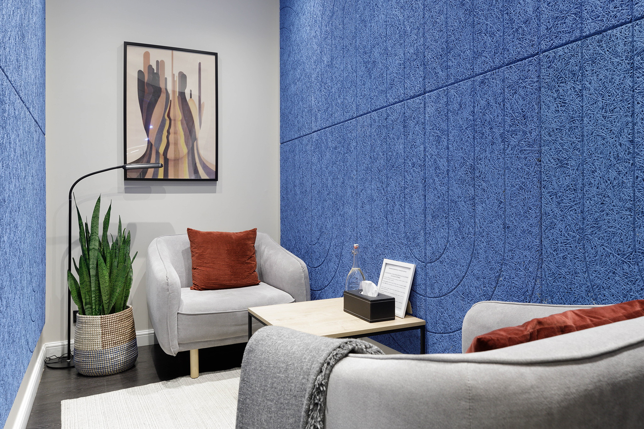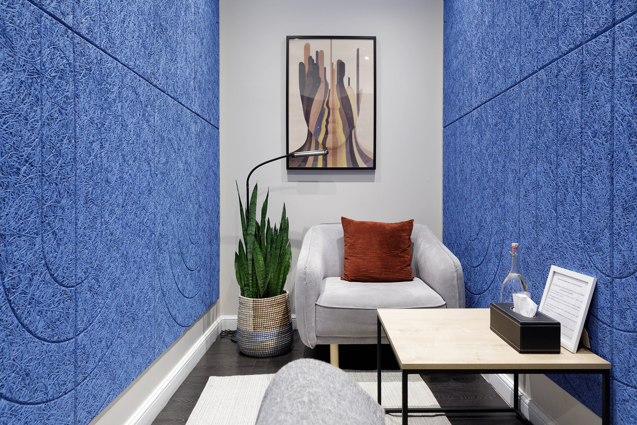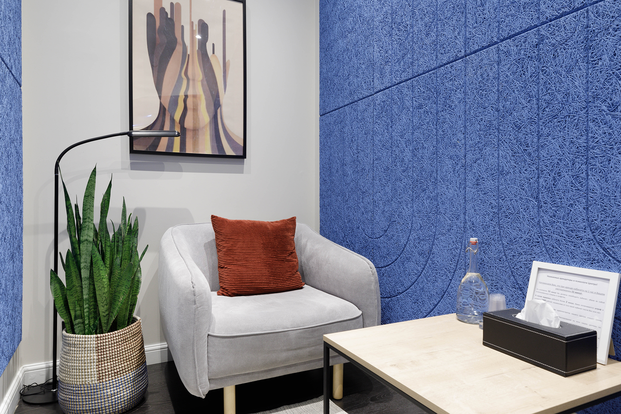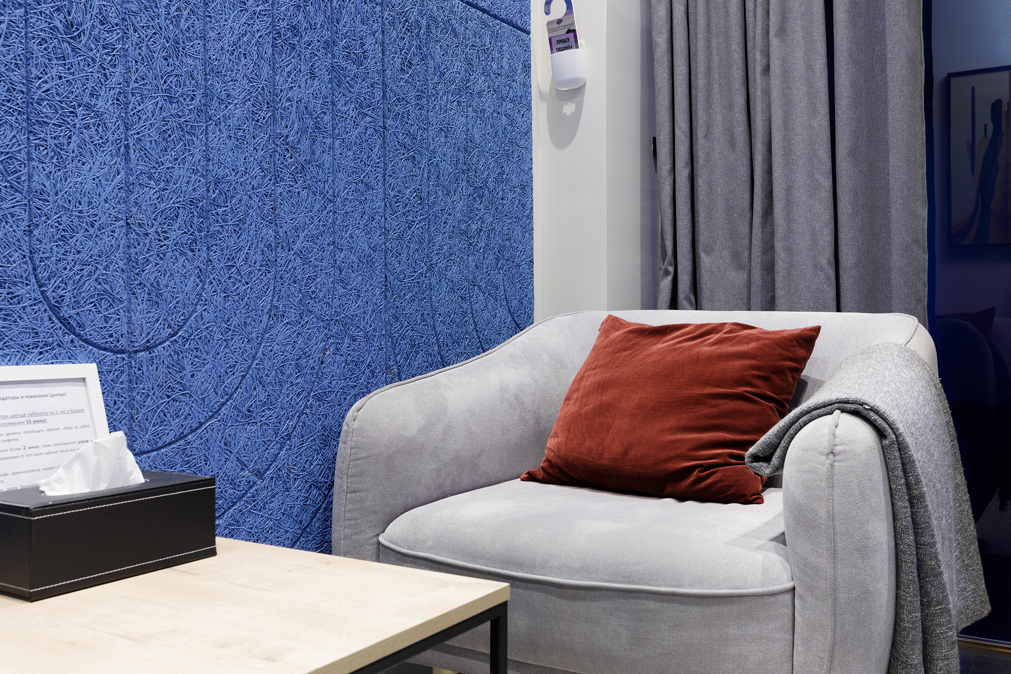 В кабинете представлены 2 мягких, комфортных кресла, журнальный столик. Общая цветовая гамма обстановки выдержана в постельных тонах, но с элементами акустического декора на стенах в синем цвете. Такое оформление делает кабинет максимально комфортным и создает доверительную, свободную обстановку. Поэтому посетитель, который пришел на прием к психологу, уверенно и спокойно может обсудить все существующие проблемы.