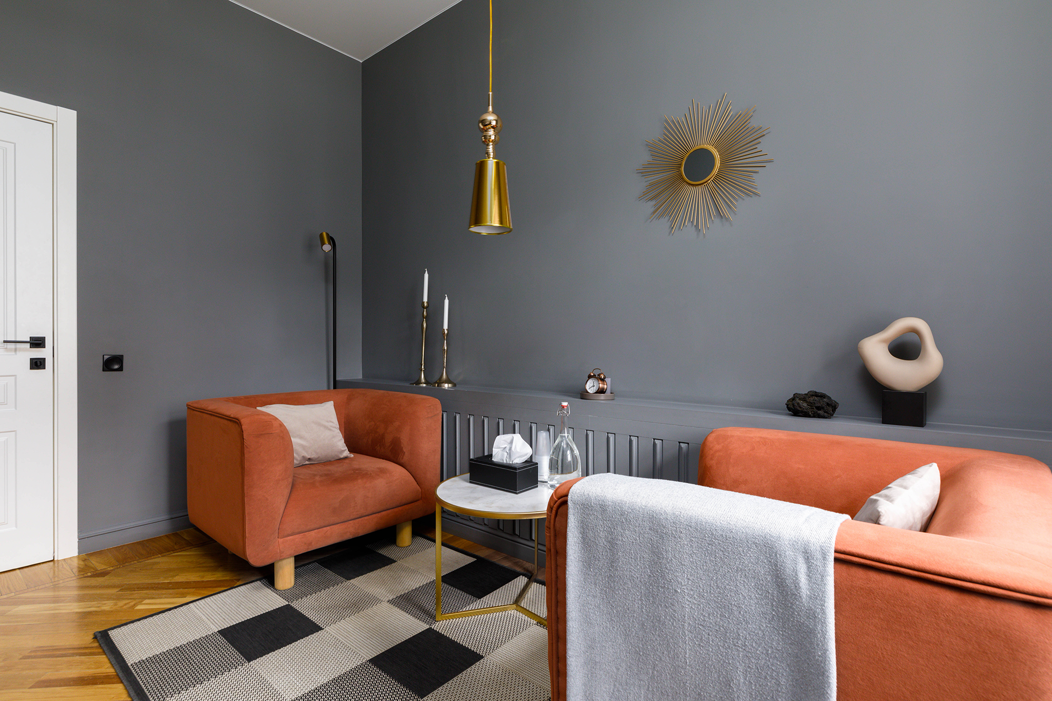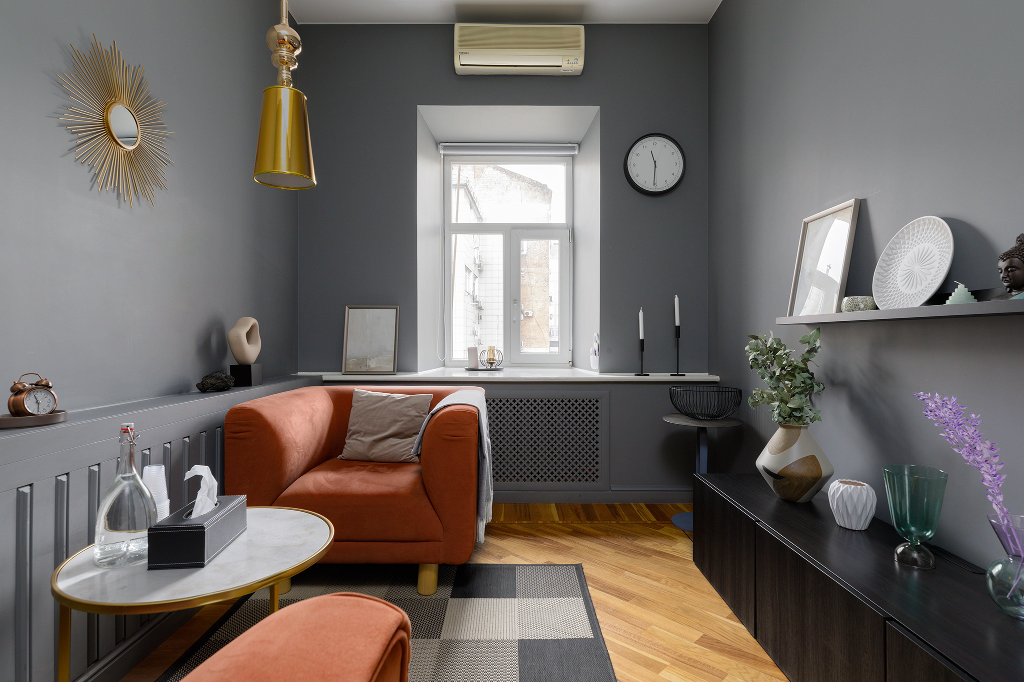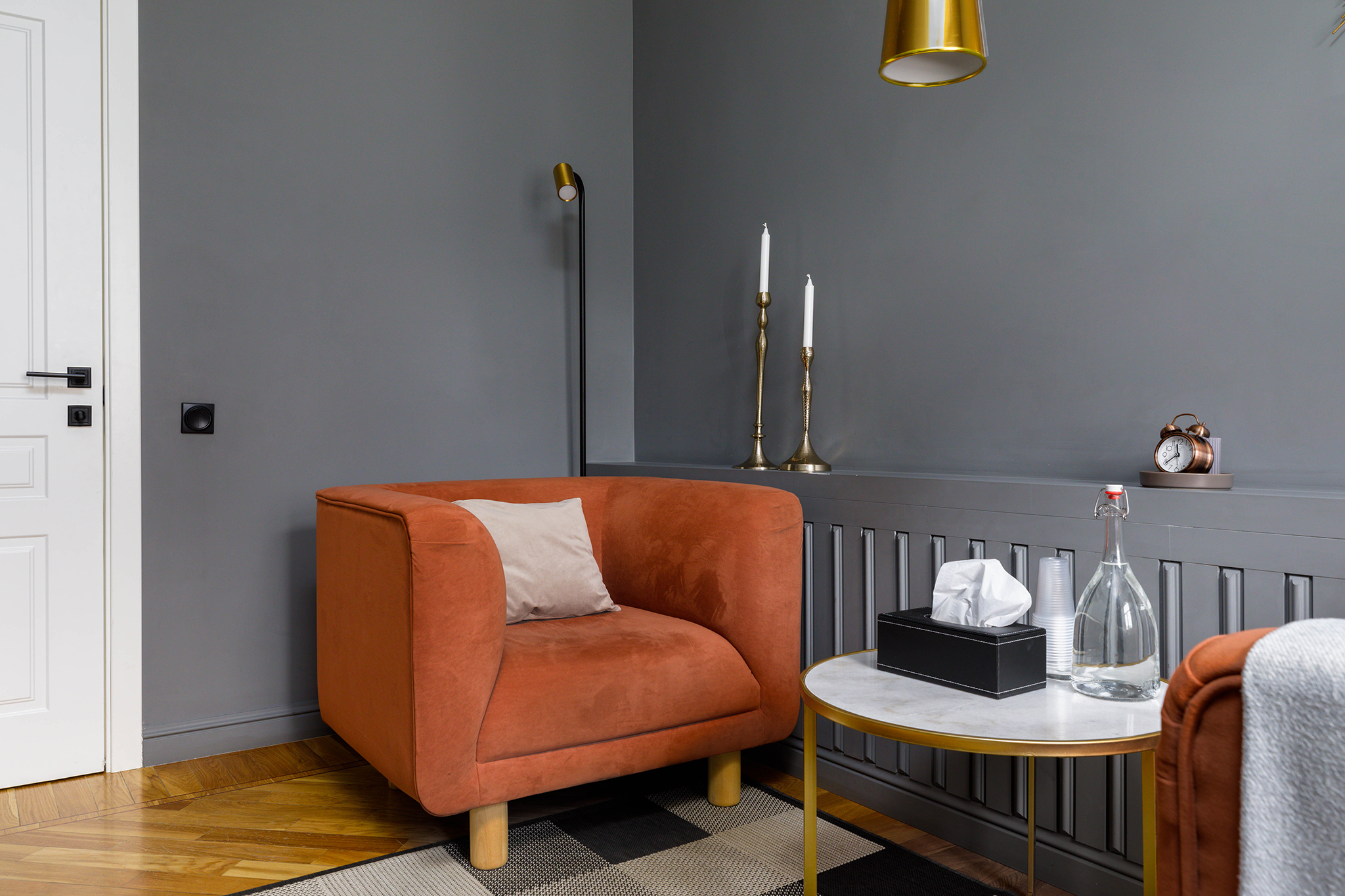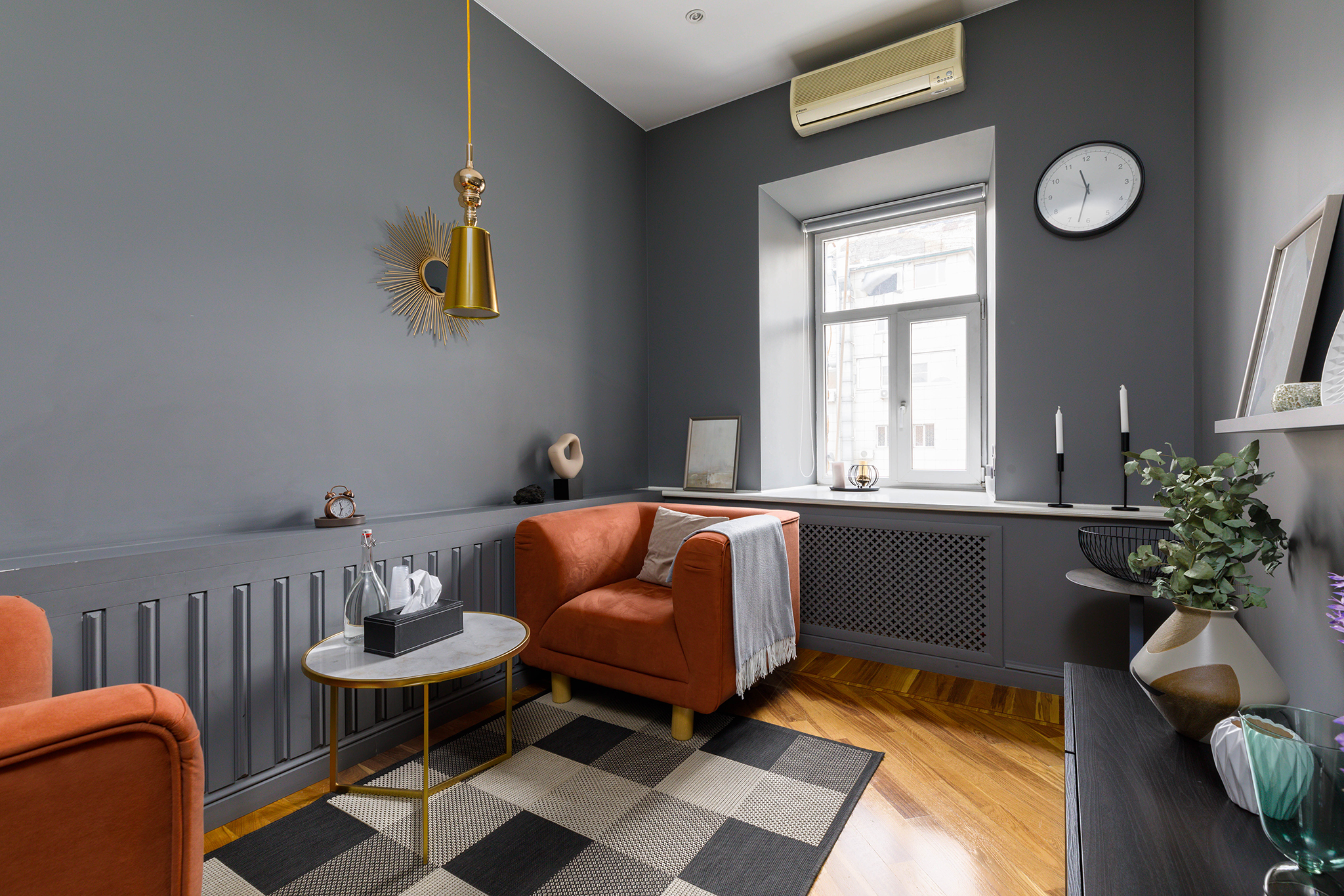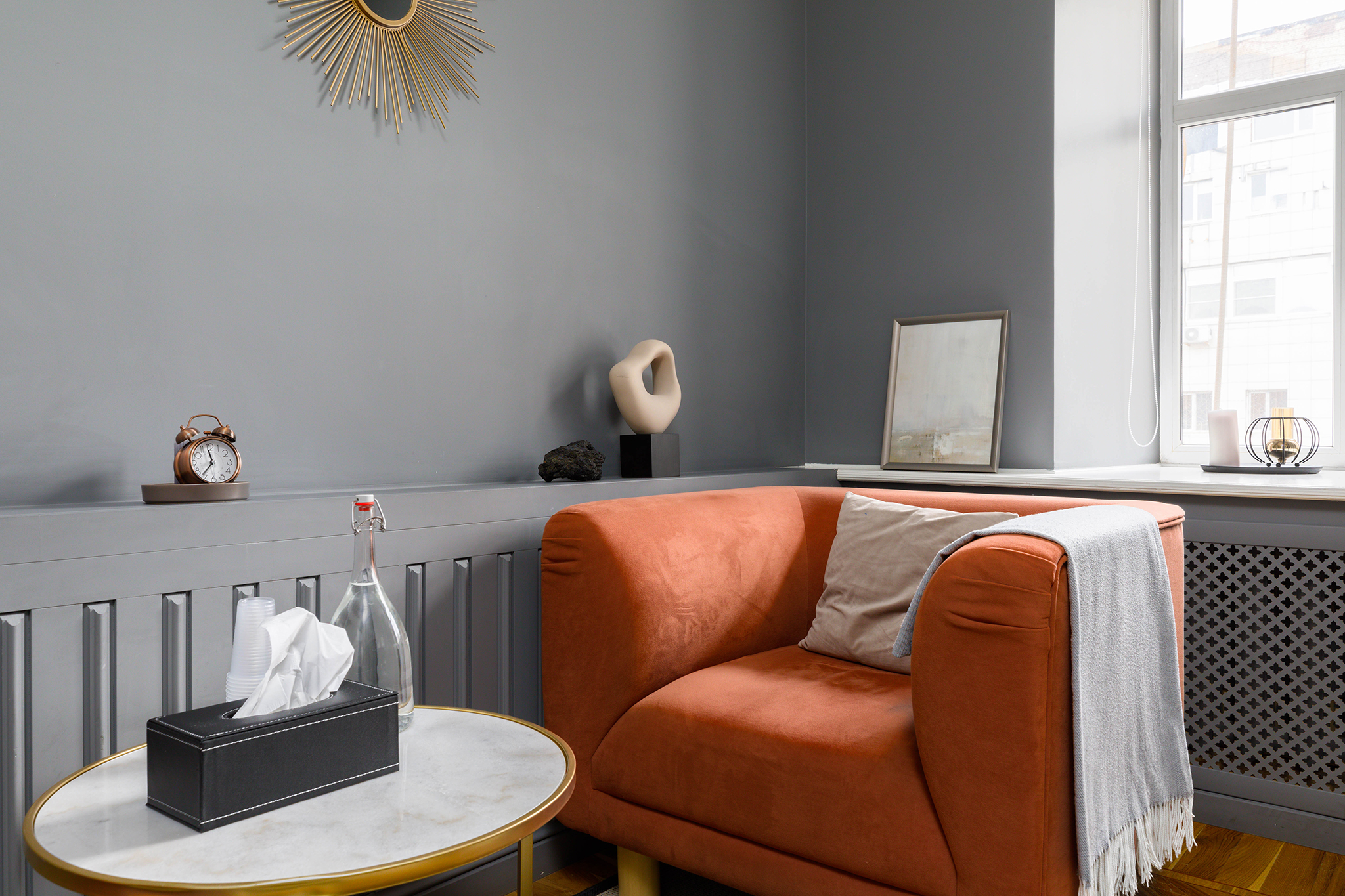В кабинете представлены мягкие кресла, журнальный столик, декор на стенах. Общая цветовая гамма обстановки выдержана в серых тонах. Такое оформление делает кабинет максимально комфортным и создает доверительную, свободную обстановку. Поэтому посетитель, который пришел на прием к психологу, уверенно и спокойно может обсудить все существующие проблемы.