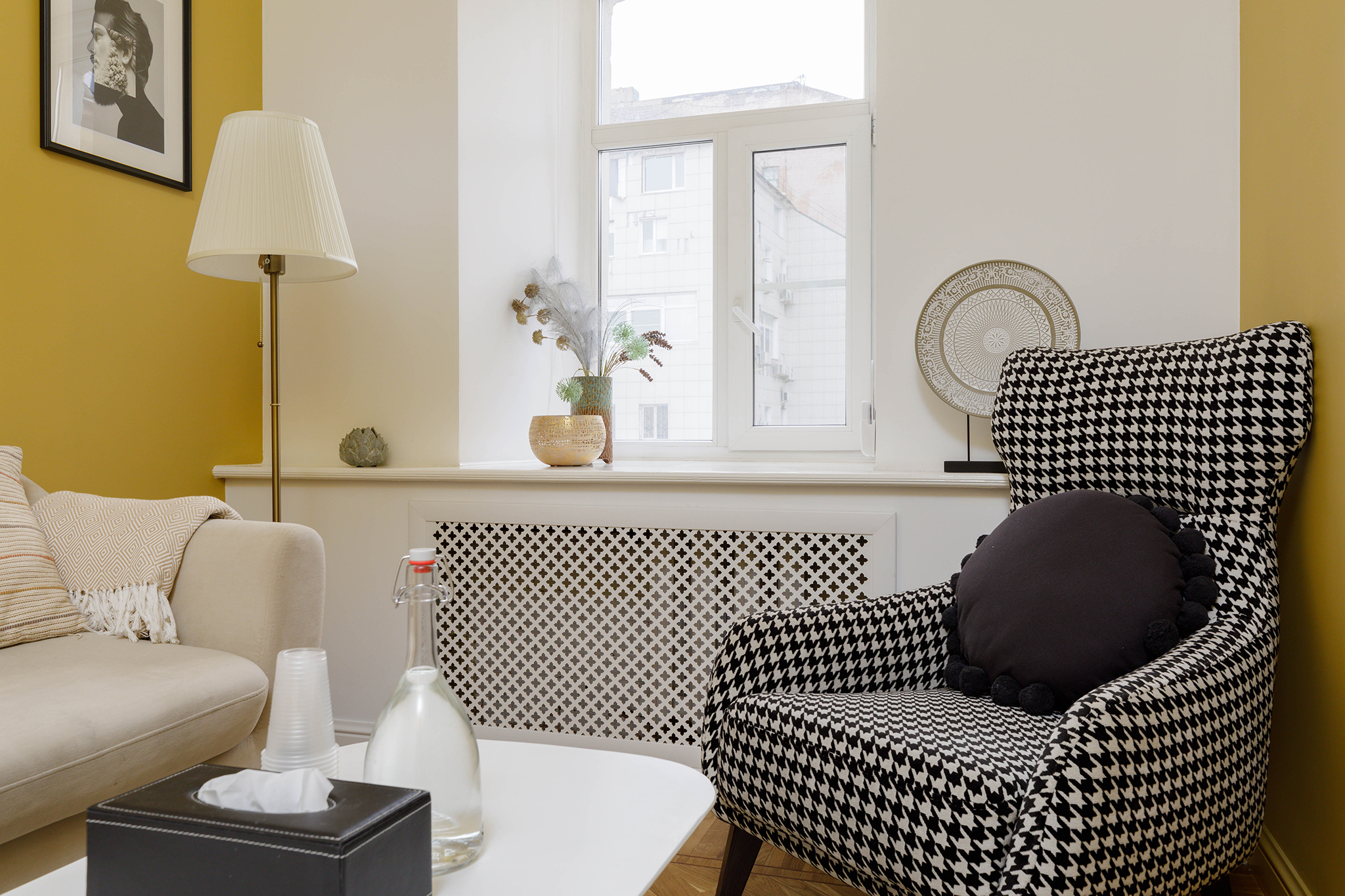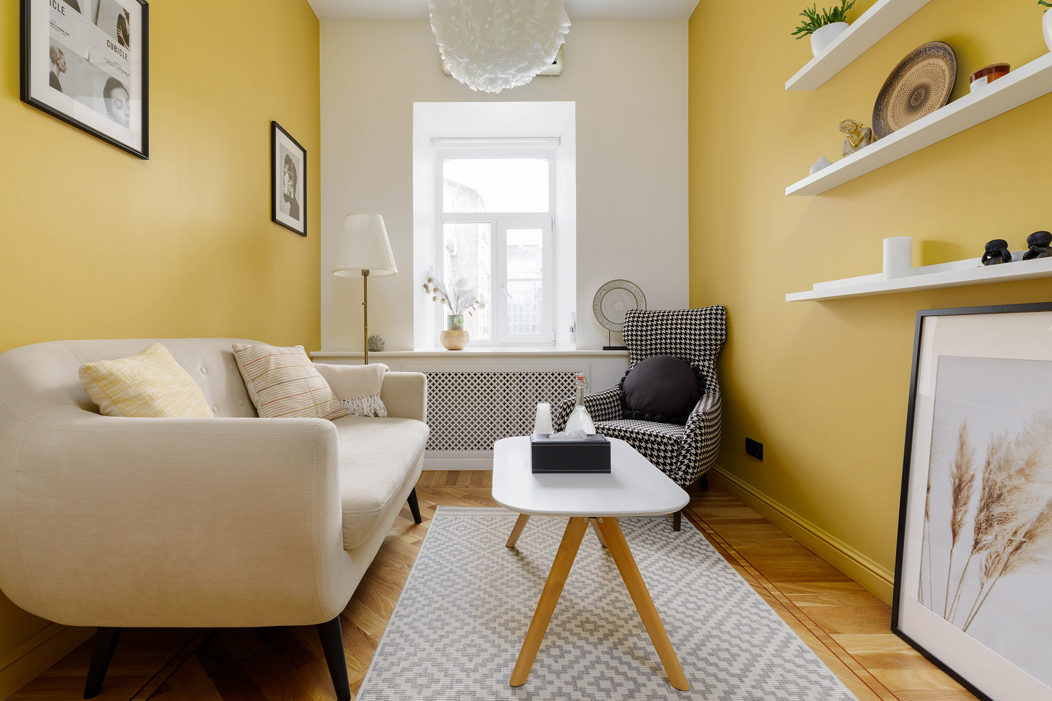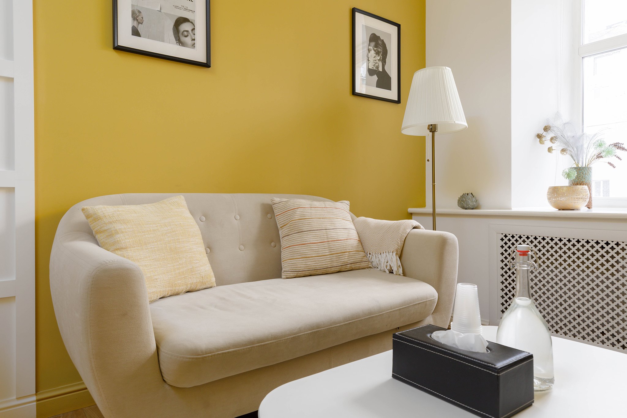 В кабинете представлены диван, кресло, журнальный столик, торшер. Общая цветовая гамма обстановки выдержана в желтом и светлых оттенках. Такое оформление делает кабинет максимально комфортным и создает доверительную, свободную обстановку. Поэтому посетитель, который пришел на прием к психологу, уверенно и спокойно может обсудить все существующие проблемы.