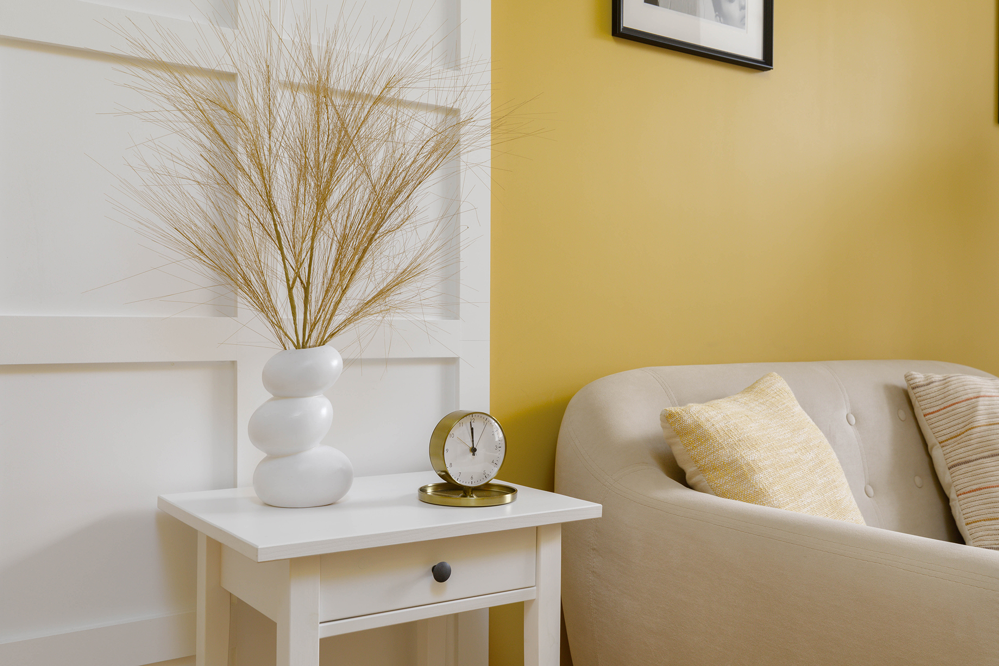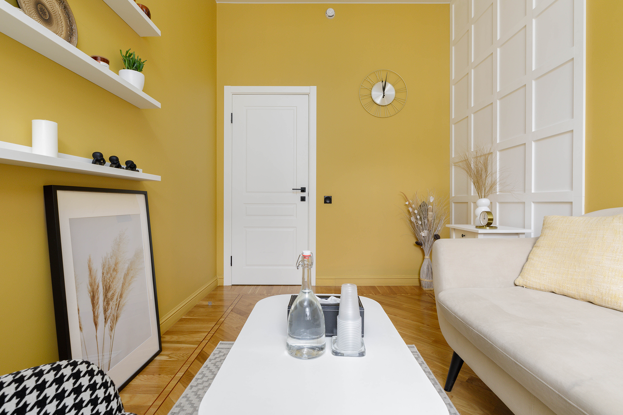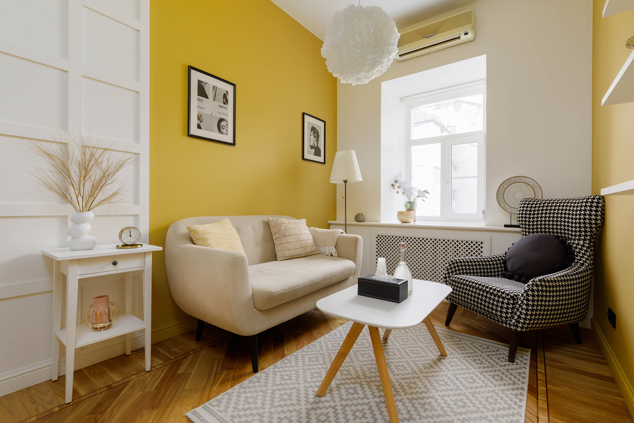 В кабинете представлены диван, кресло, журнальный столик, торшер. Общая цветовая гамма обстановки выдержана в желтом и светлых оттенках. Такое оформление делает кабинет максимально комфортным и создает доверительную, свободную обстановку. Поэтому посетитель, который пришел на прием к психологу, уверенно и спокойно может обсудить все существующие проблемы.