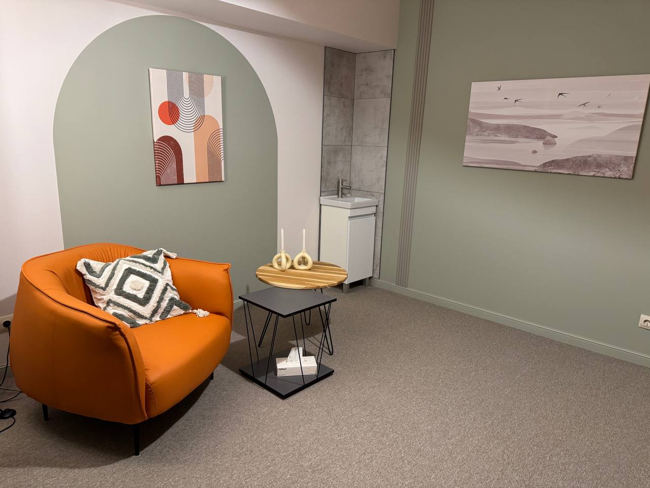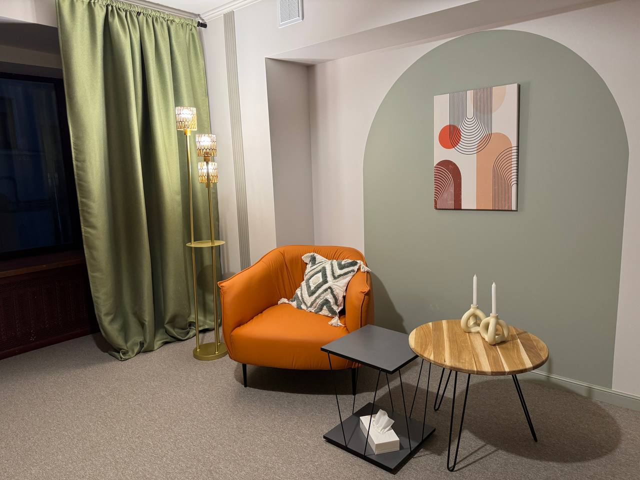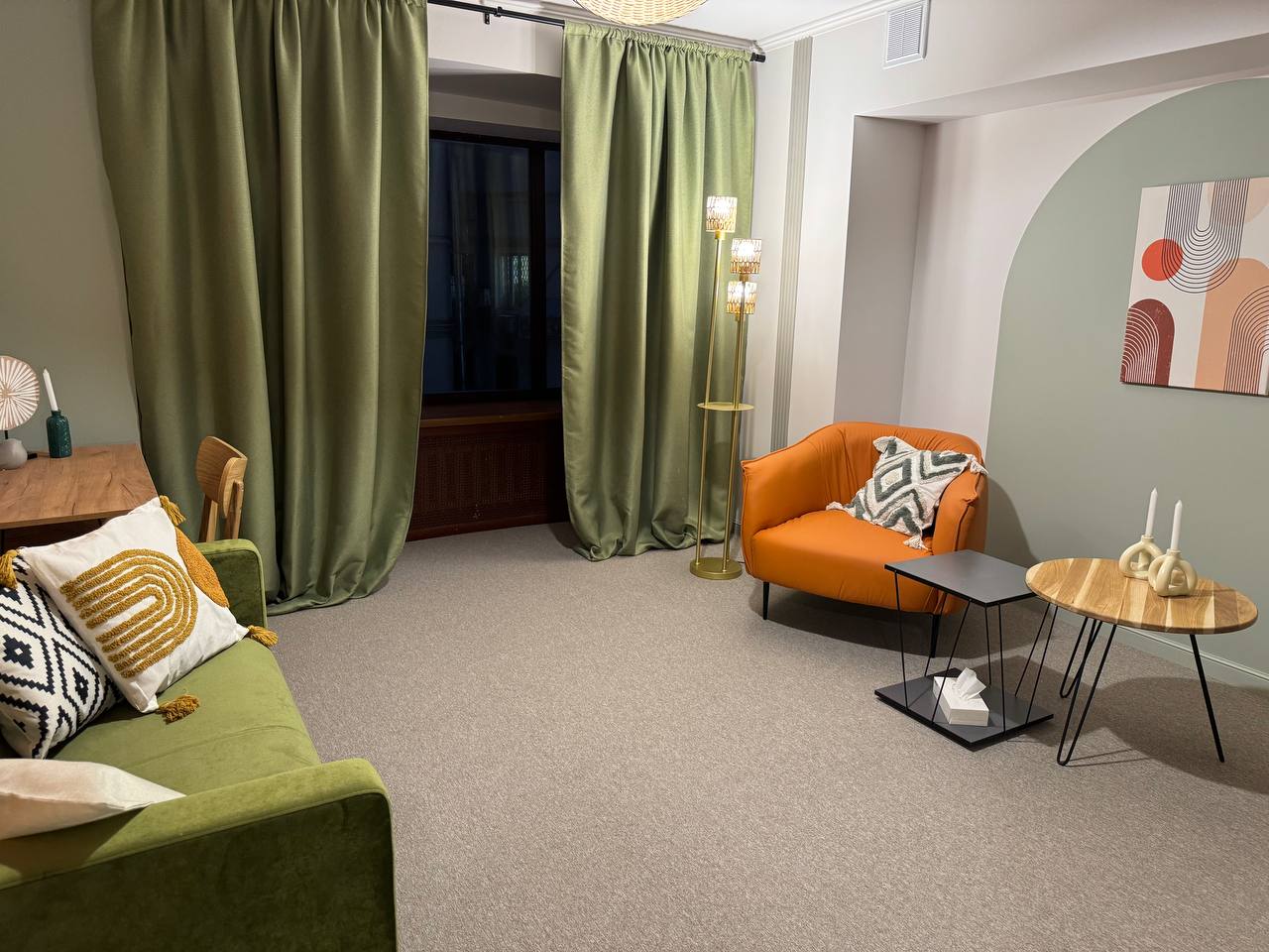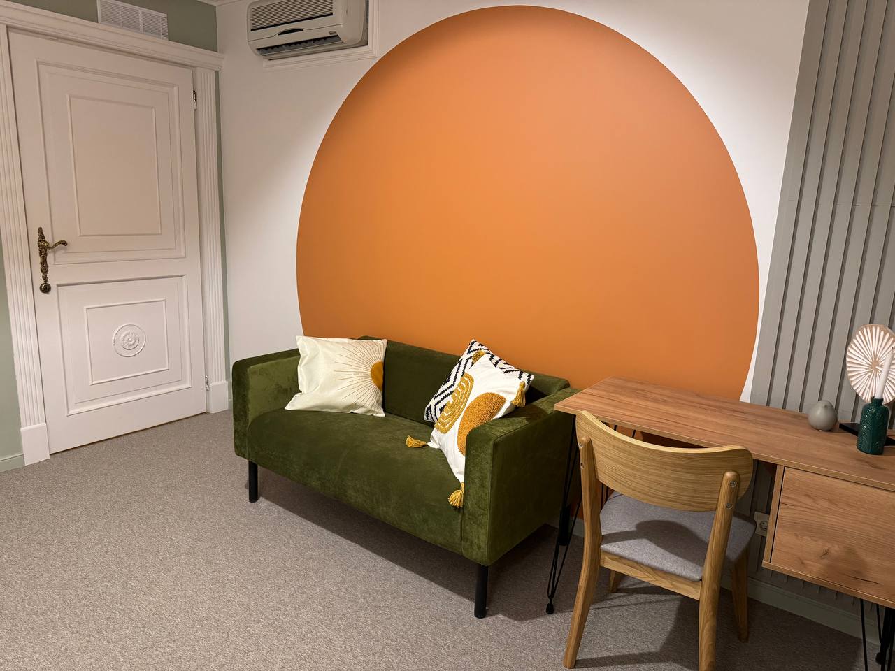 окном, выходящим во двор, диваном, креслом, рабочим столом со стулом. Кабинет подойдет для индивидуальных и семейных консультаций.