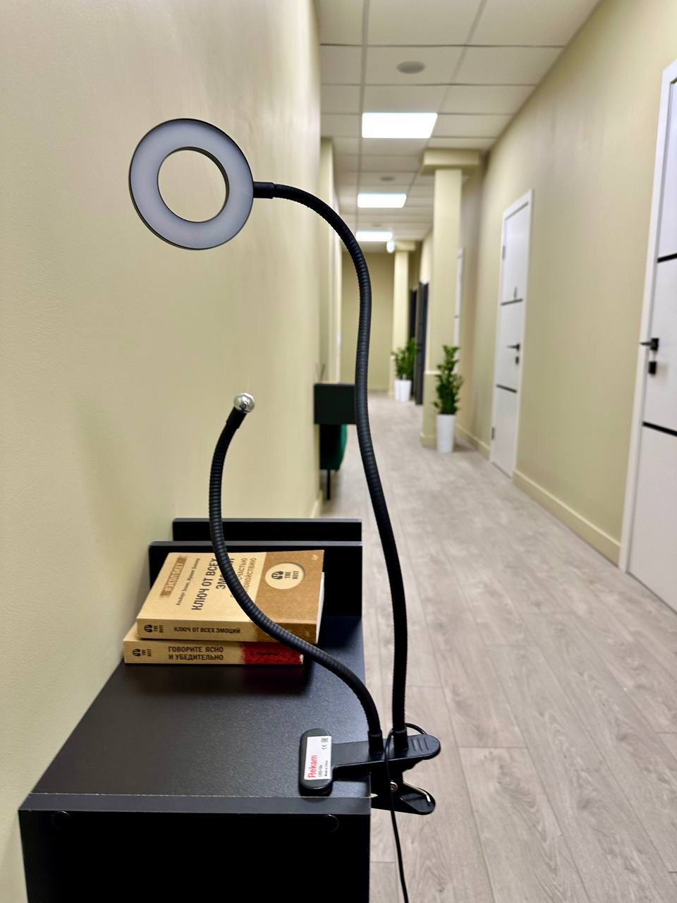 Небольшая кольцевая лампа на прищепке. Диаметр кольца 9 см. Длина гибкой ножки 60 см. Ступенчатая регулировка яркости, 3 режима цветовой температуры.
