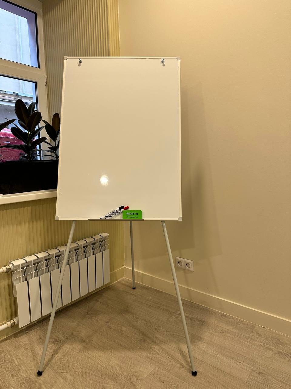 Регулируемая высота от 105 до 182 см за счет телескопических ног. Флипчарт имеет подвесы для блокнота (на винтах) и полочку для маркеров.