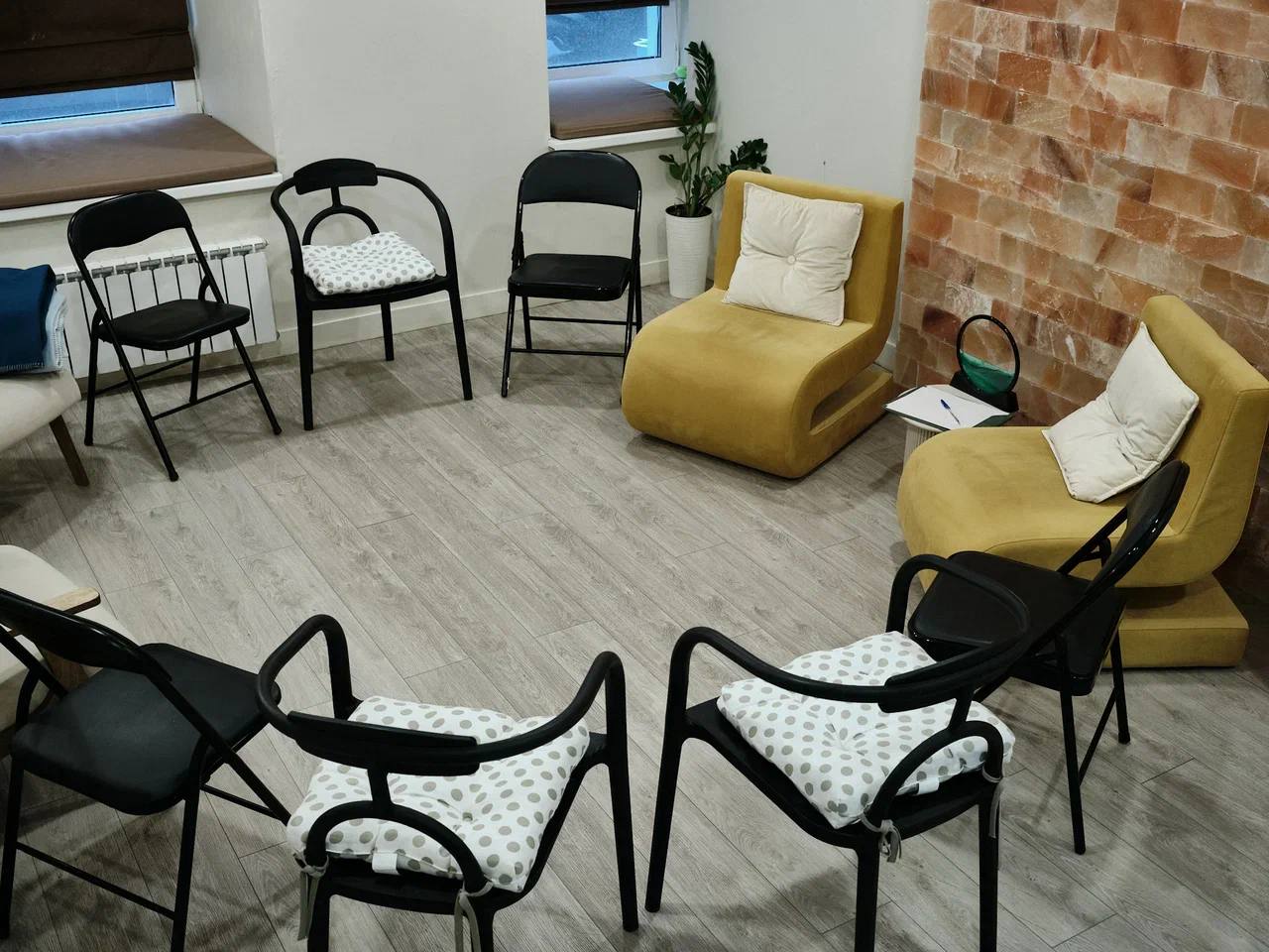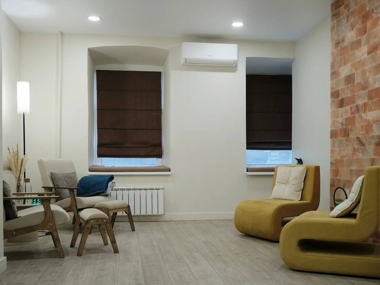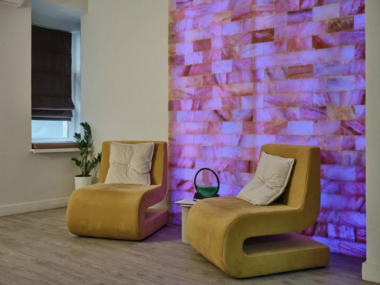 Соляная комната. Подойдет для телесно-ориентированных практик и медитаций, как парных, так и групповых. Большой кабинет оборудован соляной стеной, что способствует расслаблению и несет пользу для ментального здоровья и физического состояния. Вы можете расположиться в креслах с пуфиками для ног в основной зоне или на двух мягких креслах в зоне у входа. Около кресел размещены столики. В кабинете два открывающихся окна, и на подоконниках расположены матрасы с подушками. Выполнена повышенная шумоизоляция. По запросу мы предоставляем массажный стол , раскладные стулья или коврики для йоги (до 8 шт.).