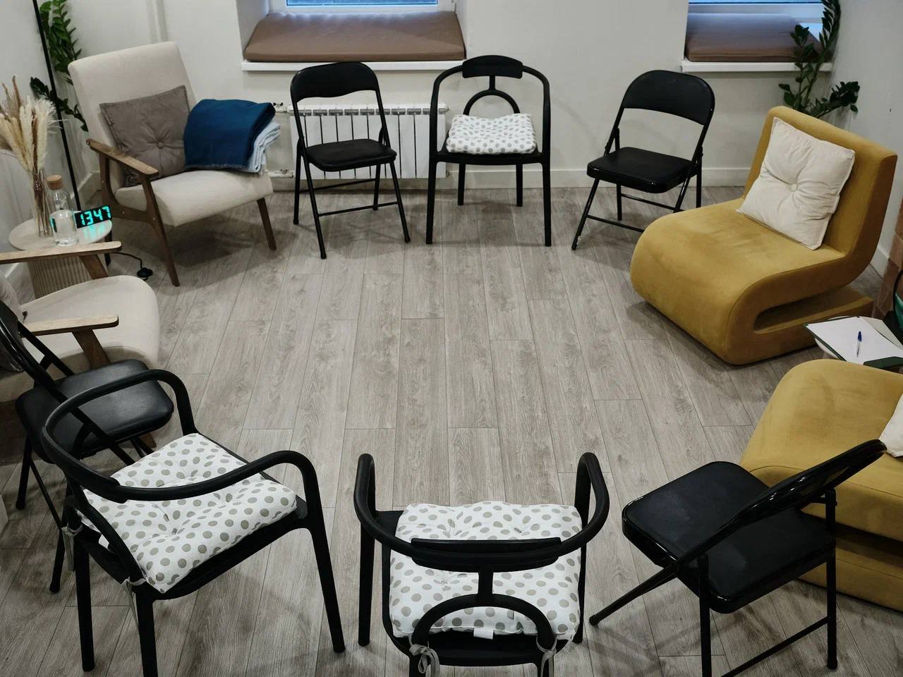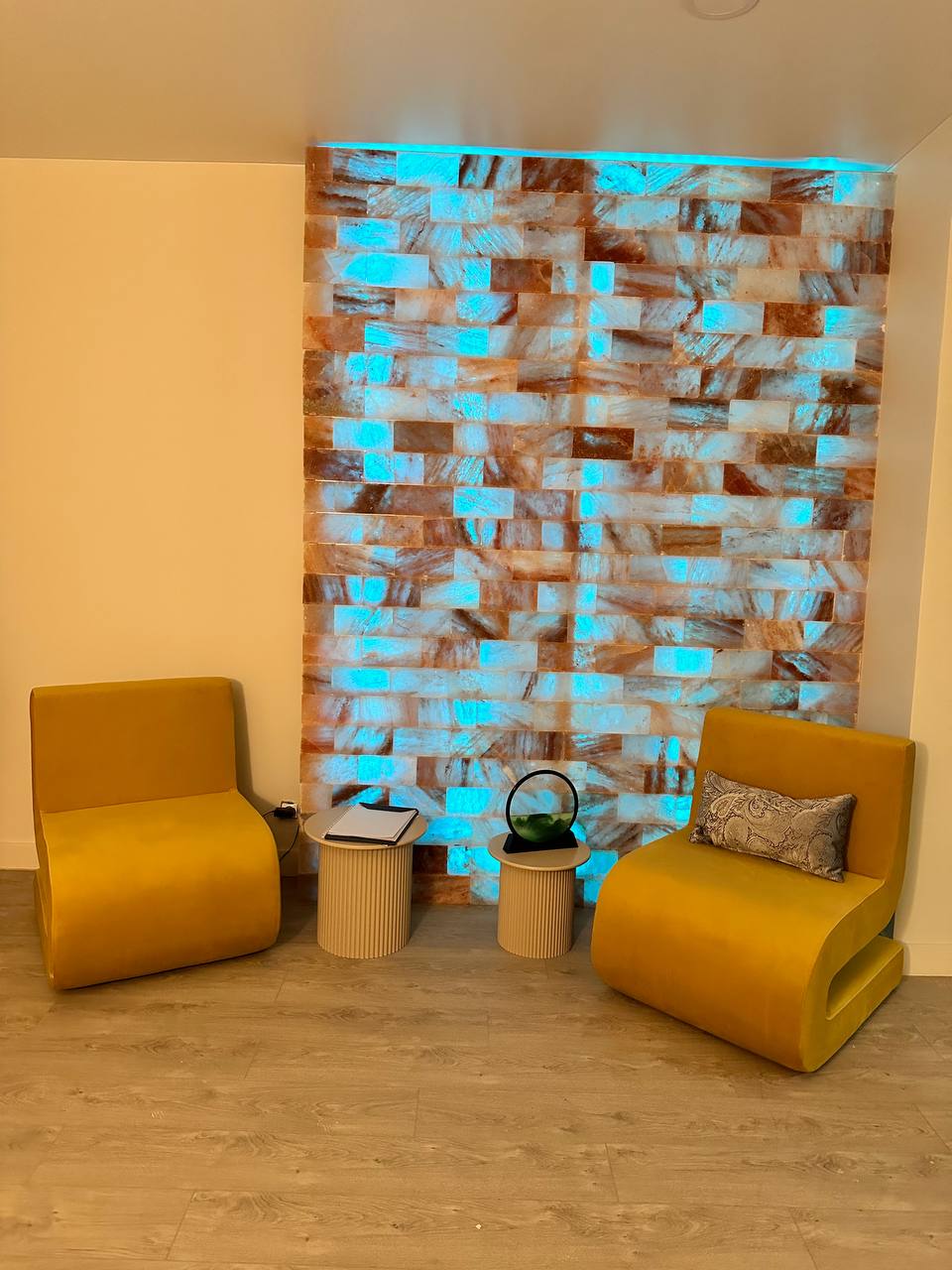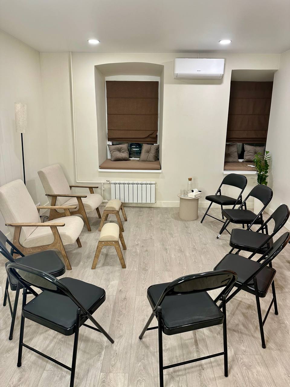Соляная комната. Подойдет для телесно-ориентированных практик и медитаций, как парных, так и групповых. Большой кабинет оборудован соляной стеной, что способствует расслаблению и несет пользу для ментального здоровья и физического состояния. Вы можете расположиться в креслах с пуфиками для ног в основной зоне или на двух мягких креслах в зоне у входа. Около кресел размещены столики. В кабинете два открывающихся окна, и на подоконниках расположены матрасы с подушками. Выполнена повышенная шумоизоляция. По запросу мы предоставляем массажный стол , раскладные стулья или коврики для йоги (до 8 шт.).