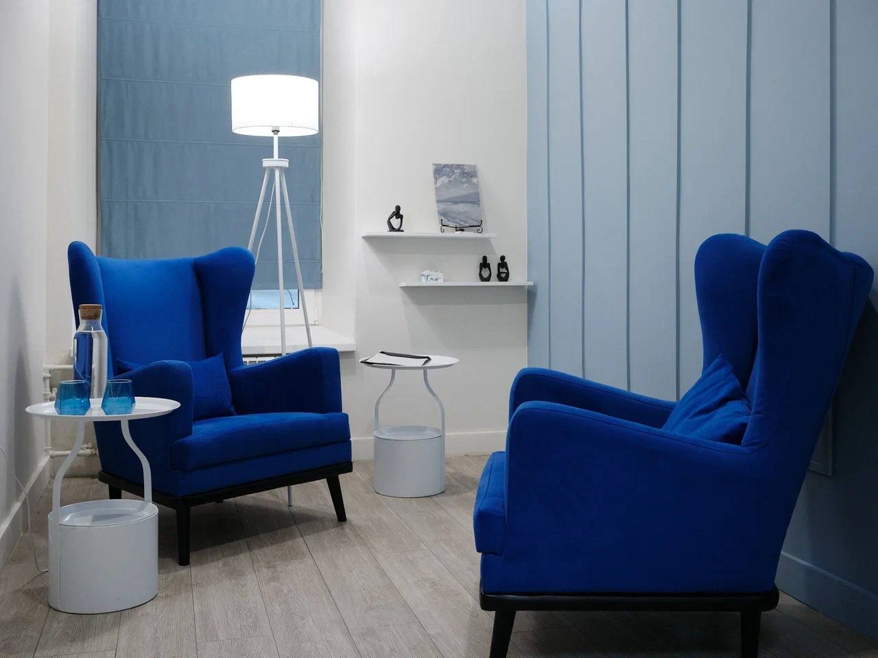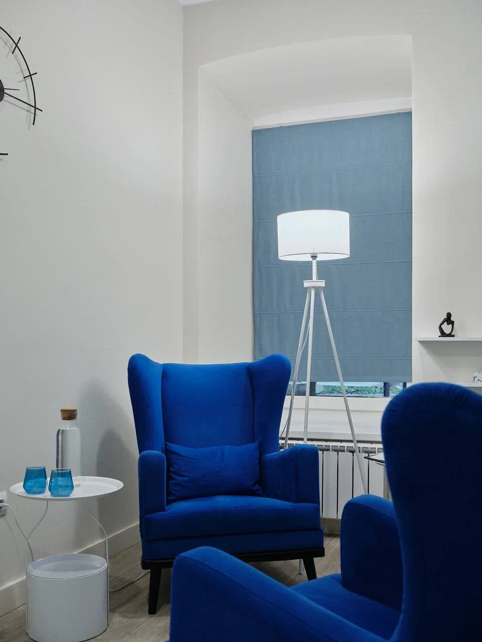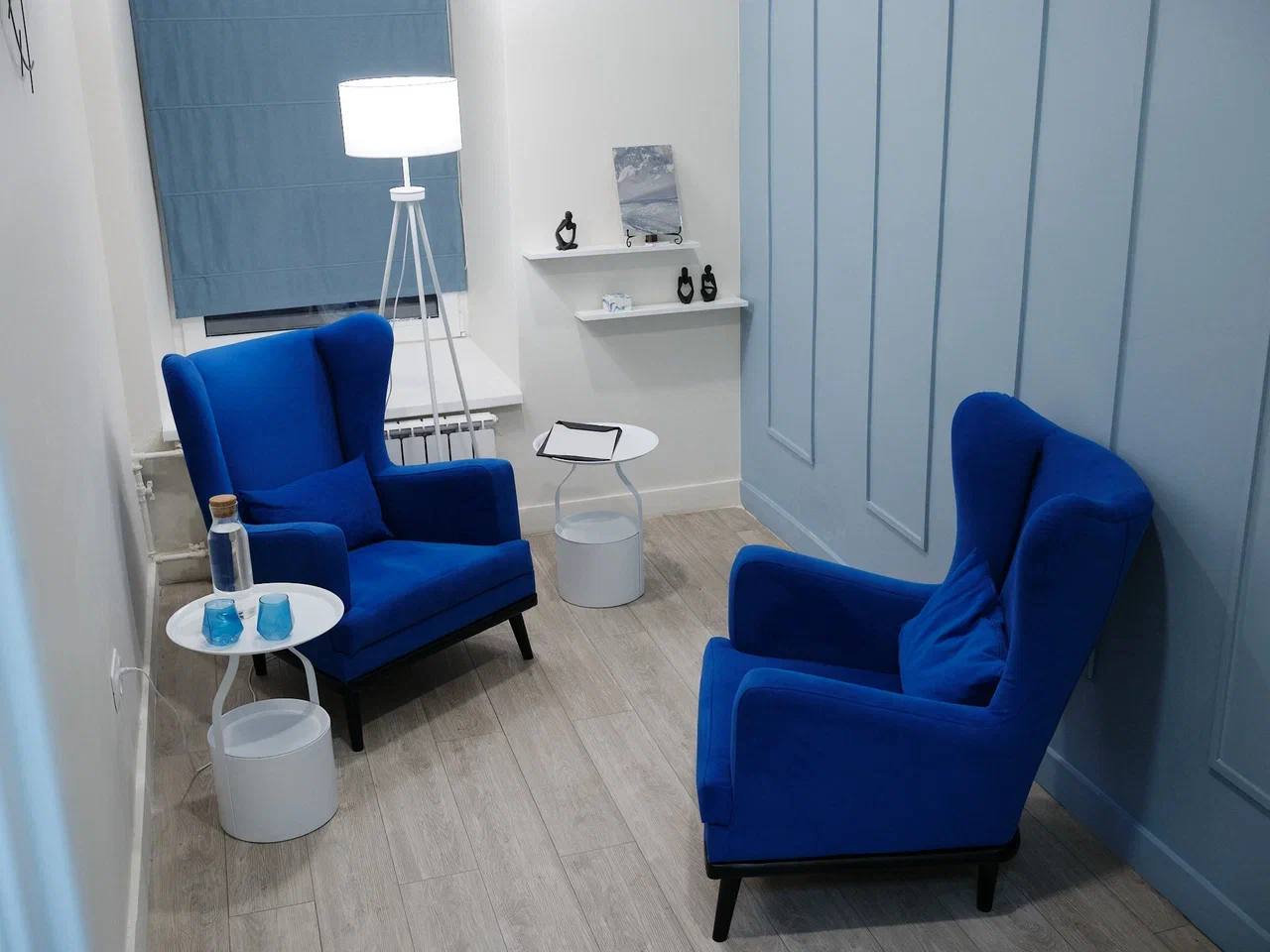 Лаконичный кабинет с креслами приятного синего оттенка цвета и белыми журнальными столиками.