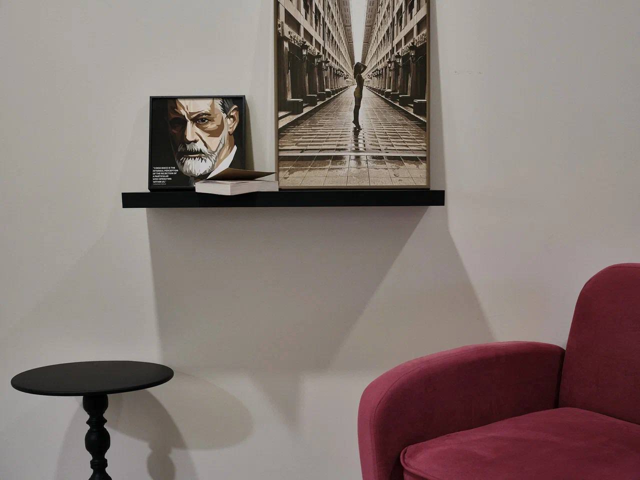 Оснащен кушеткой с пуфом для психоанализа и удобным креслом для аналитика.  Акцентом в интерьере являются лаконичные часы и портрет З.Фрейда.