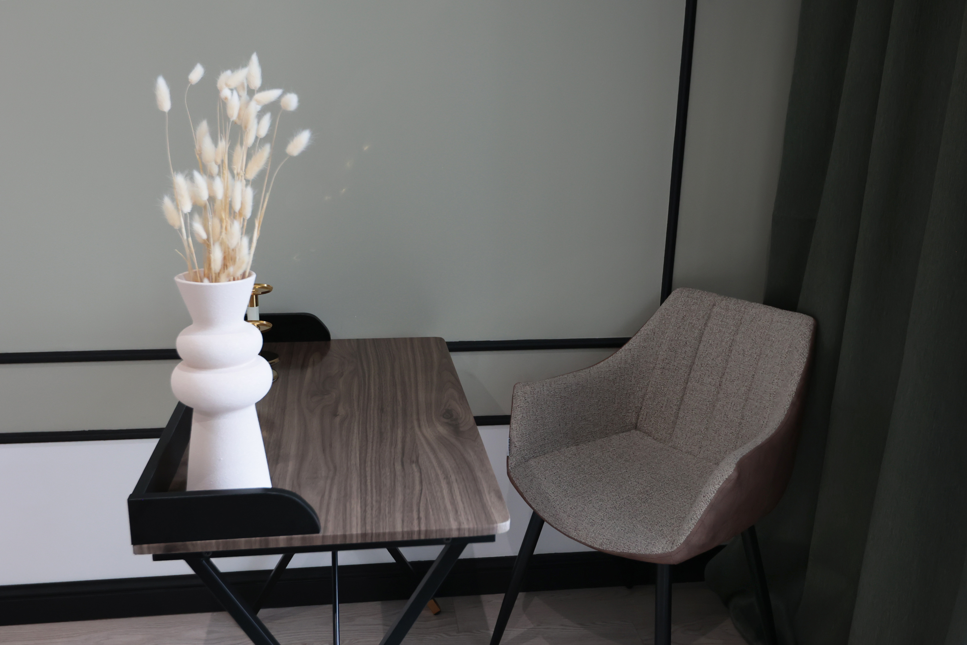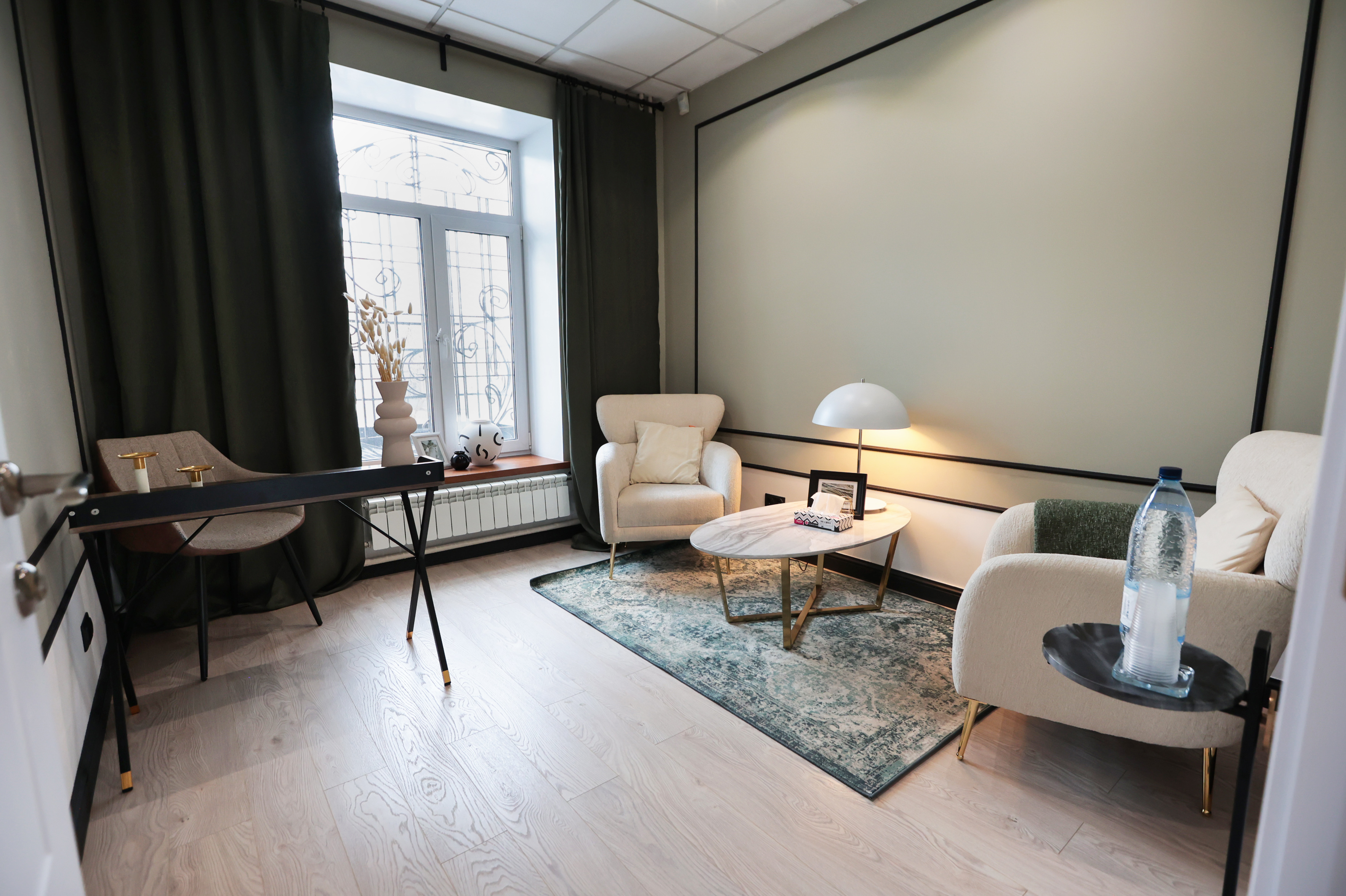 Просторный кабинет фисташкового цвета, для проведения индивидуальных и семейных консультаций, в том числе online.