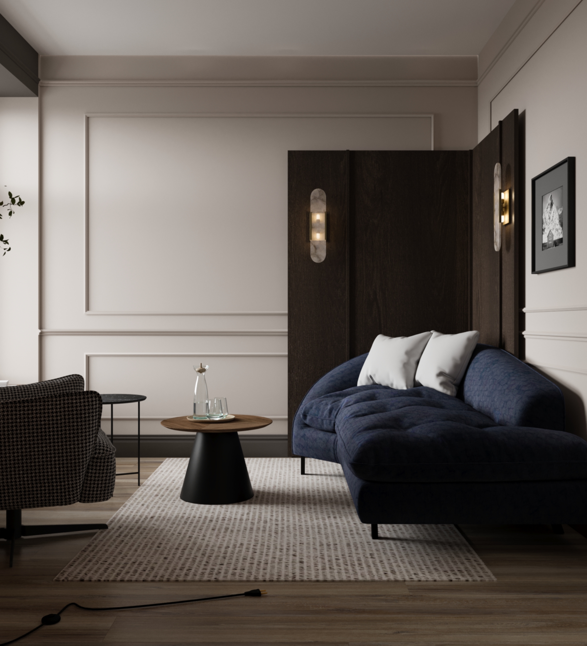 Бежевый кабинет с синей софой, лаконичный и стильный, строгий и уютный для проведения индивидуальных и семейных консультаций.
