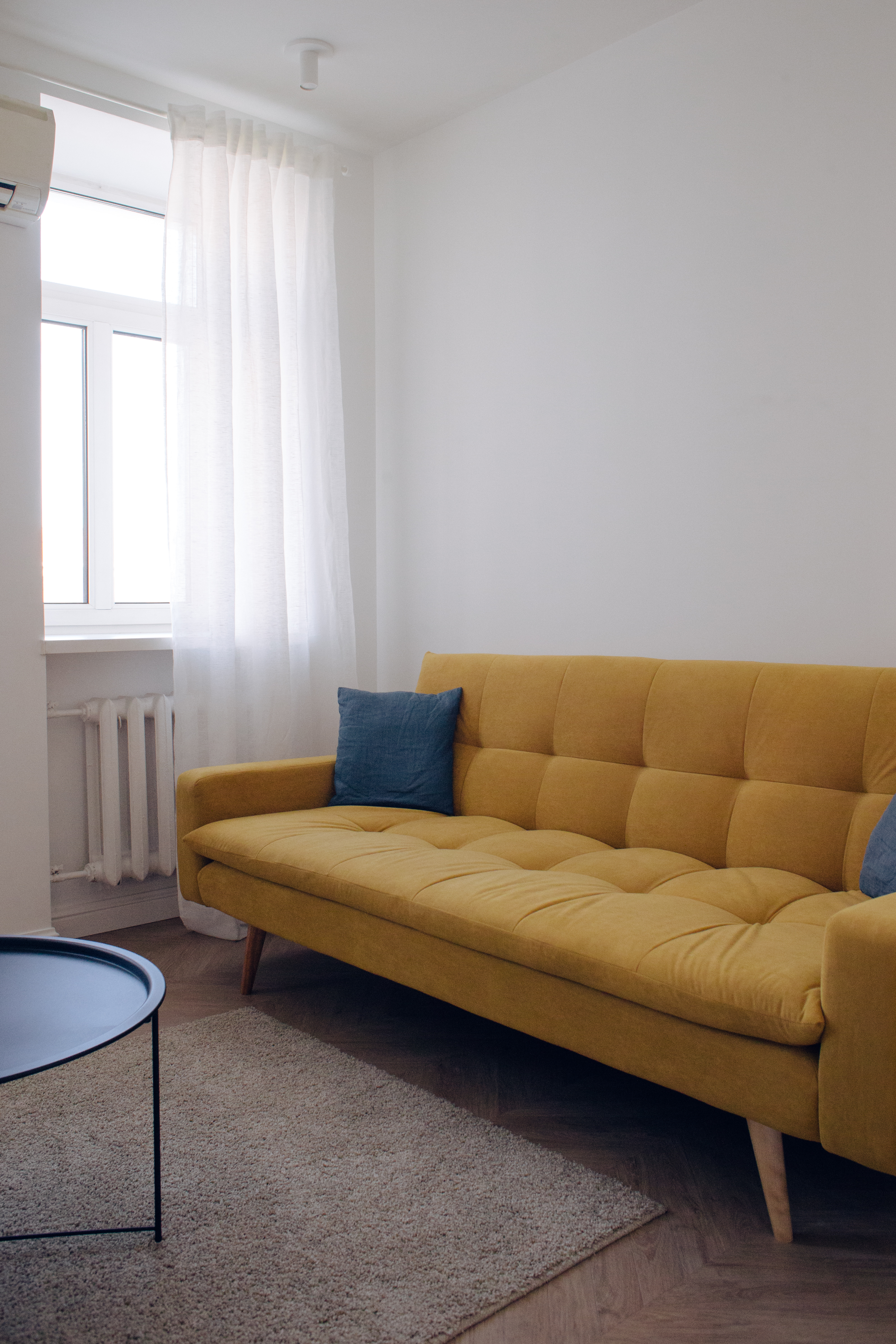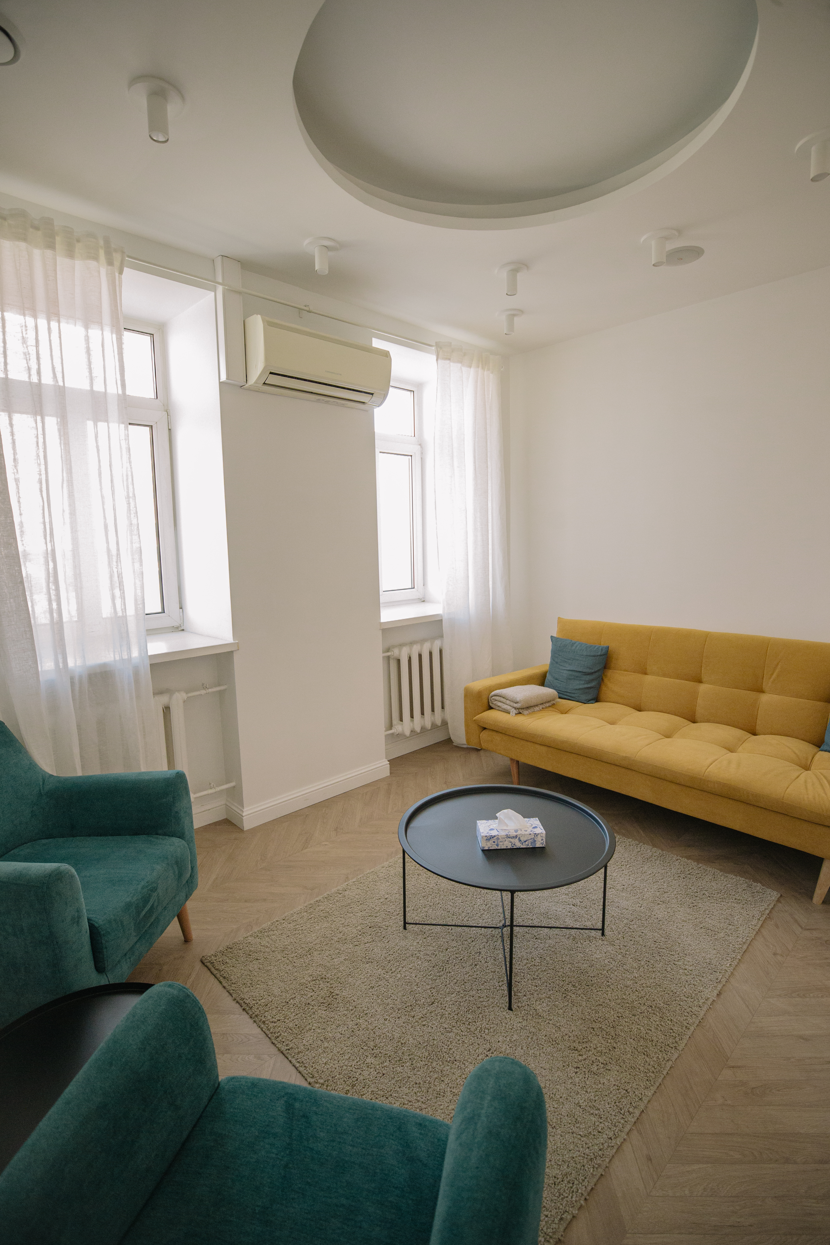 Кабинет в белых тонах с яркими акцентами в виде мягкой мебели, окна выходят на Б.Якиманку. В кабинете большой диван, два кресла, торшер, журнальные столики и кондиционер.