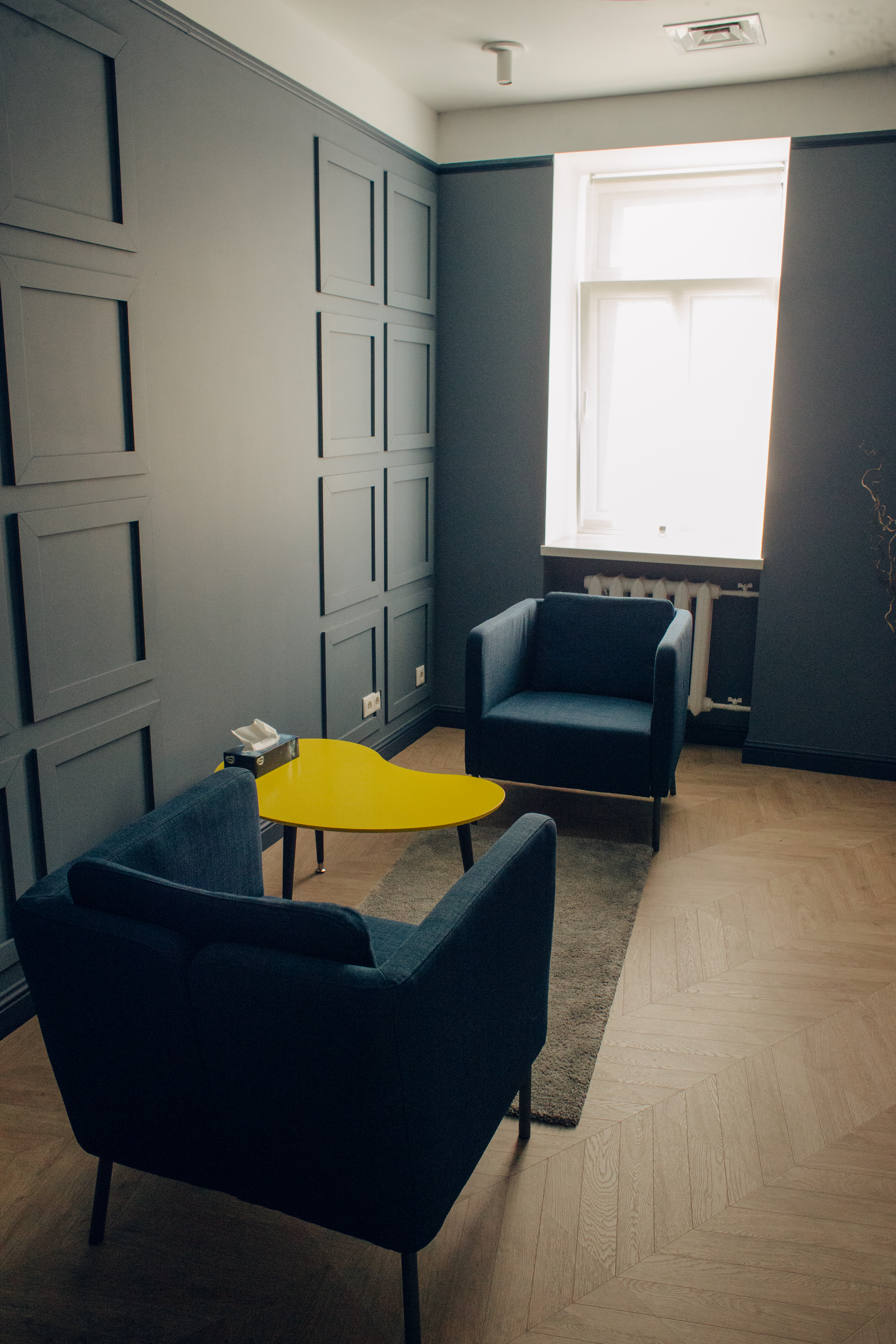Для индивидуальных консультаций и онлайн работы. 2 кресла, письменный стол.