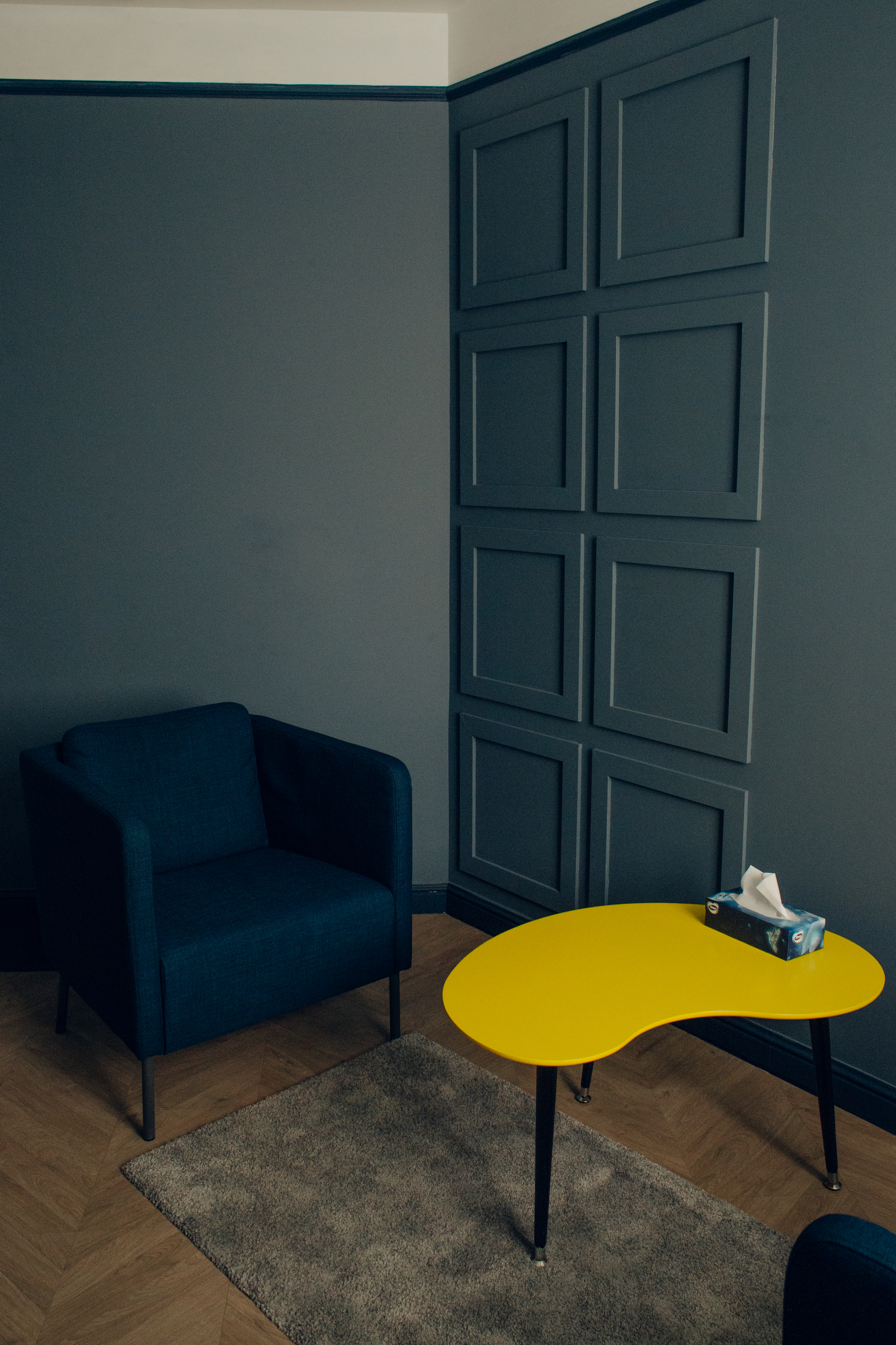 Для индивидуальных, семейных консультаций и онлайн работы. Диван, кресло, письменный стол.
