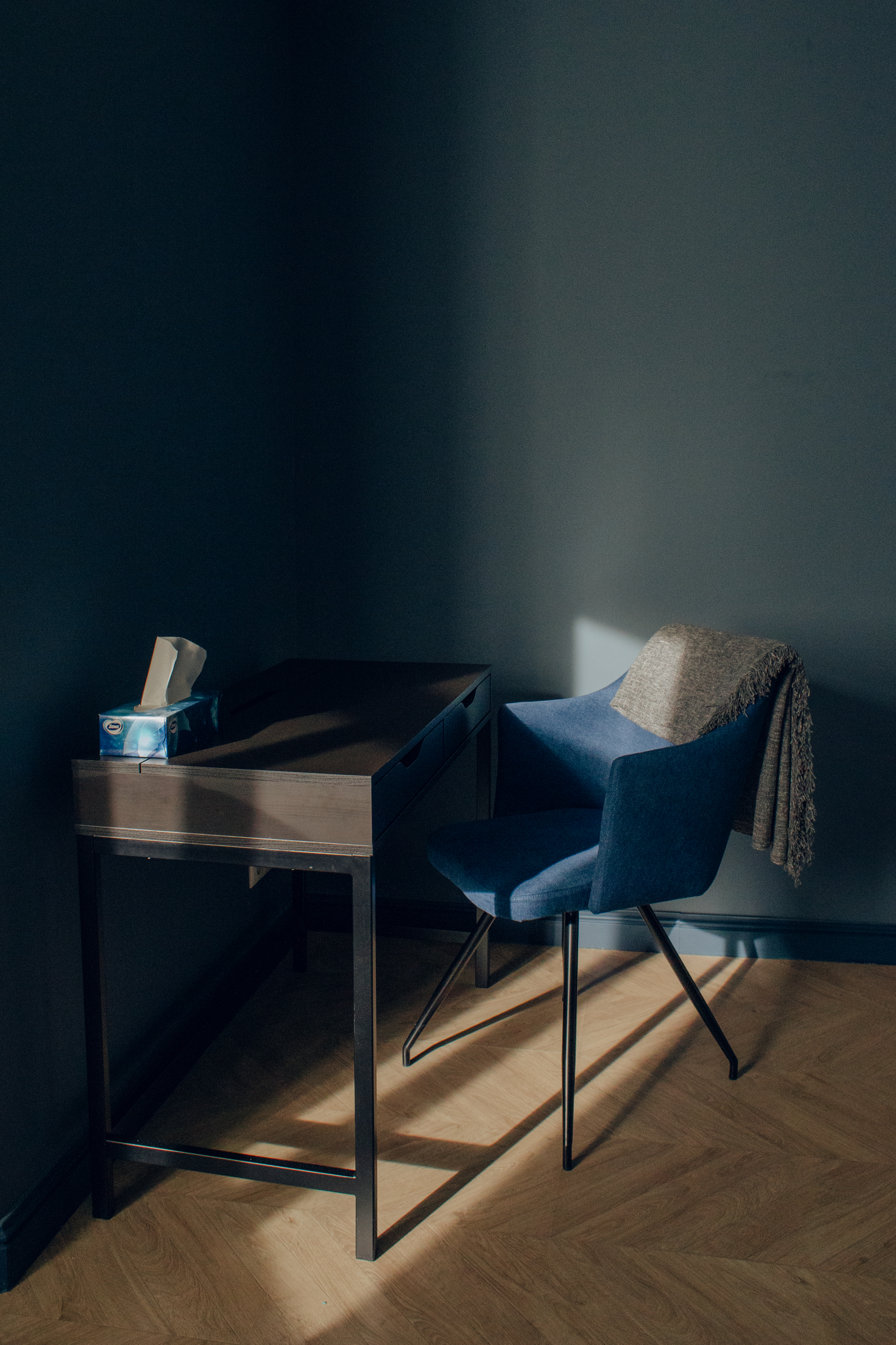 Стильный кабинет темно-синего цвета с яркими акцентами. Предусмотрено несколько уровней освещения, рабочая зона с письменным столом и стулом.
