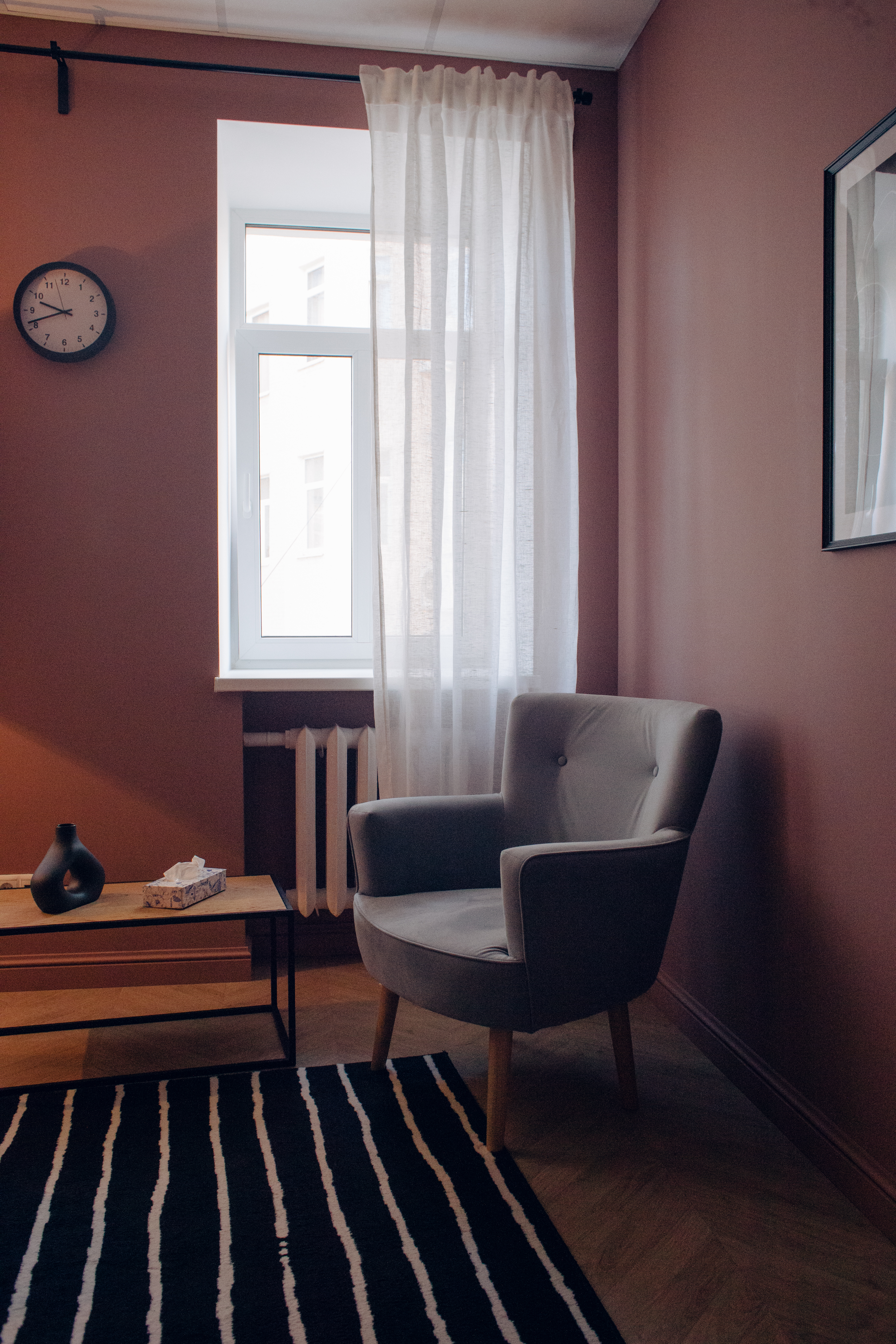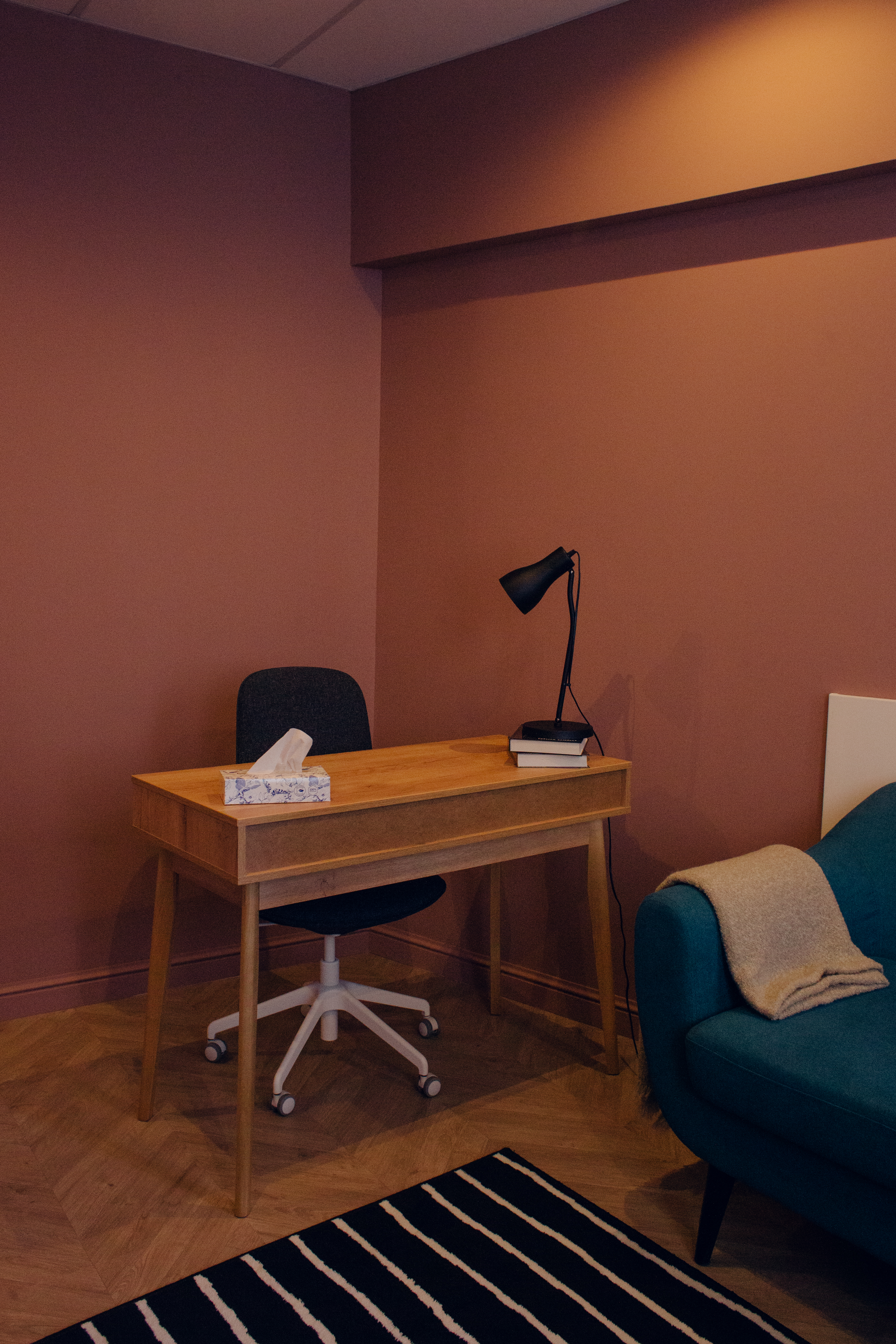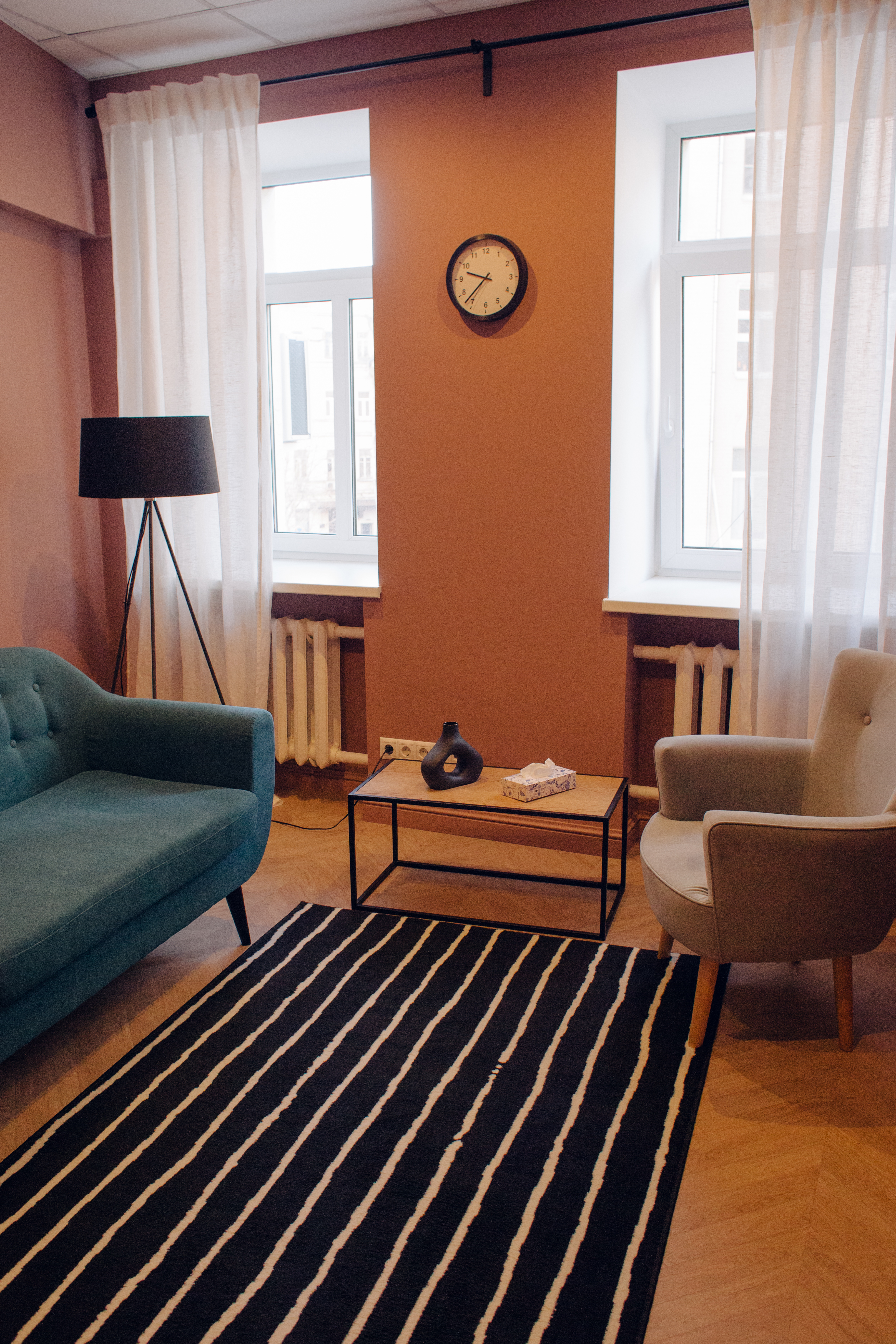 Яркий, контрастный кабинет с диваном, креслом и рабочей зоной. Окна выходят в тихий двор. Приглушенное основное освещение и торшер позволяют создать уютную атмосферу. Кабинет оборудований письменным столом и стулом для онлайн работы и ведения записей.