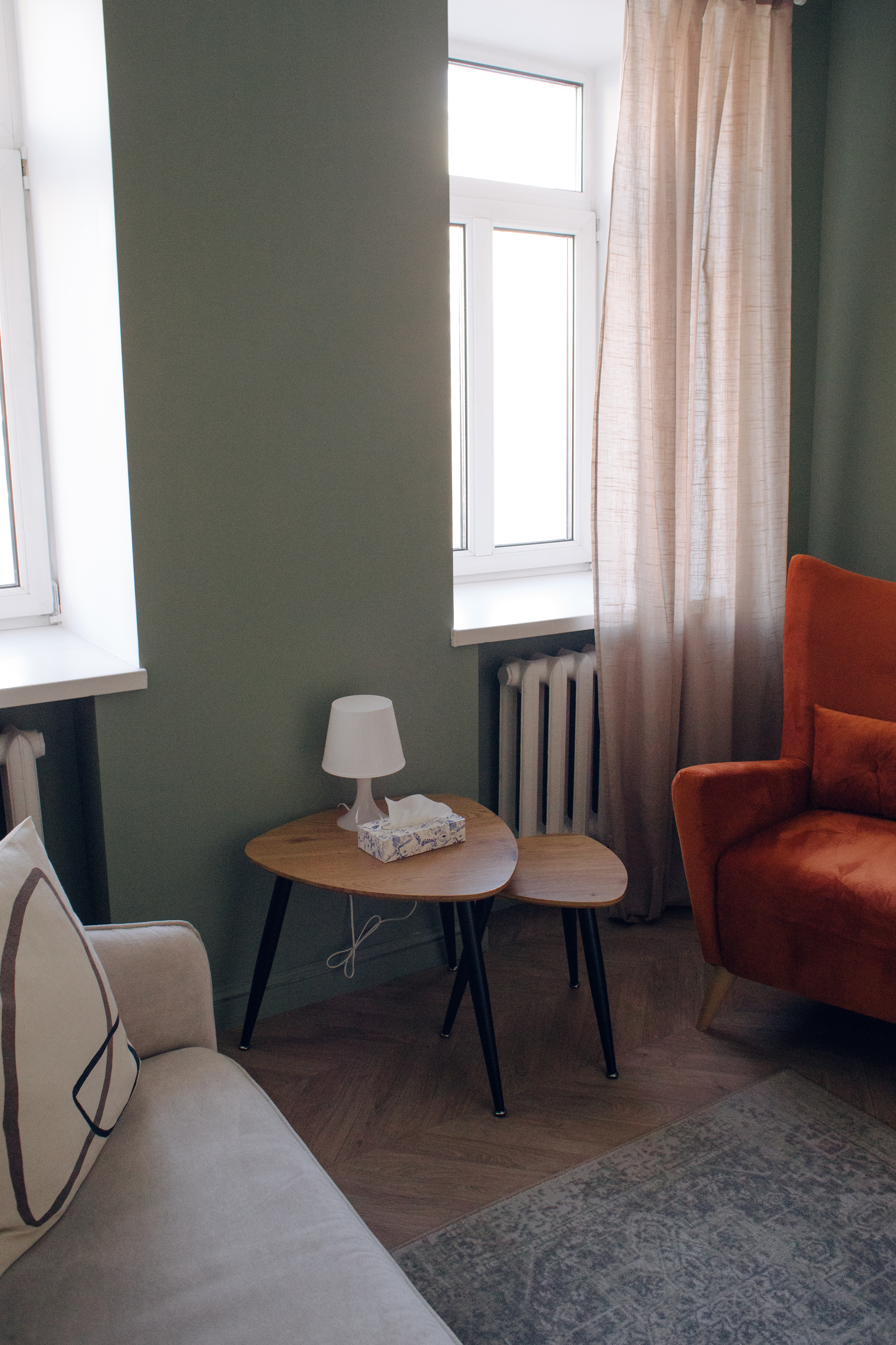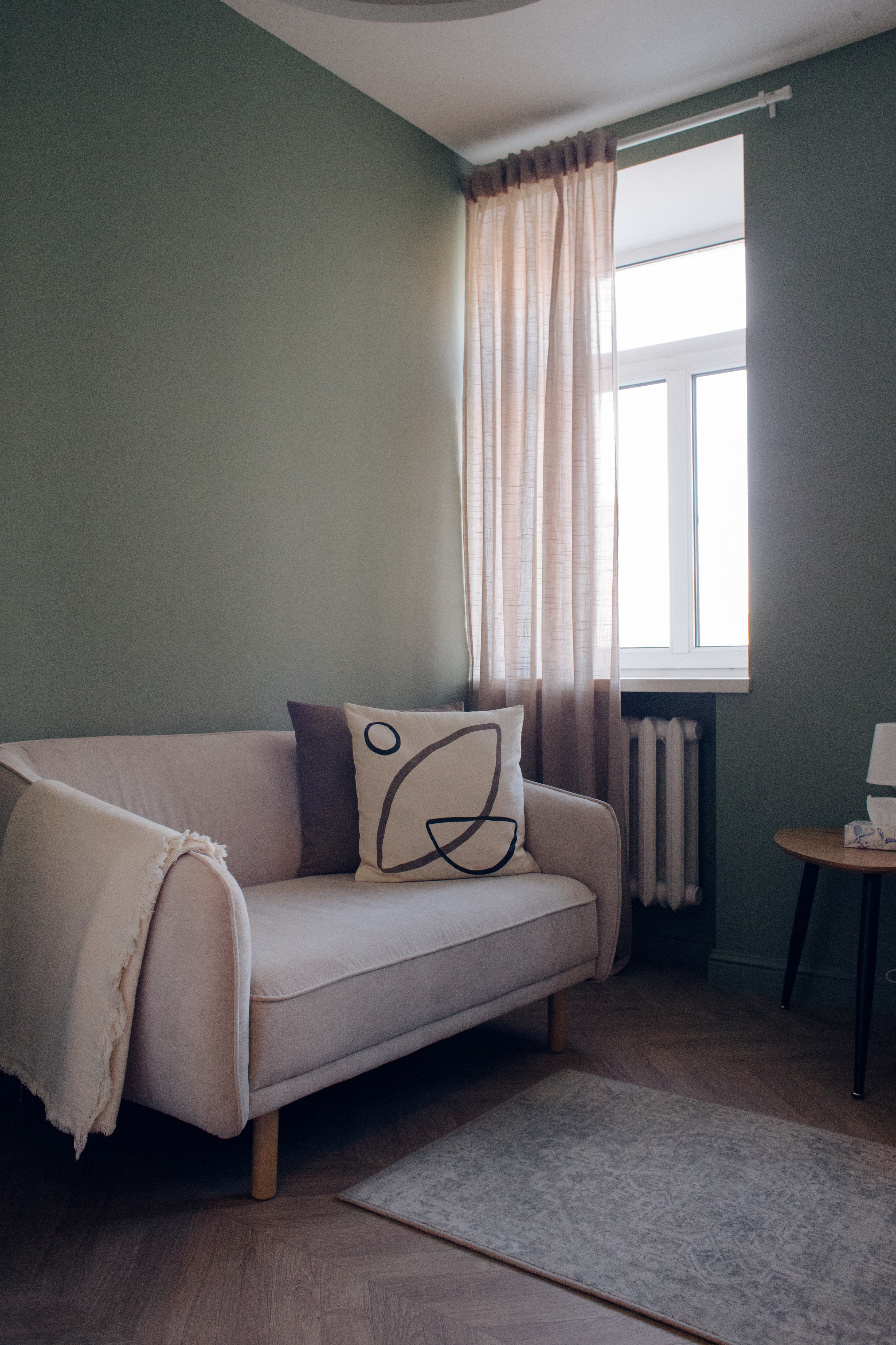Кабинет в приглушенных натуральных тонах с яркими акцентами в виде мягкой мебели. Диван дополнен подушками и пледом. Вид на Якиманку и Президент-отель.