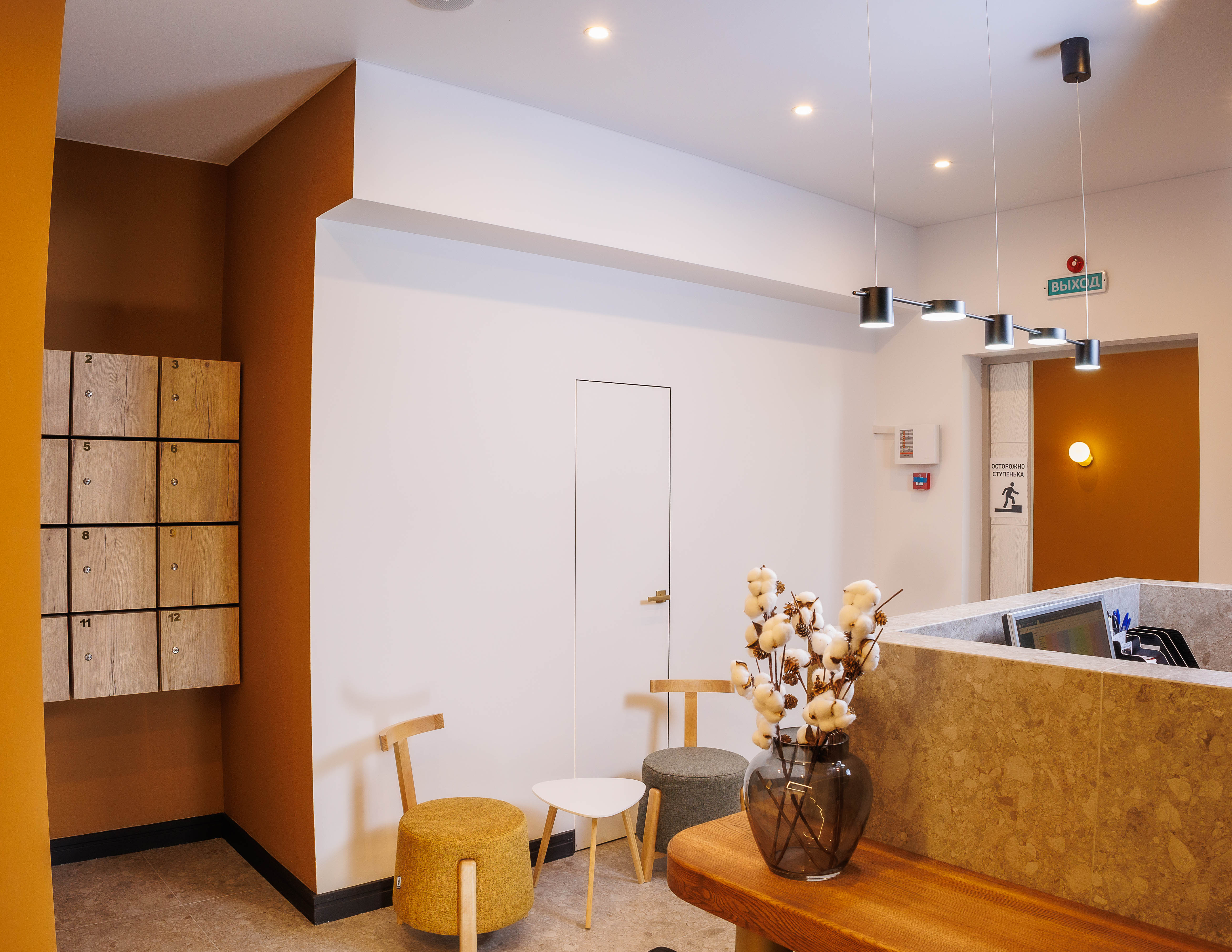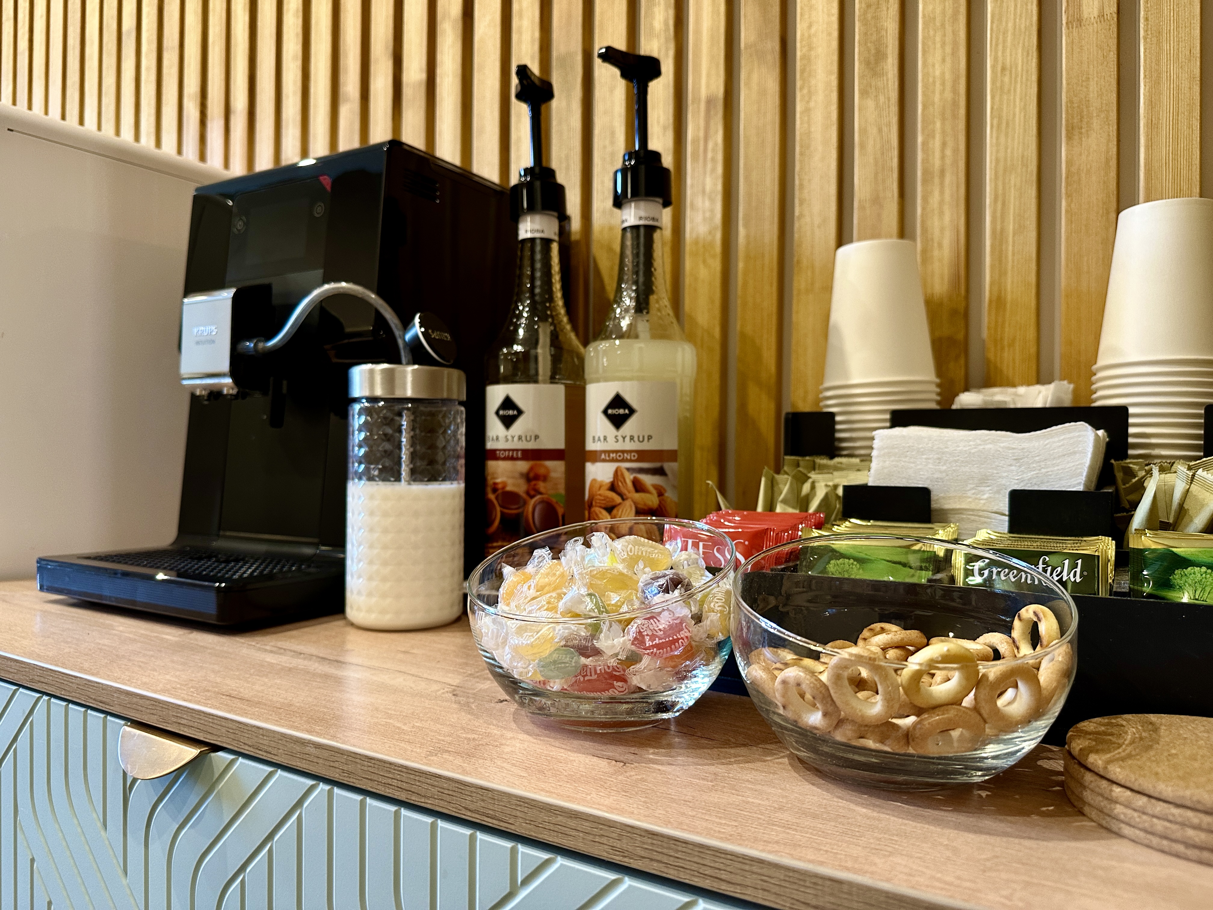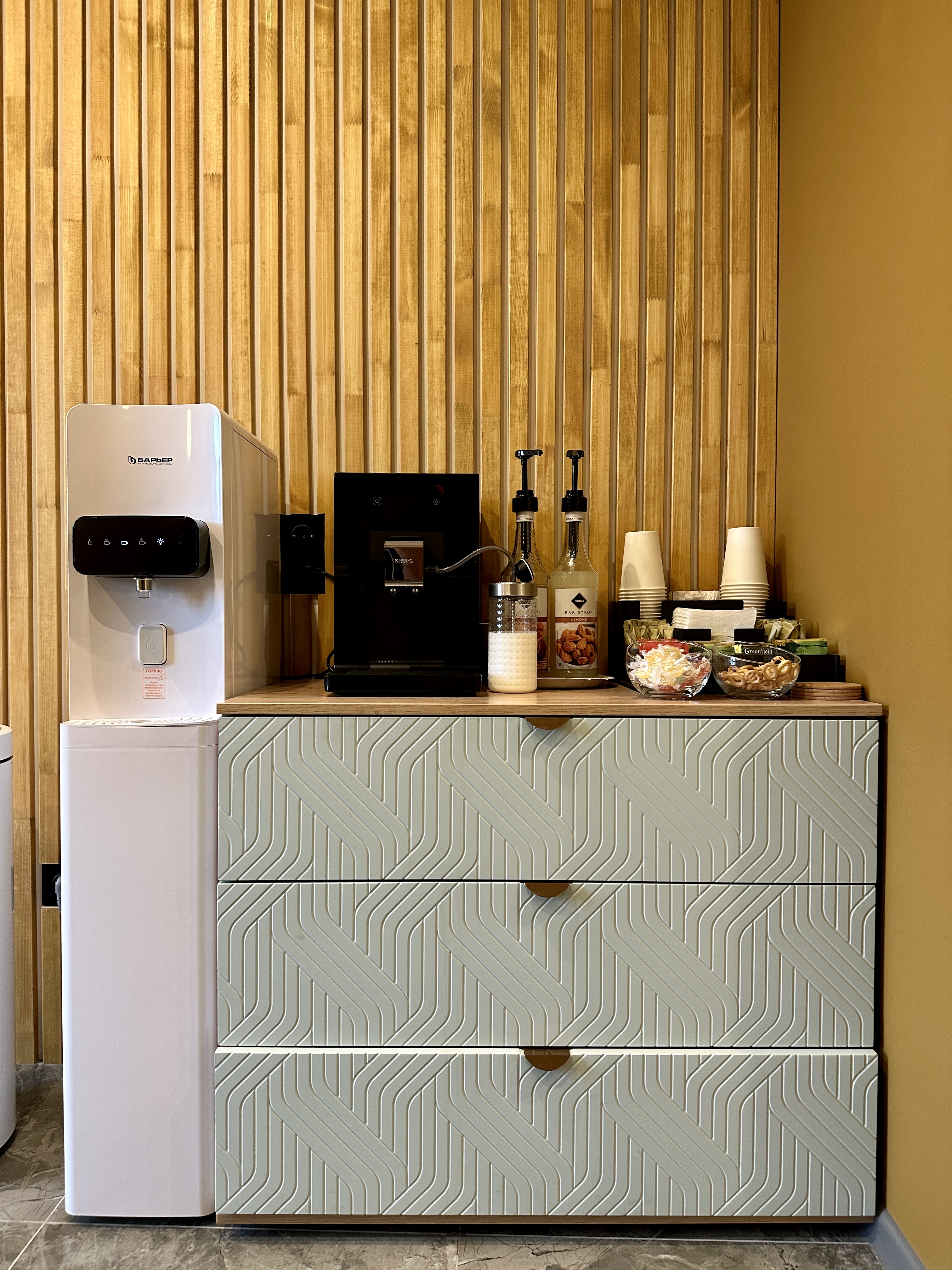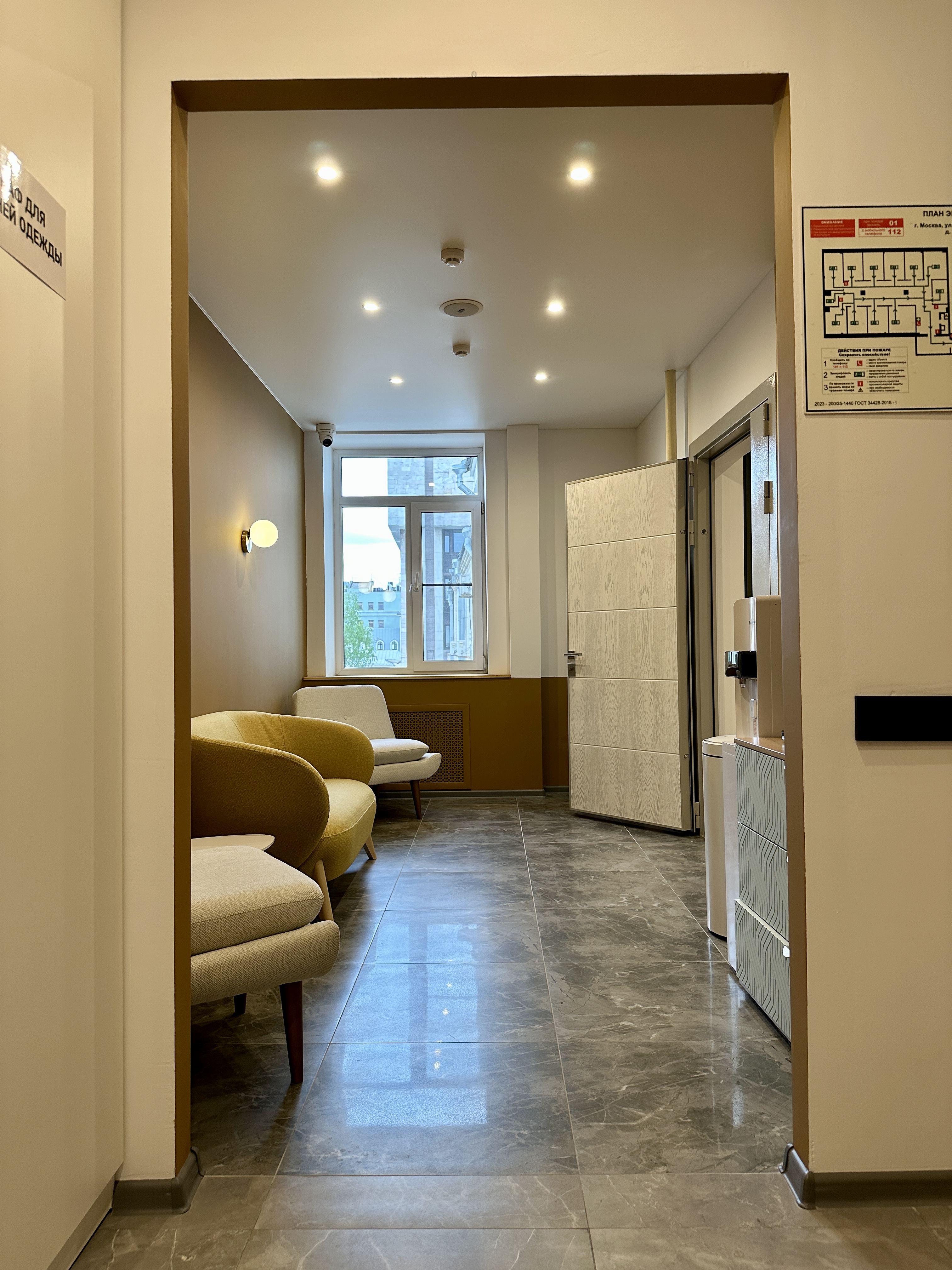 Перед входом на ресепшен располагается кофезона с диванчиком и креслами для ожидания, кофемашина, где можно сделать вкусный зерновой кофе, а так же чай, чистая питьевая вода и сушки.