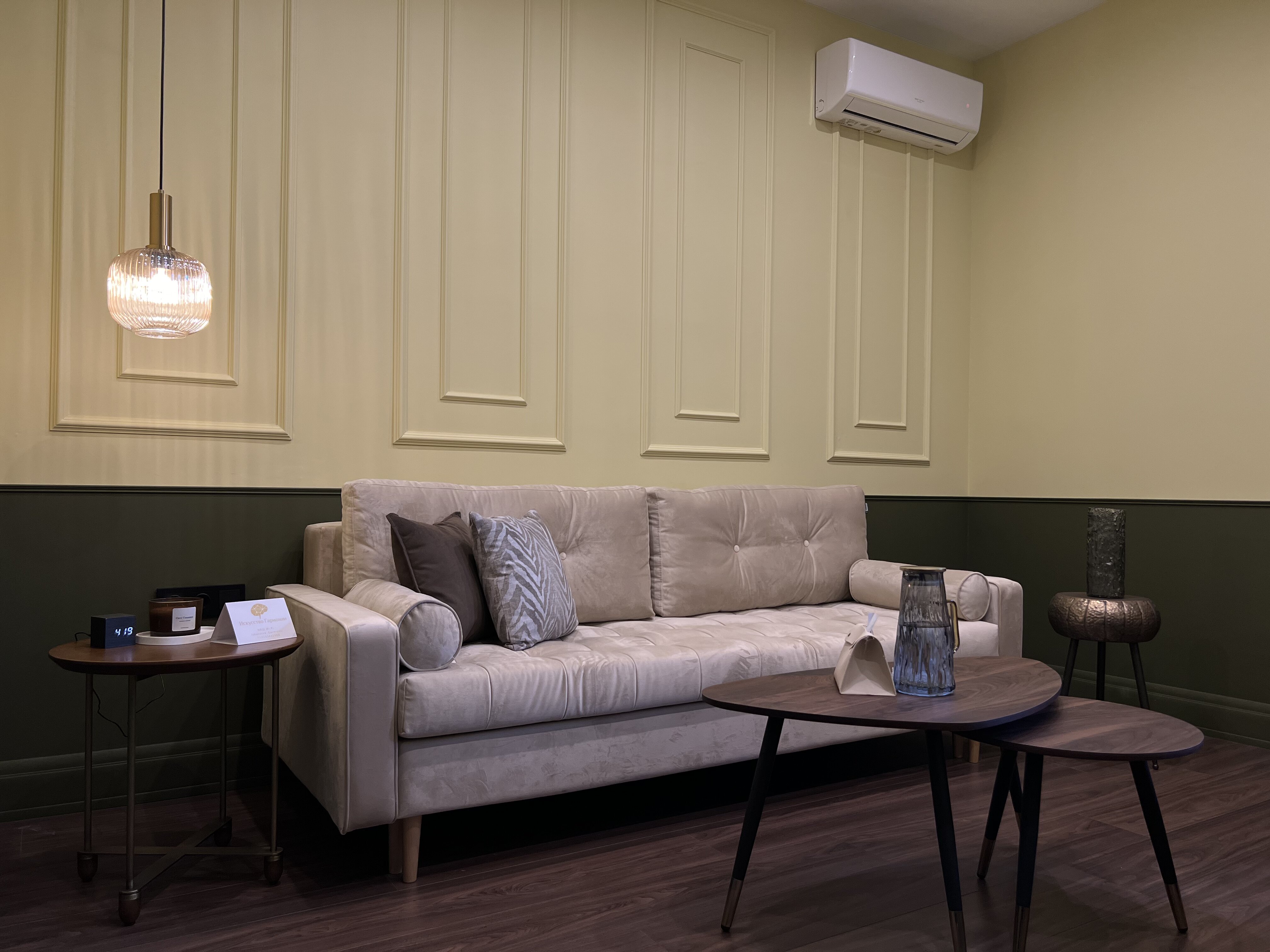 В кабинете: диван, одно кресло, журнальный столик, кондиционер.