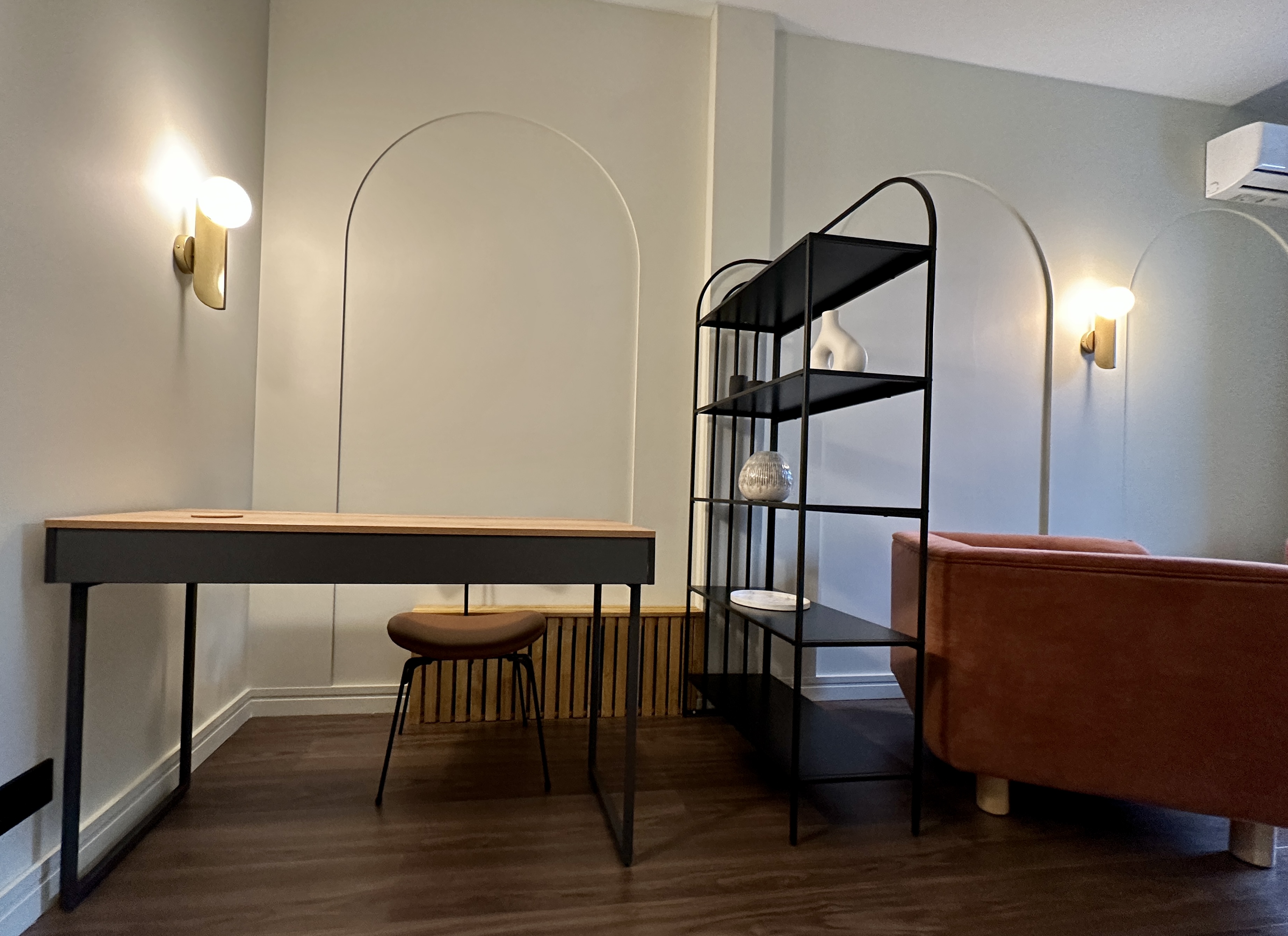 В кабинете: 3 кресла, журнальный столик, рабочий стол, стул, стеллаж, кондиционер.