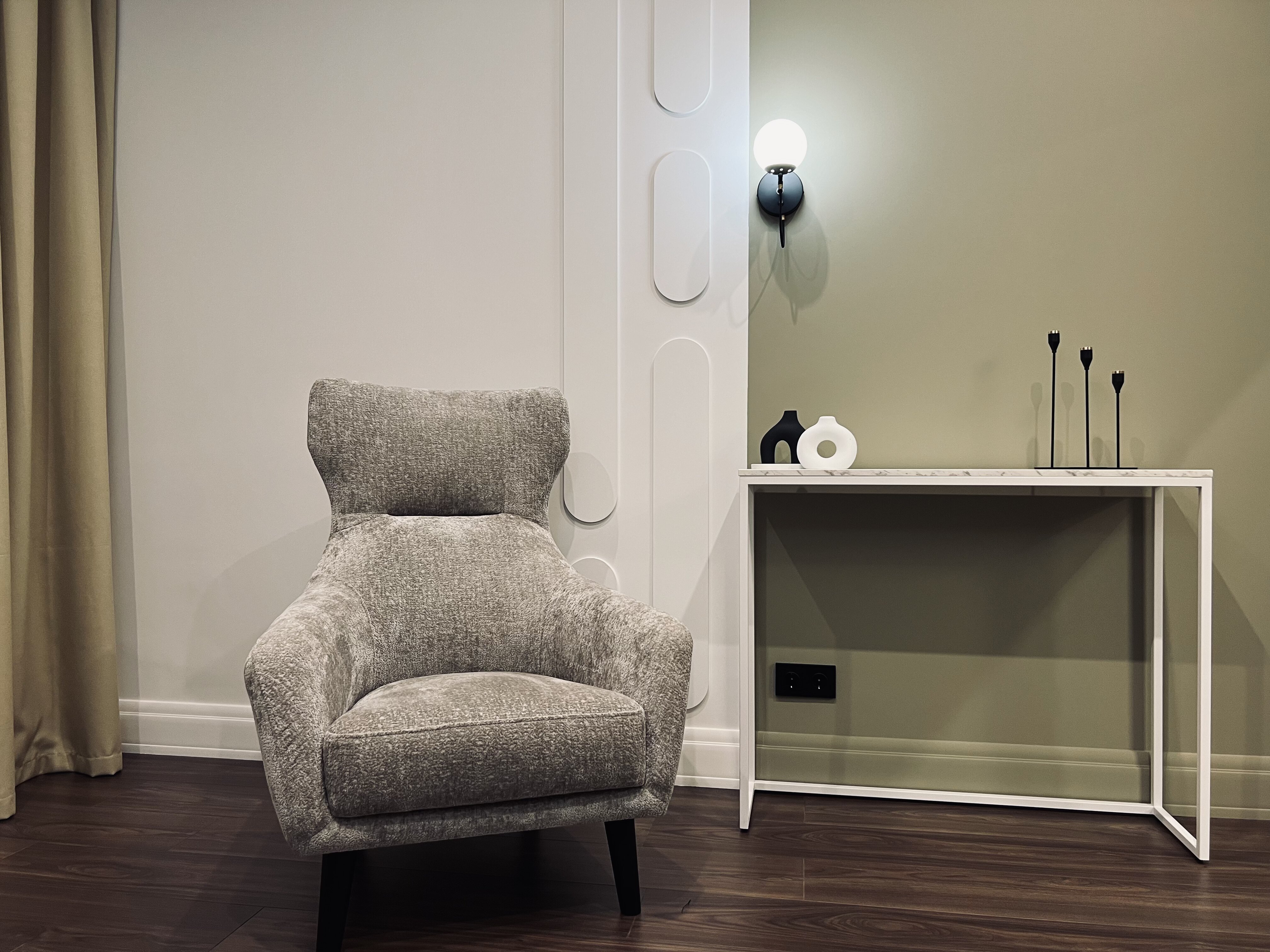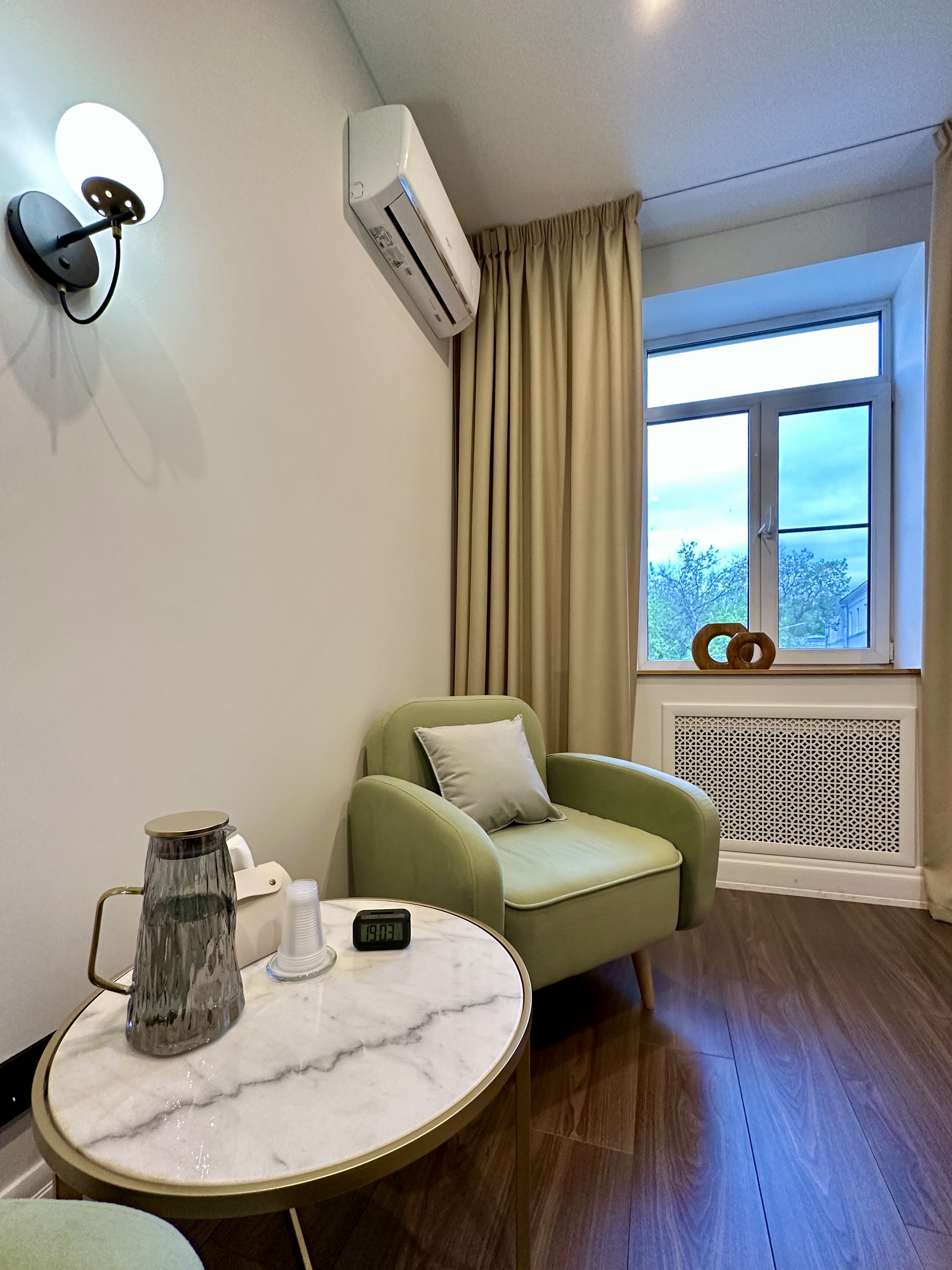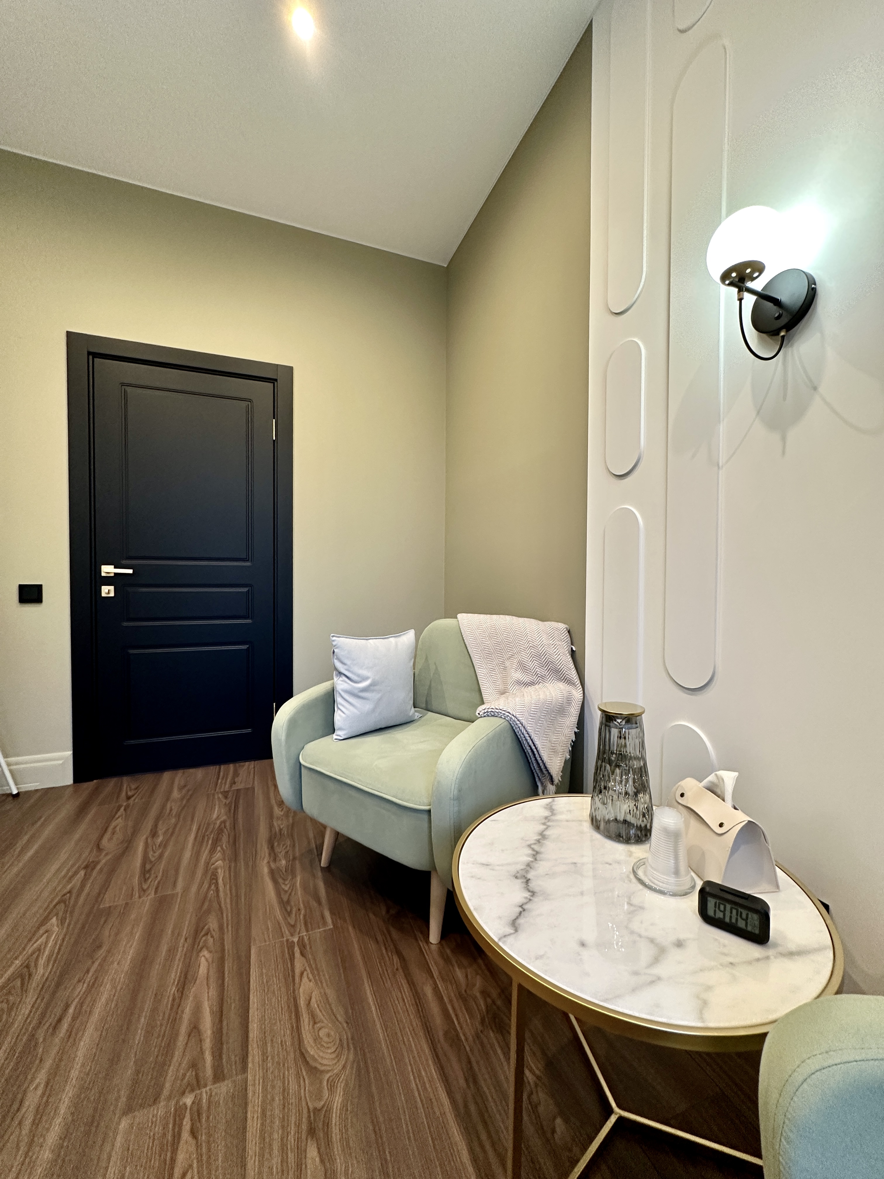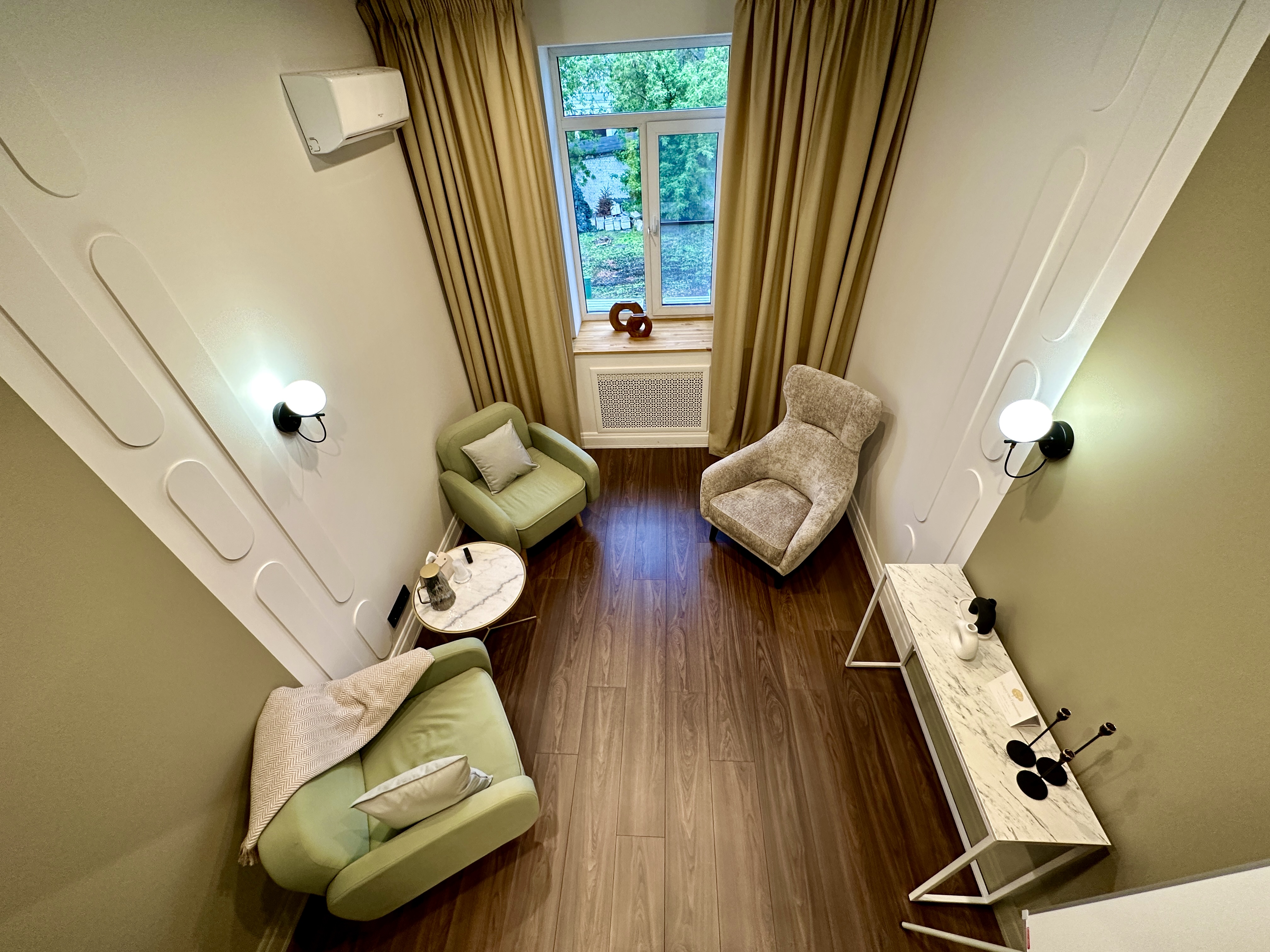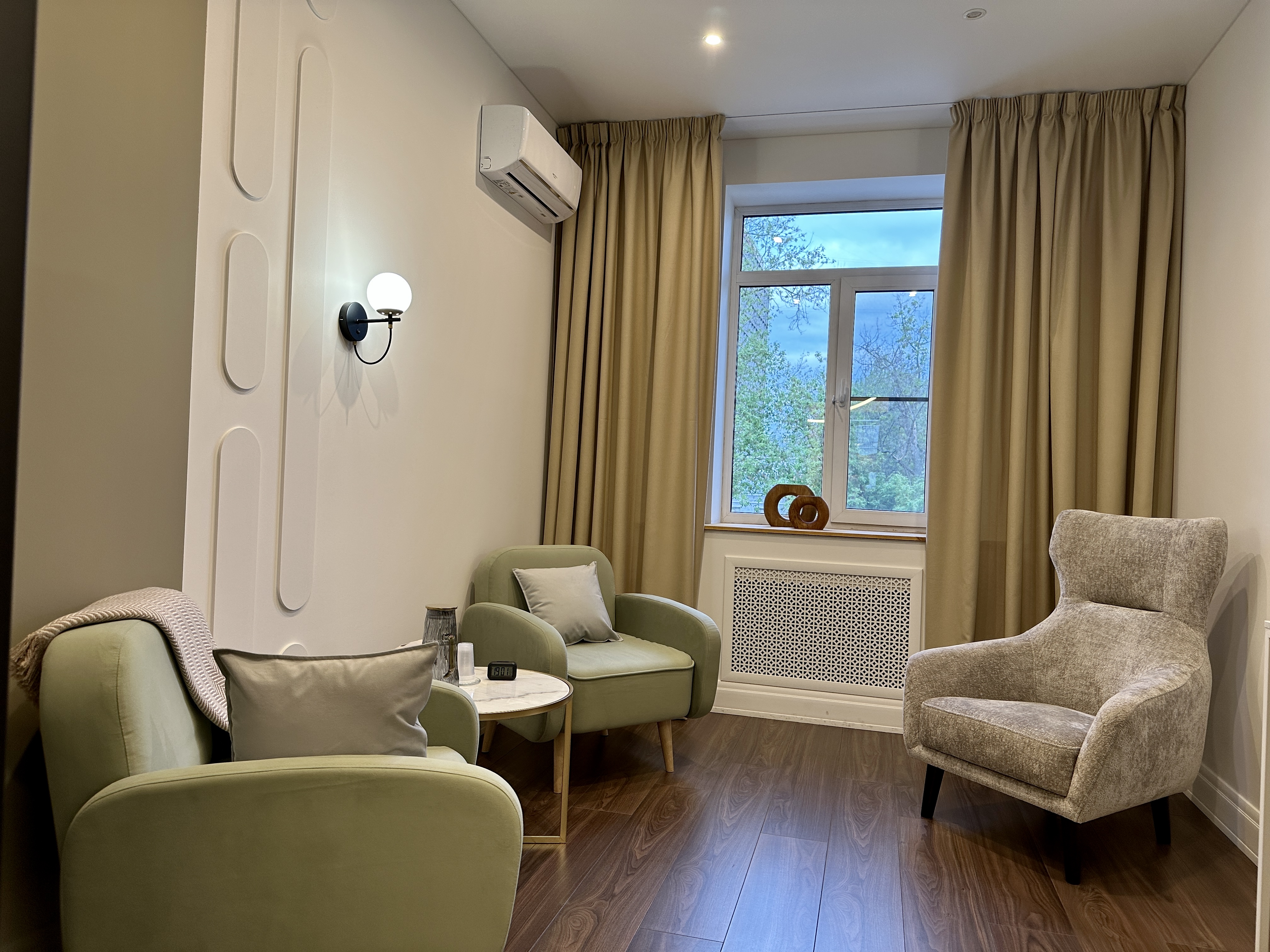 В кабинете 3 удобных, уютных кресла, журнальный столик. Общая цветовая гамма выдержана в светлых тонах.