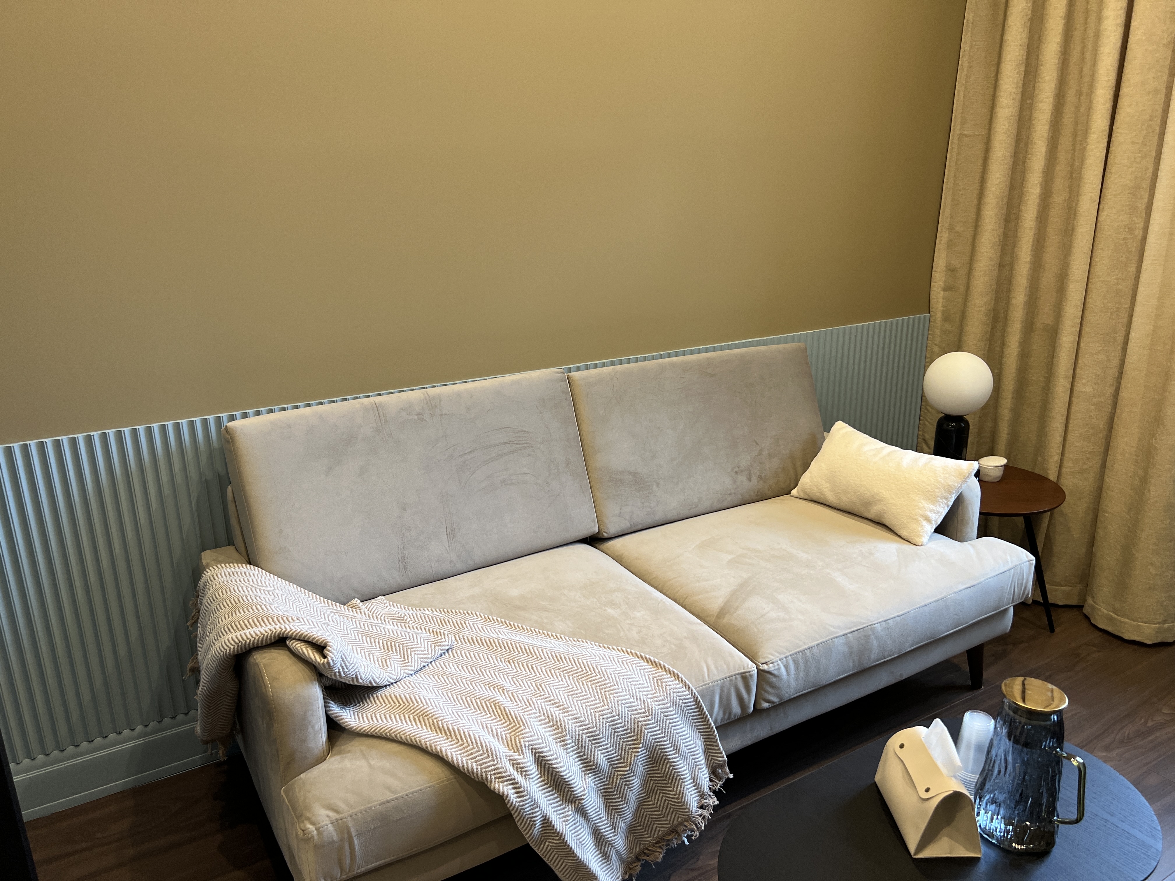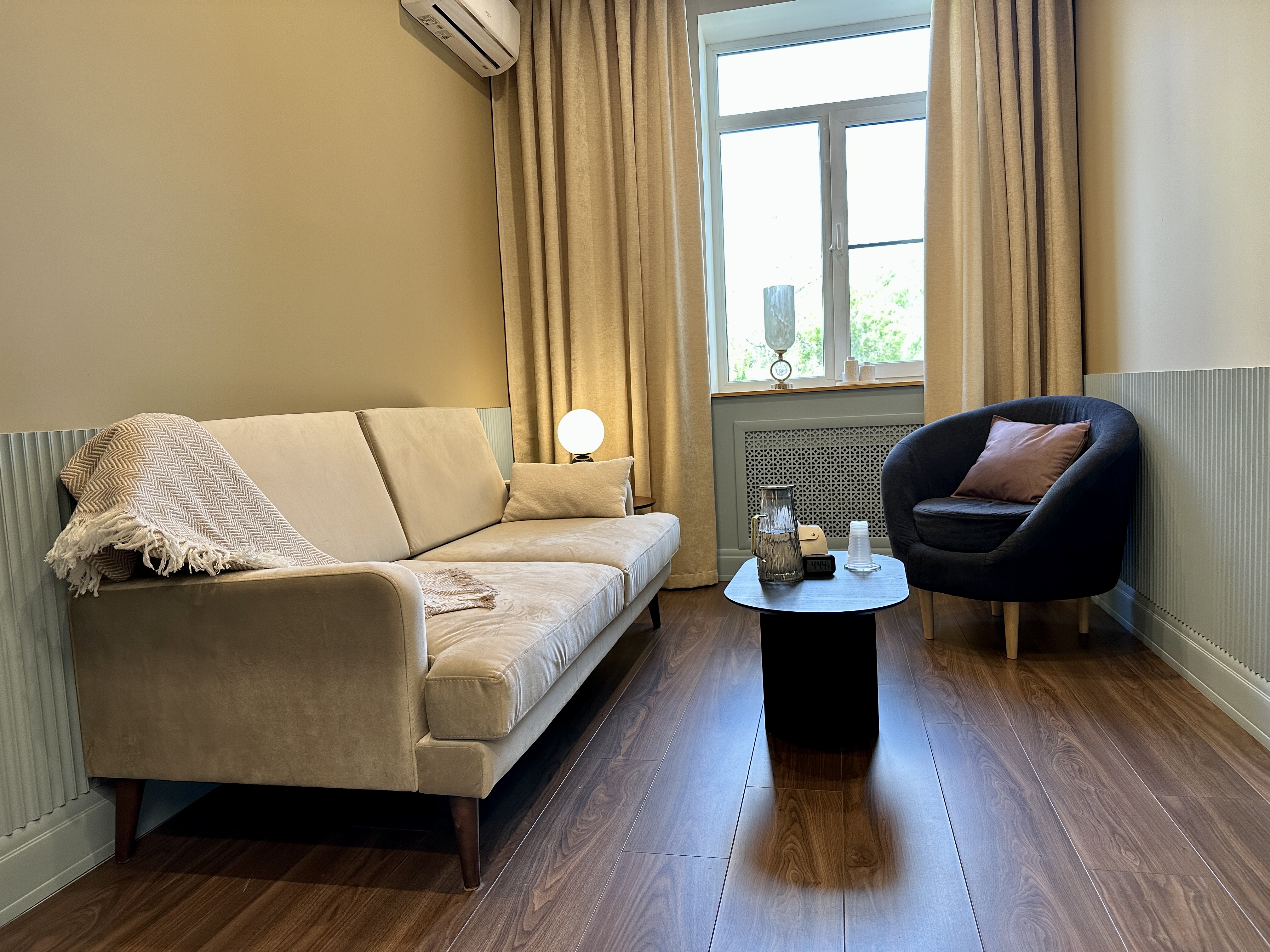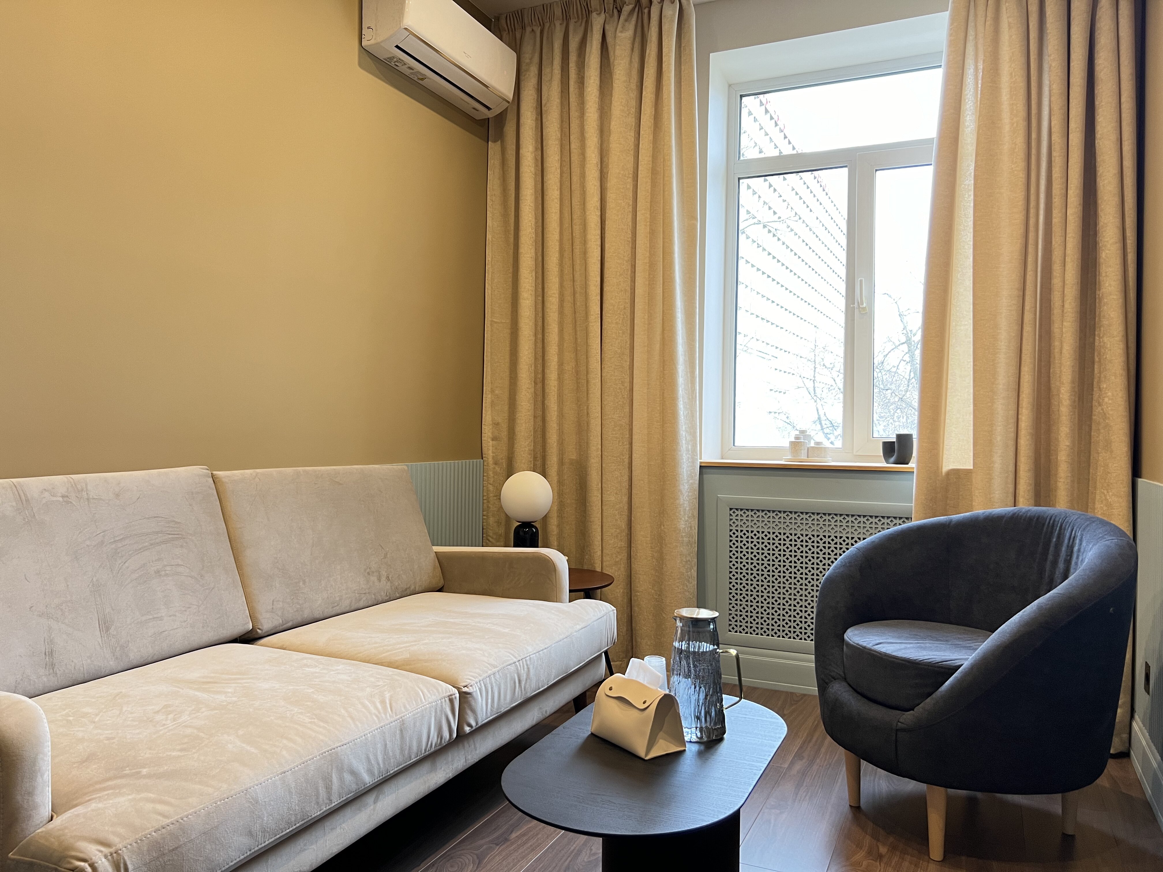 В кабинете: диван, кресло, журнальный столик, кондиционер.