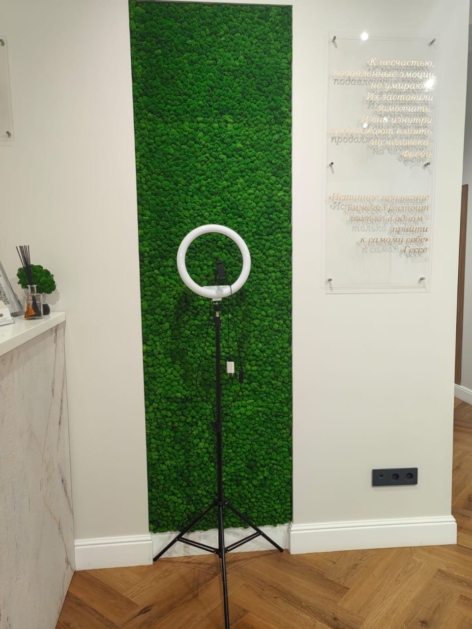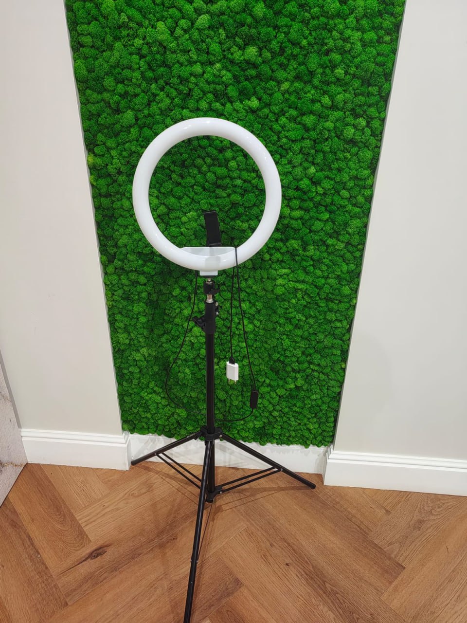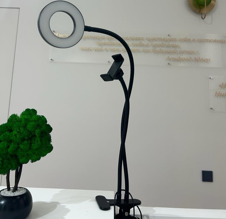Небольшая кольцевая лампа на прищепке. Диаметр кольца 9 см. Длина гибкой ножки 60 см. Ступенчатая регулировка яркости, 3 режима цветовой температуры. Рассеиватель отсутствует. Есть держатель для телефона. Подходит для создания более объемной картинки при ведении консультаций по видео-связи.
