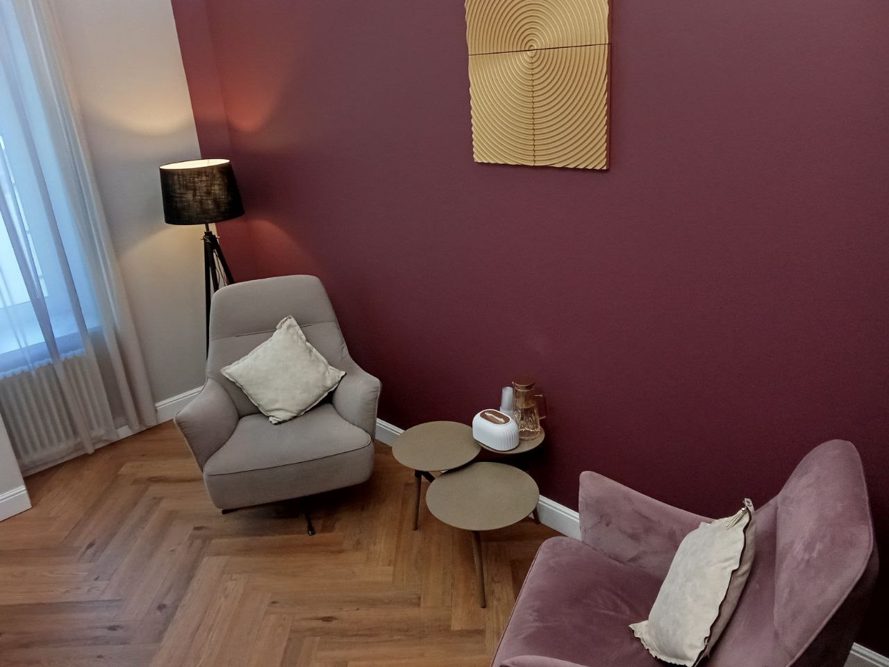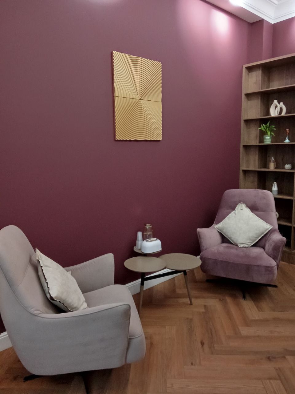 Общая цветовая гамма обстановки выдержана в современных интерьерных решениях. В данном кабинете приятно находиться. Стильное, гармоничное и комфортное помещение создает доверительную, свободную обстановку. Поэтому посетитель, который пришел на прием к психологу, уверенно и спокойно может обсудить все существующие проблемы.