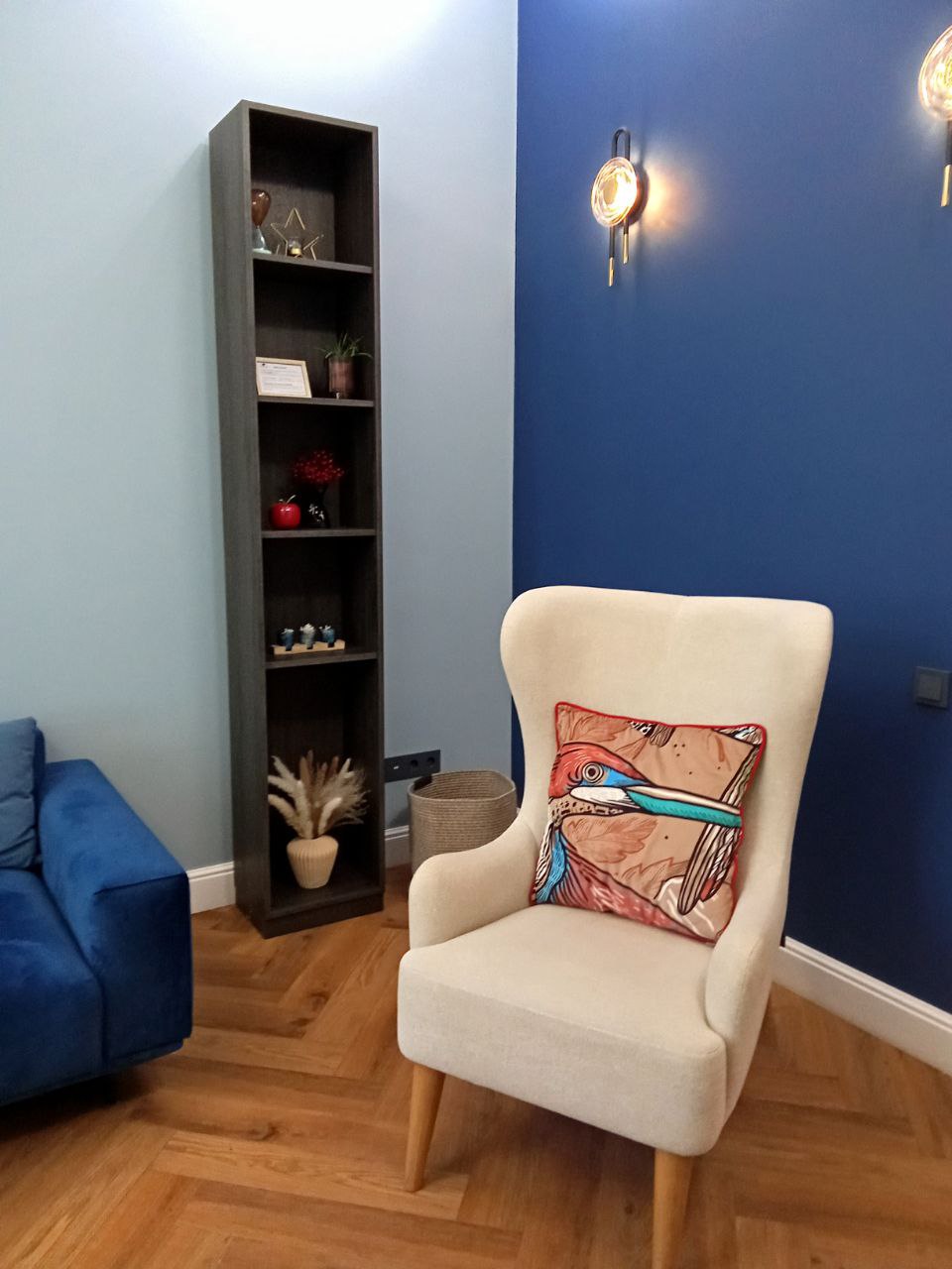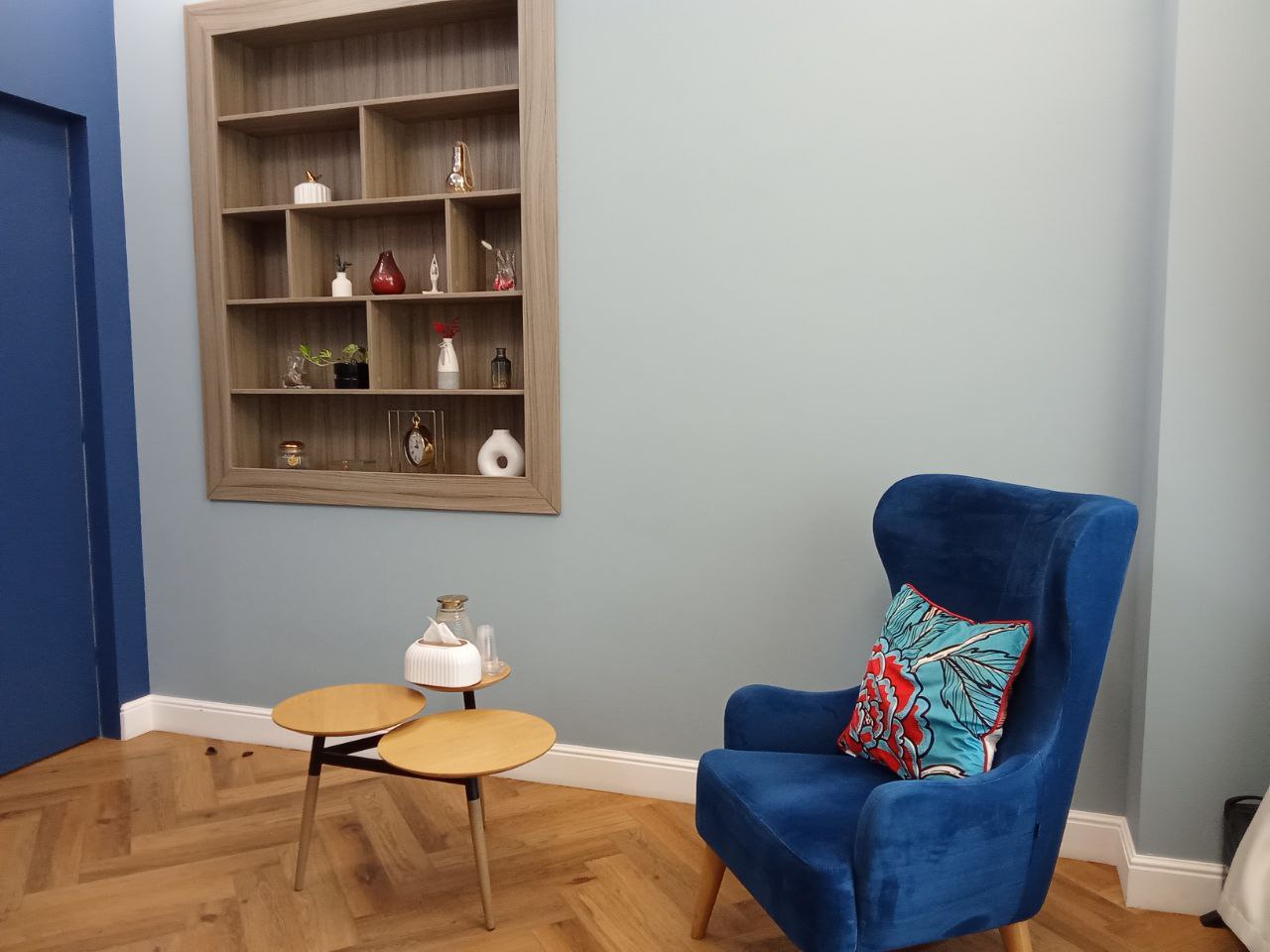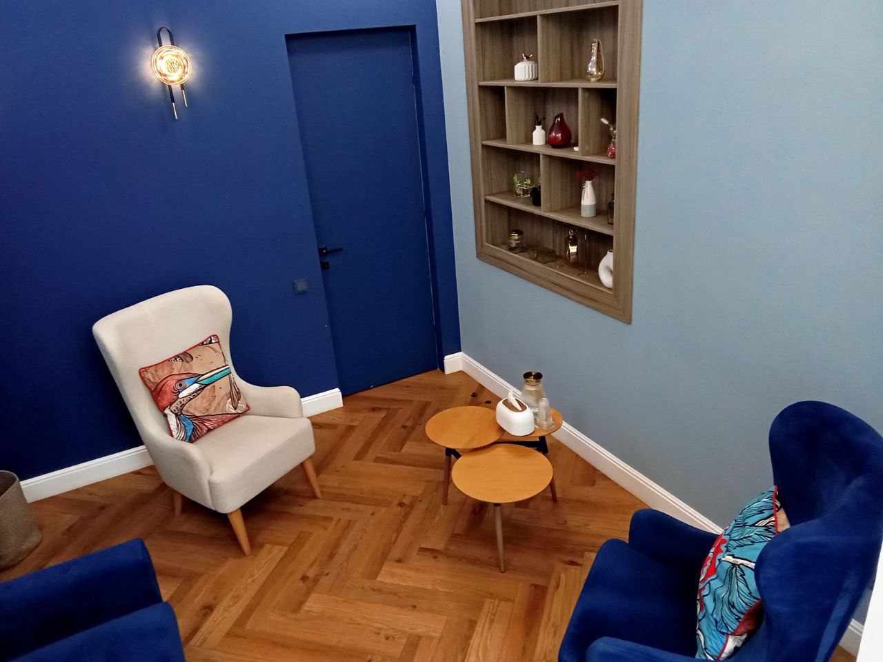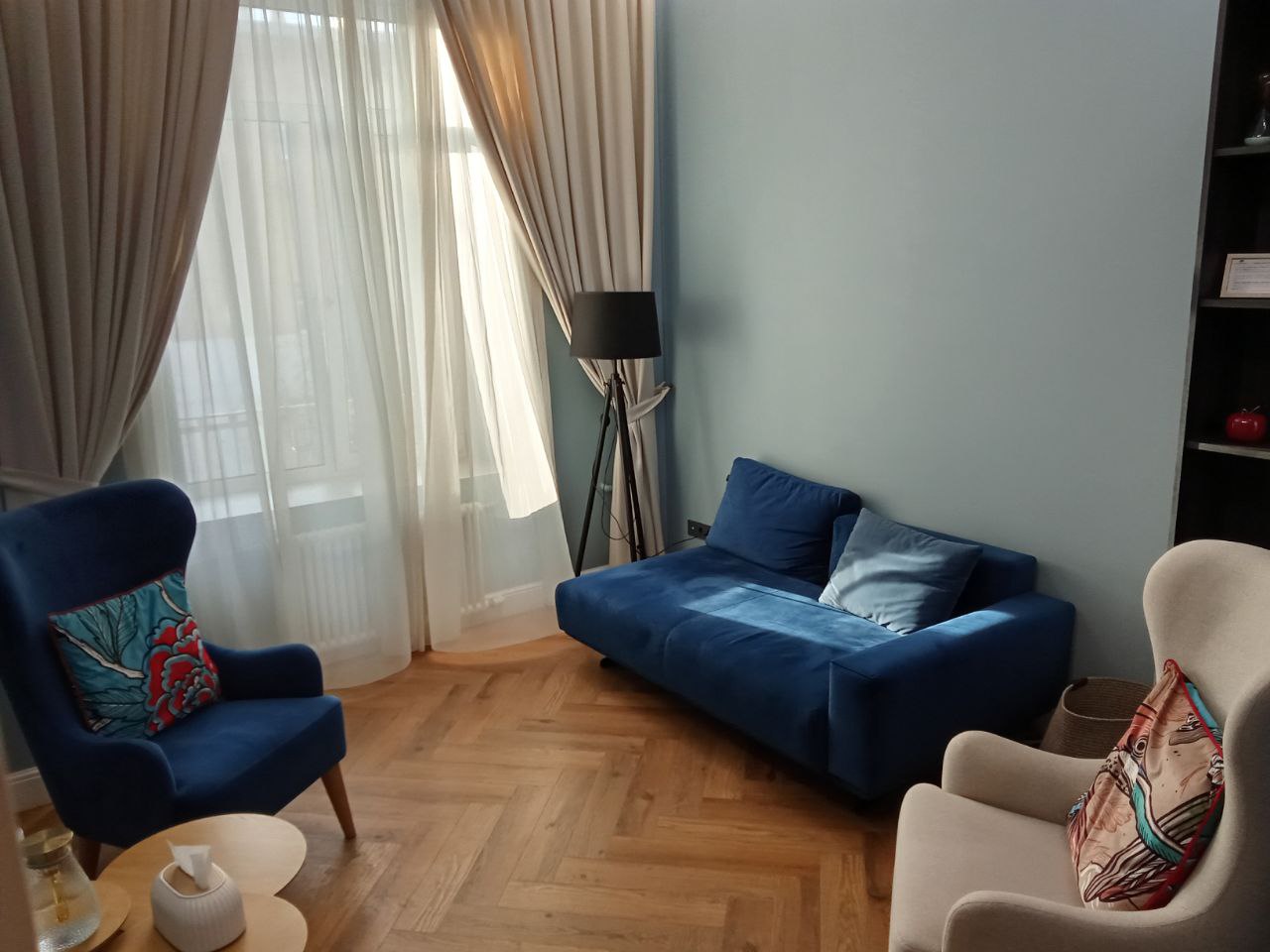 Общая цветовая гамма обстановки выдержана в современных интерьерных решениях. В данном кабинете приятно находиться. Стильное, гармоничное и комфортное помещение создает доверительную, свободную обстановку. Поэтому посетитель, который пришел на прием к психологу, уверенно и спокойно может обсудить все существующие проблемы.