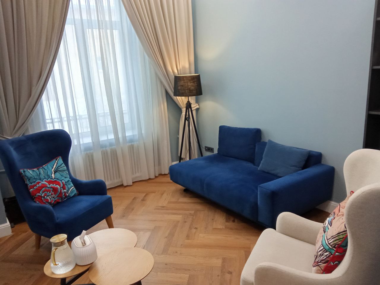 Кабинет оснащен большими удобными креслами, кушеткой, журнальным столиком и торшером.