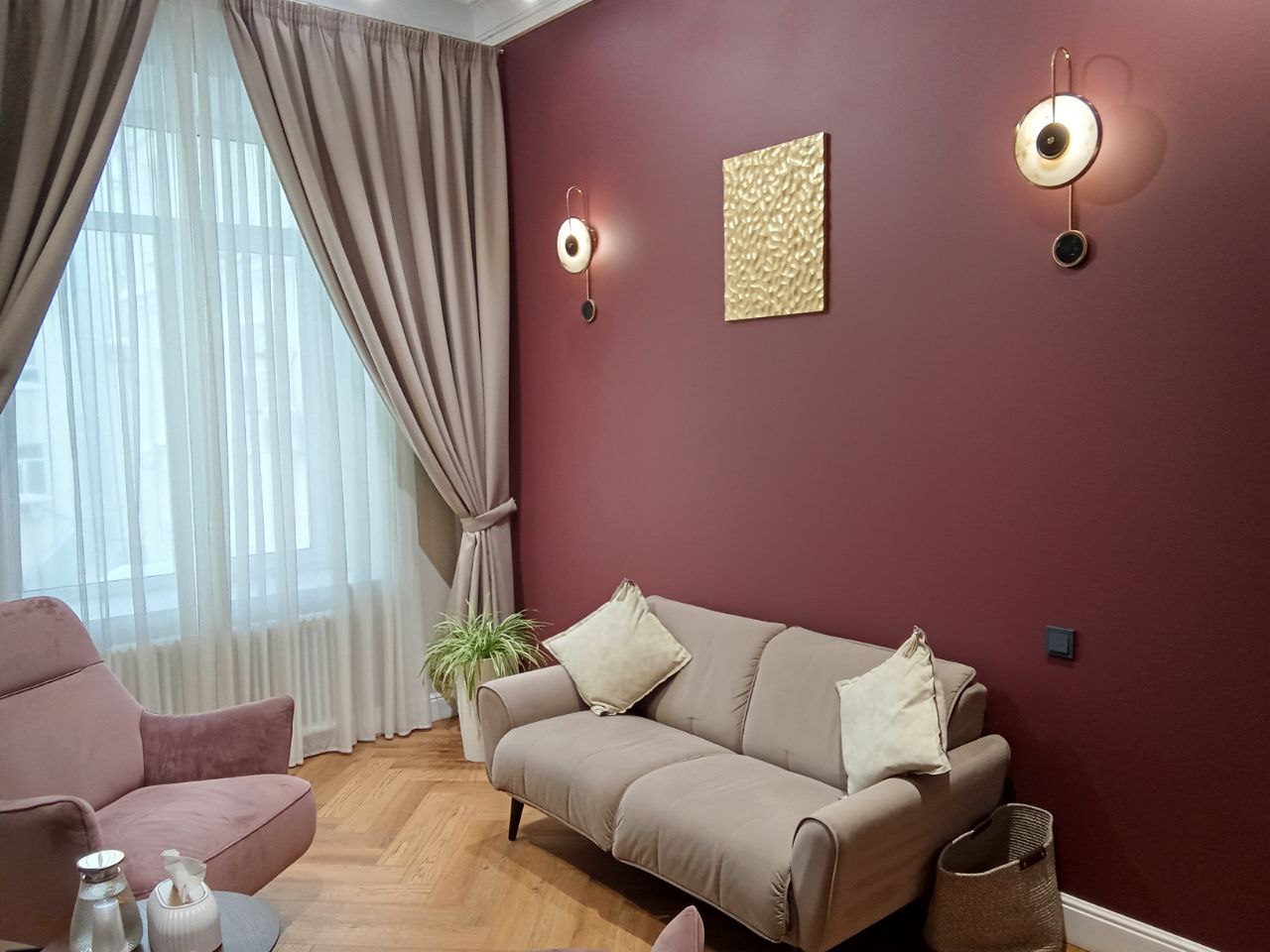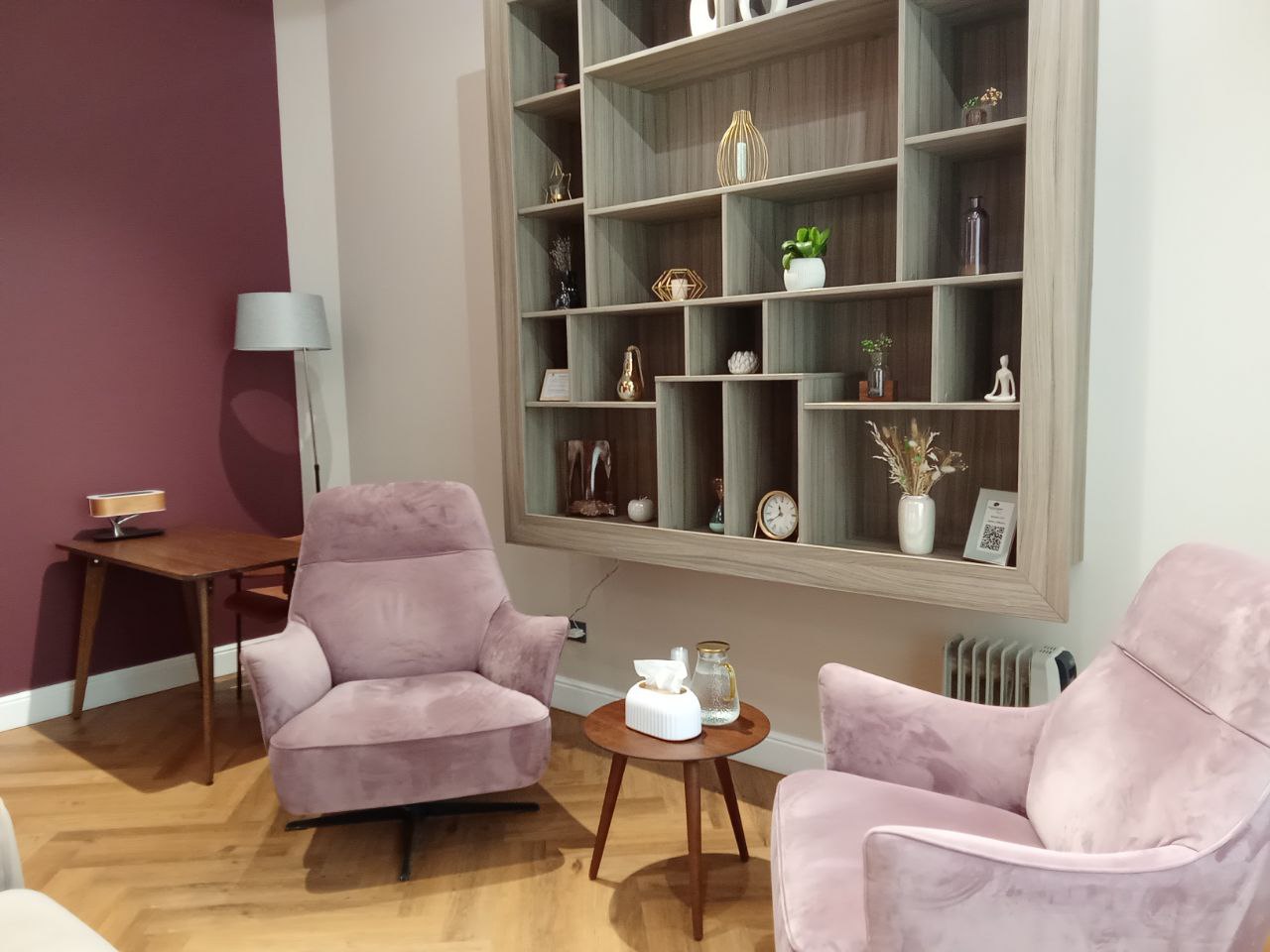 Общая цветовая гамма обстановки выдержана в современных интерьерных решениях. В данном кабинете приятно находиться. Стильное, гармоничное и комфортное помещение создает доверительную, свободную обстановку. Поэтому посетитель, который пришел на прием к психологу, уверенно и спокойно может обсудить все существующие проблемы.