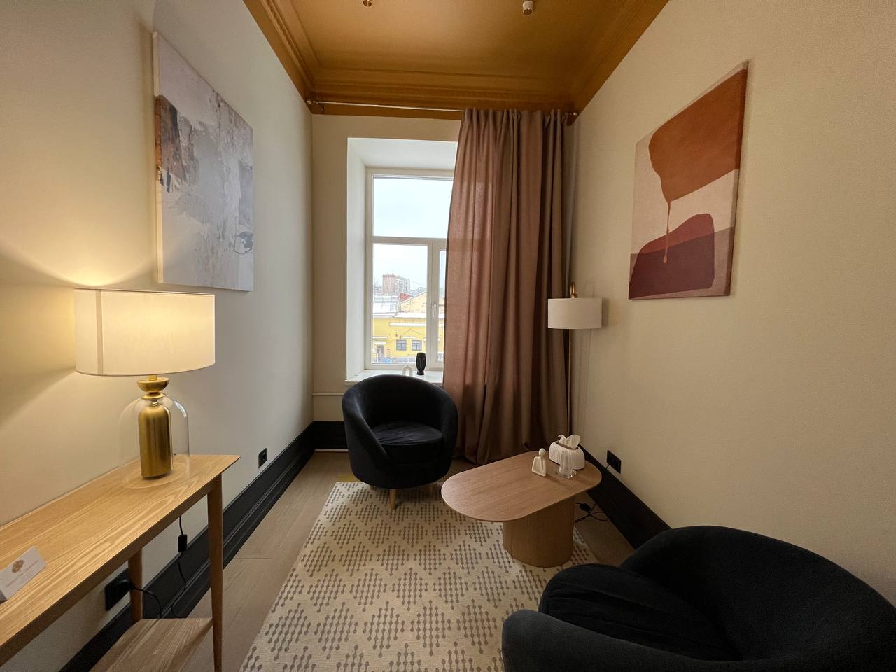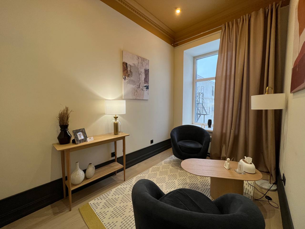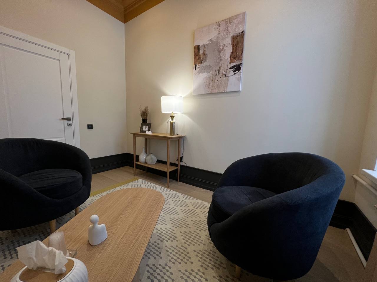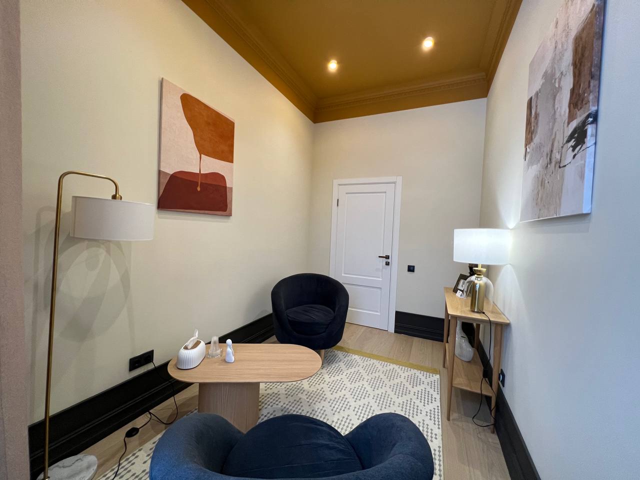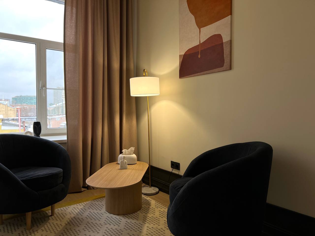 В кабинете 2 уютных кресла, журнальный столик, торшер. Общая цветовая гамма выдержана в постельных тонах, с элементами дерева, что создает спокойную атмосферу и делает кабинет максимально комфортным.