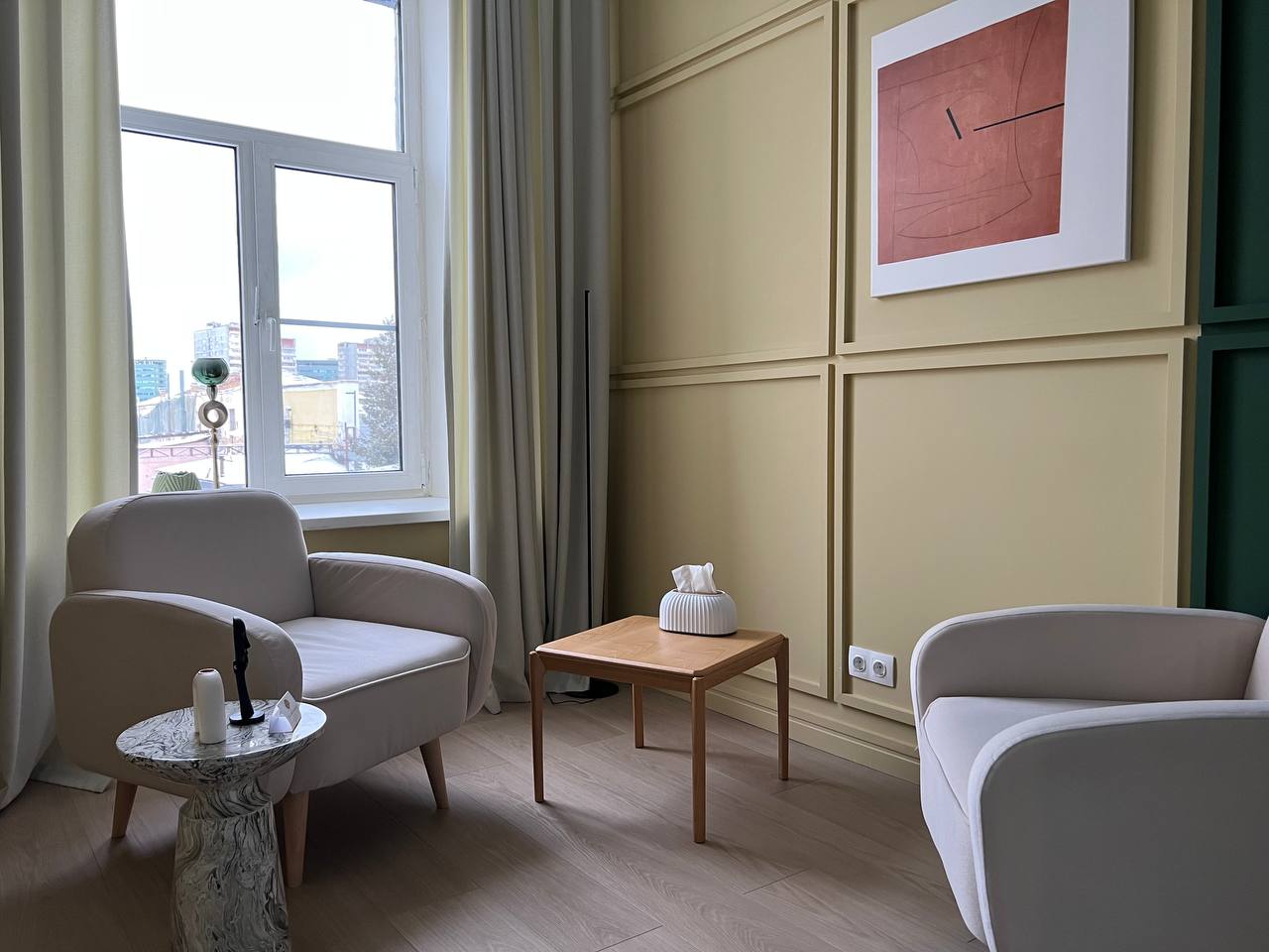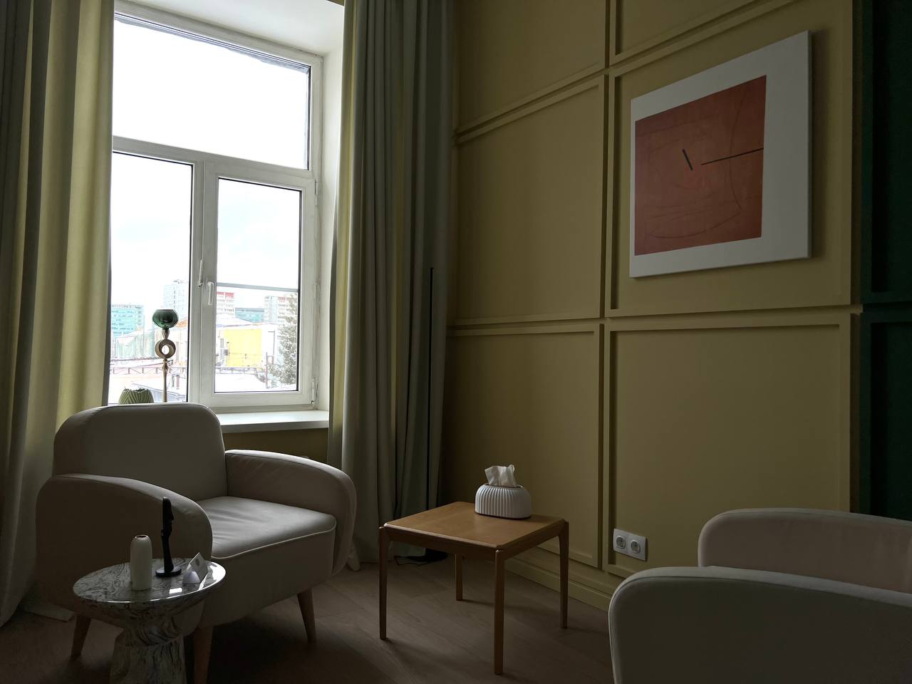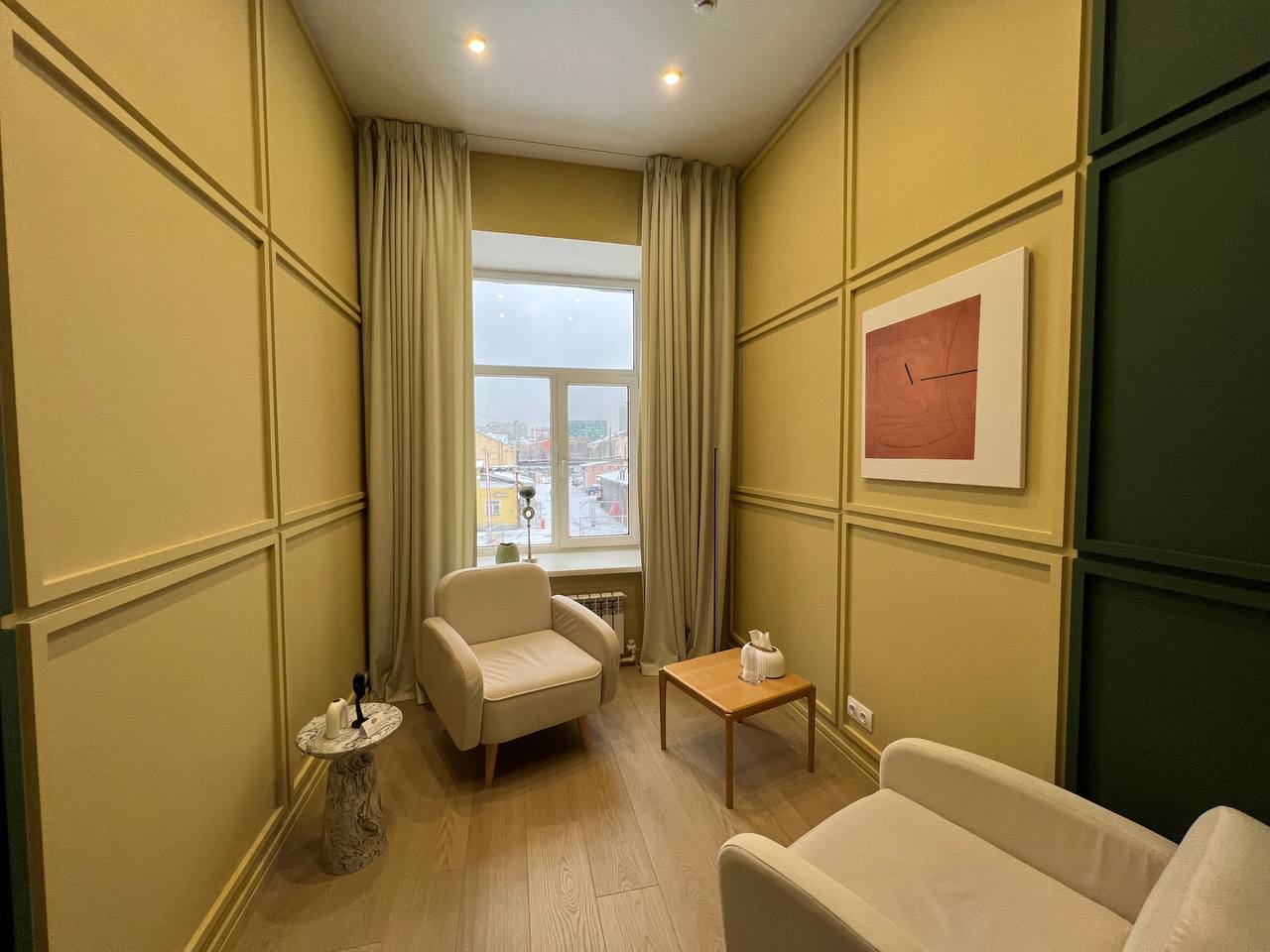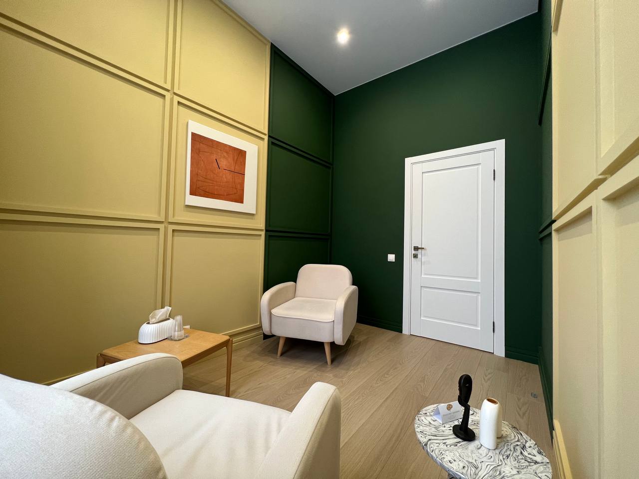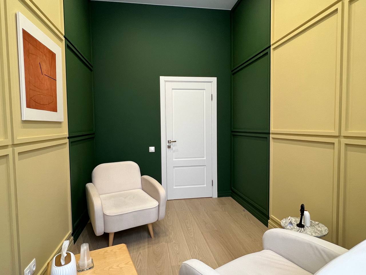 В кабинете 2а удобных, уютных кресла, журнальный столик, торшер. Общая цветовая гамма выдержана в спокойных мягких тонах, что делает кабинет уютным и комфортным.