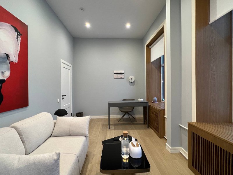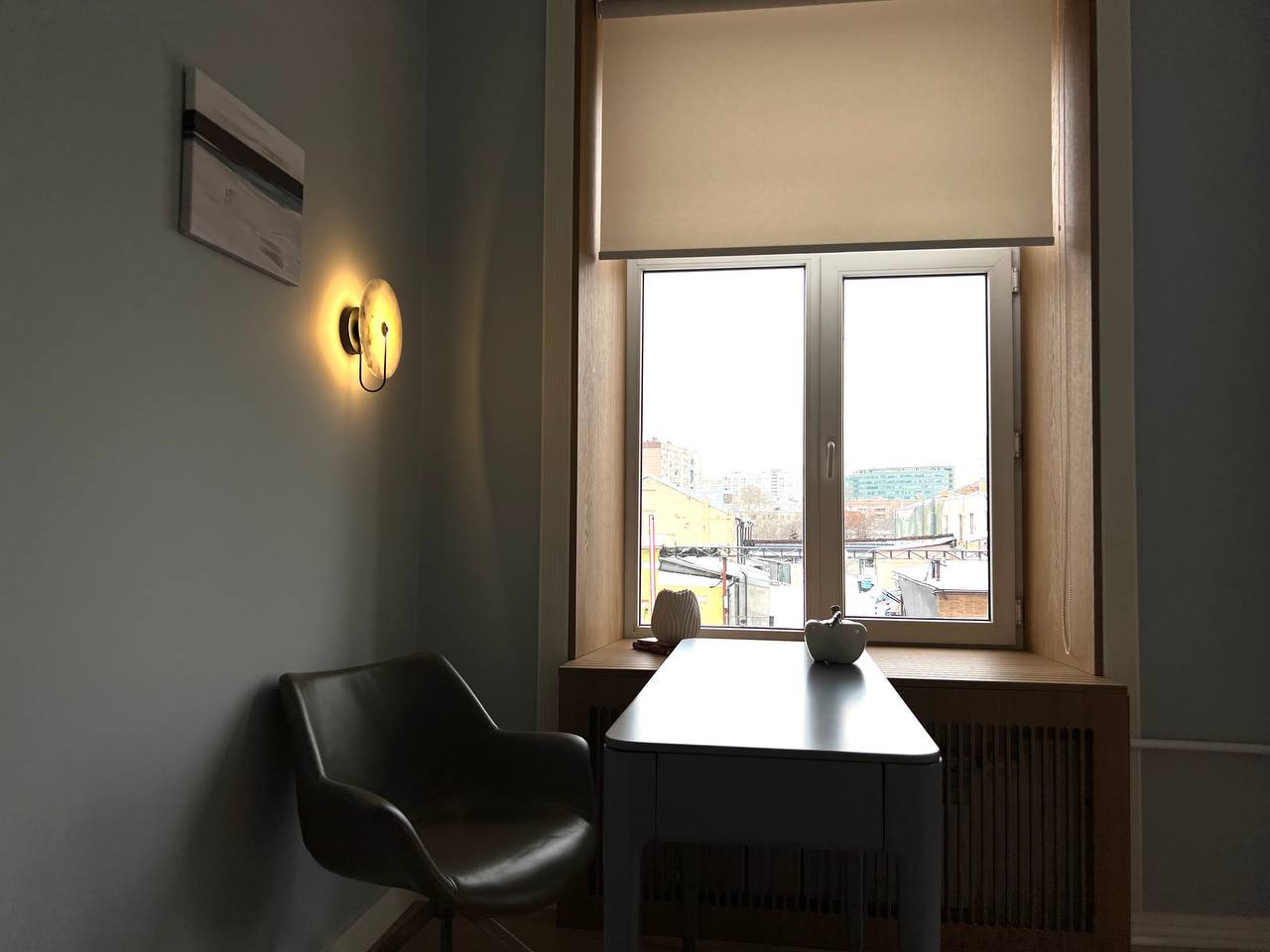 Строгий стиль настраивает на рабочий лад, рабочее место позволяет проводить консультации онлайн или поработать за компьютером в спокойной обстановке.