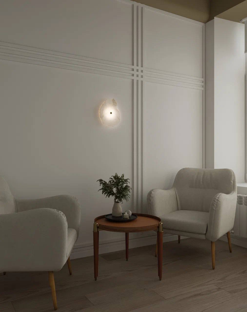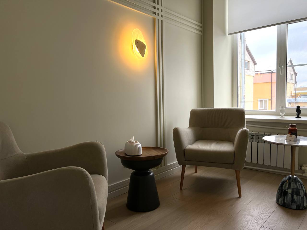В кабинете 2а удобных, уютных кресла, журнальный столик. Общая цветовая гамма выдержана в светлых тонах.