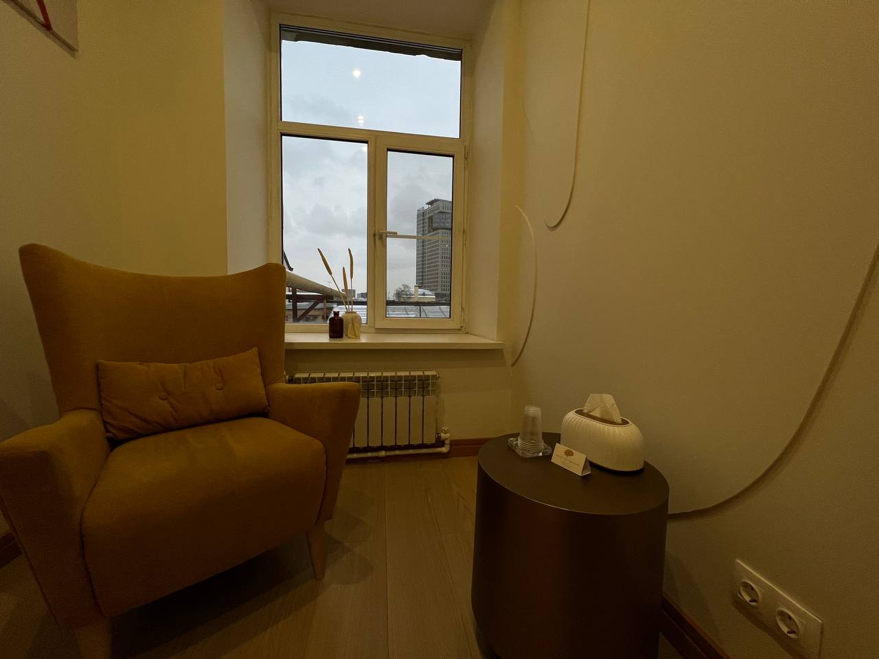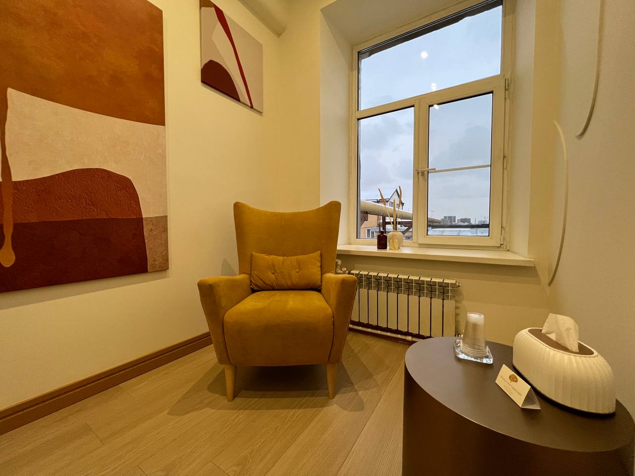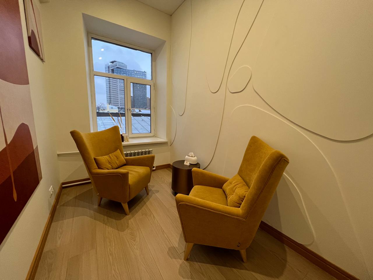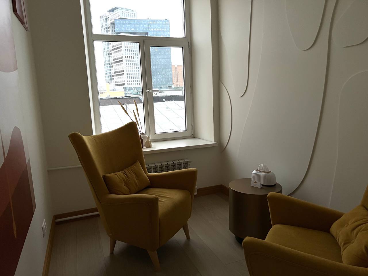 В кабинете 2а удобных, уютных кресла, журнальный столик. Общая цветовая гамма выдержана в светлых тонах.