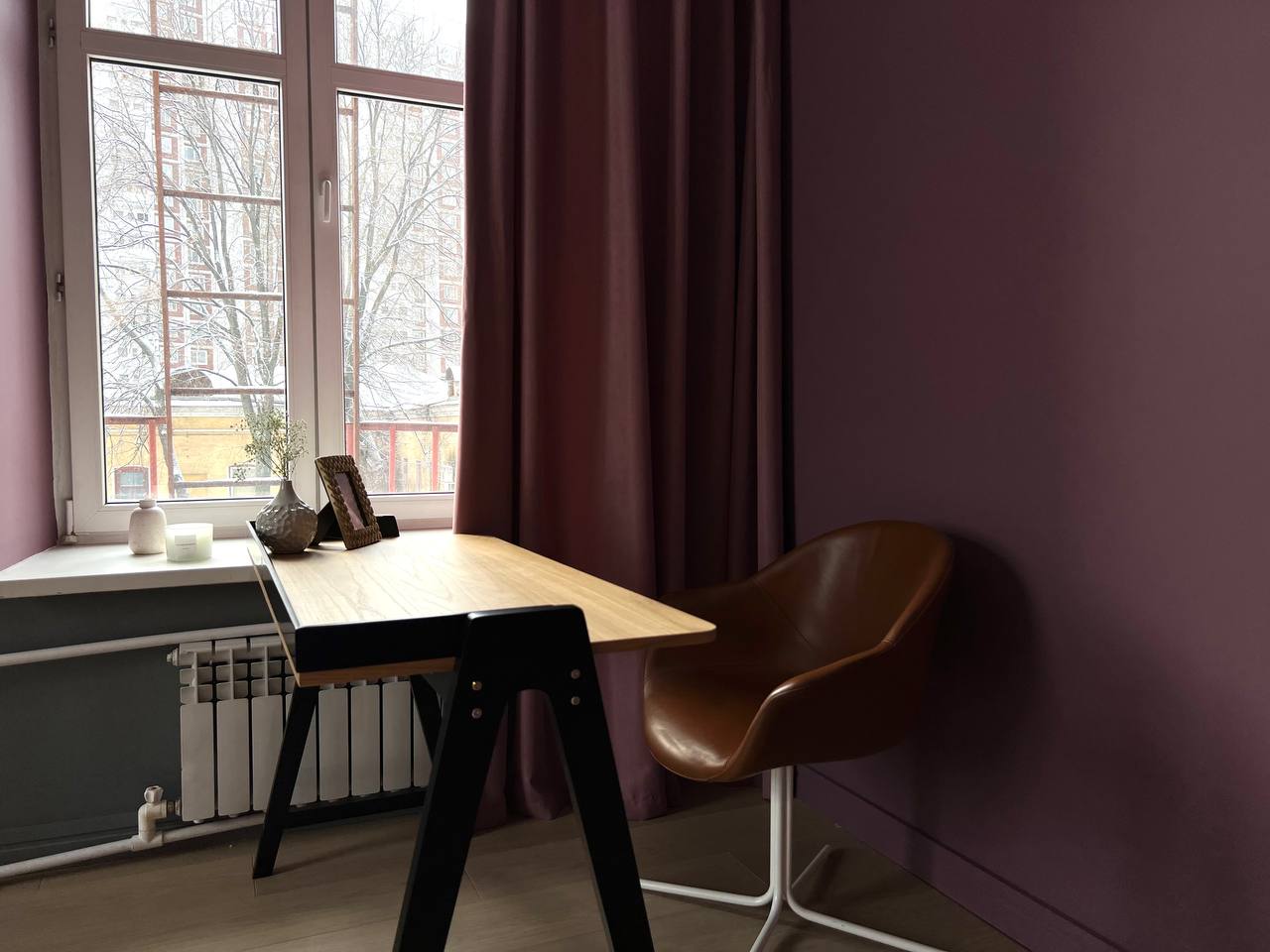 Кабинет оснащён удобным креслом, стильным диваном, журнальным столиком, и рабочим местом (стол и кресло). Строгий стиль настраивает на рабочий лад, рабочее место позволяет проводить консультации онлайн или поработать за компьютером в спокойной обстановке.