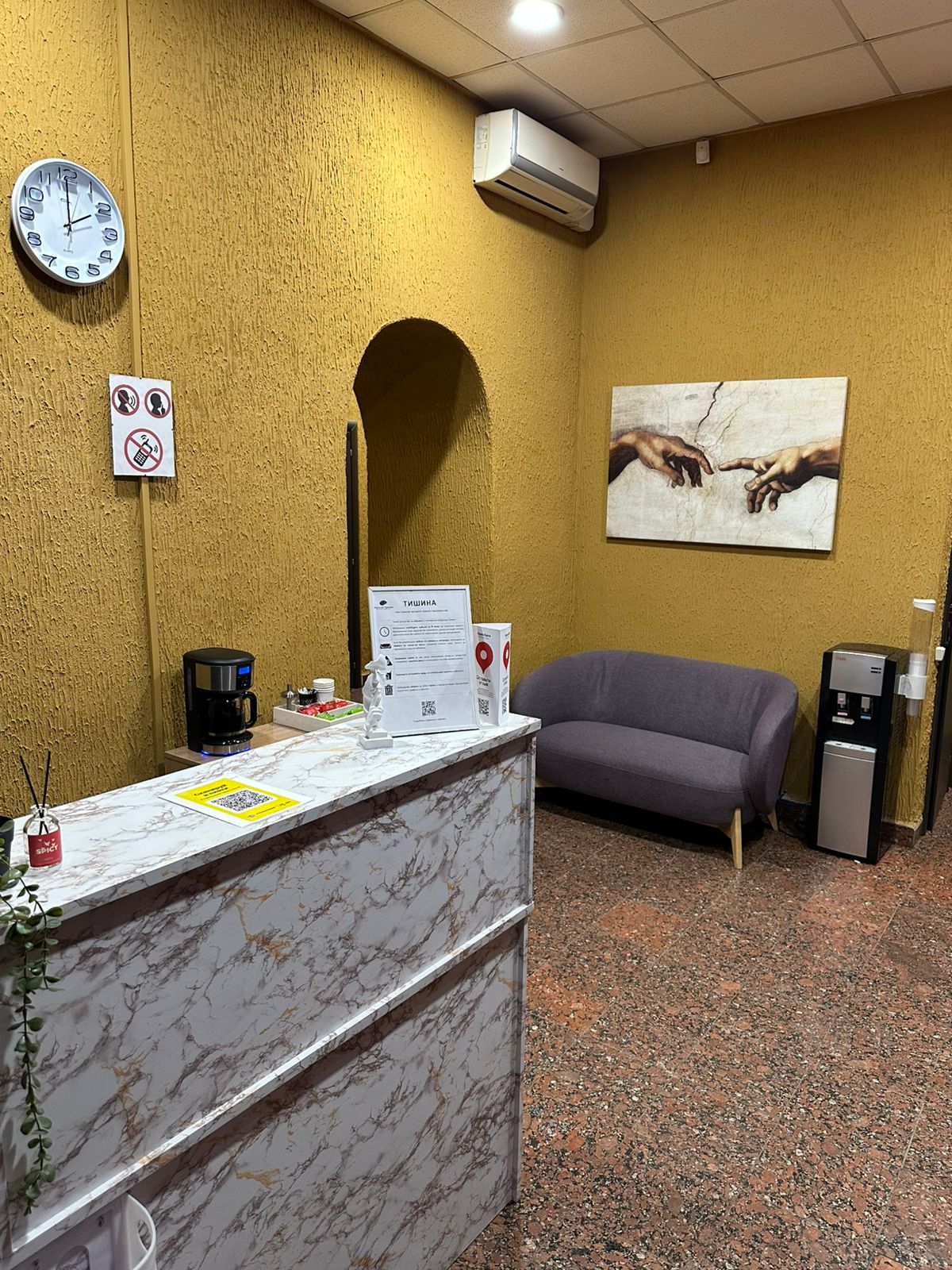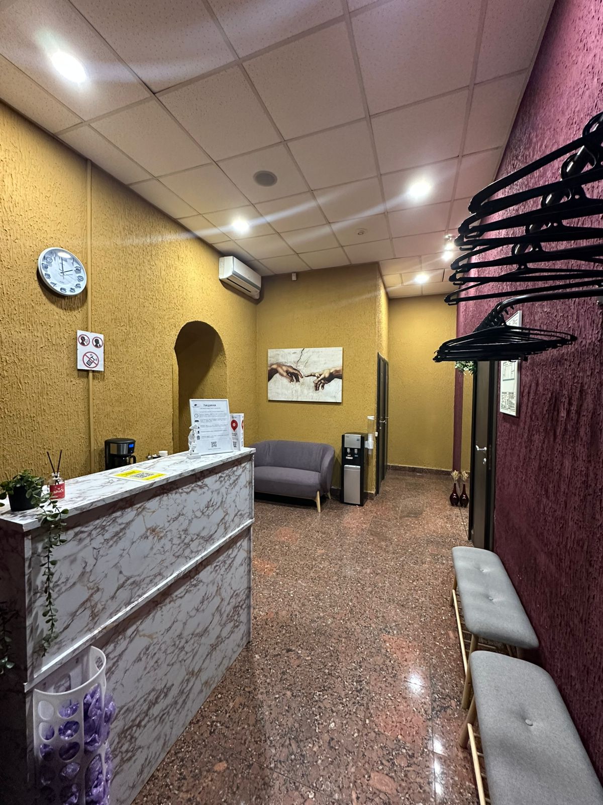 — зона ресепшен с диваном и банкетками для ожидания,